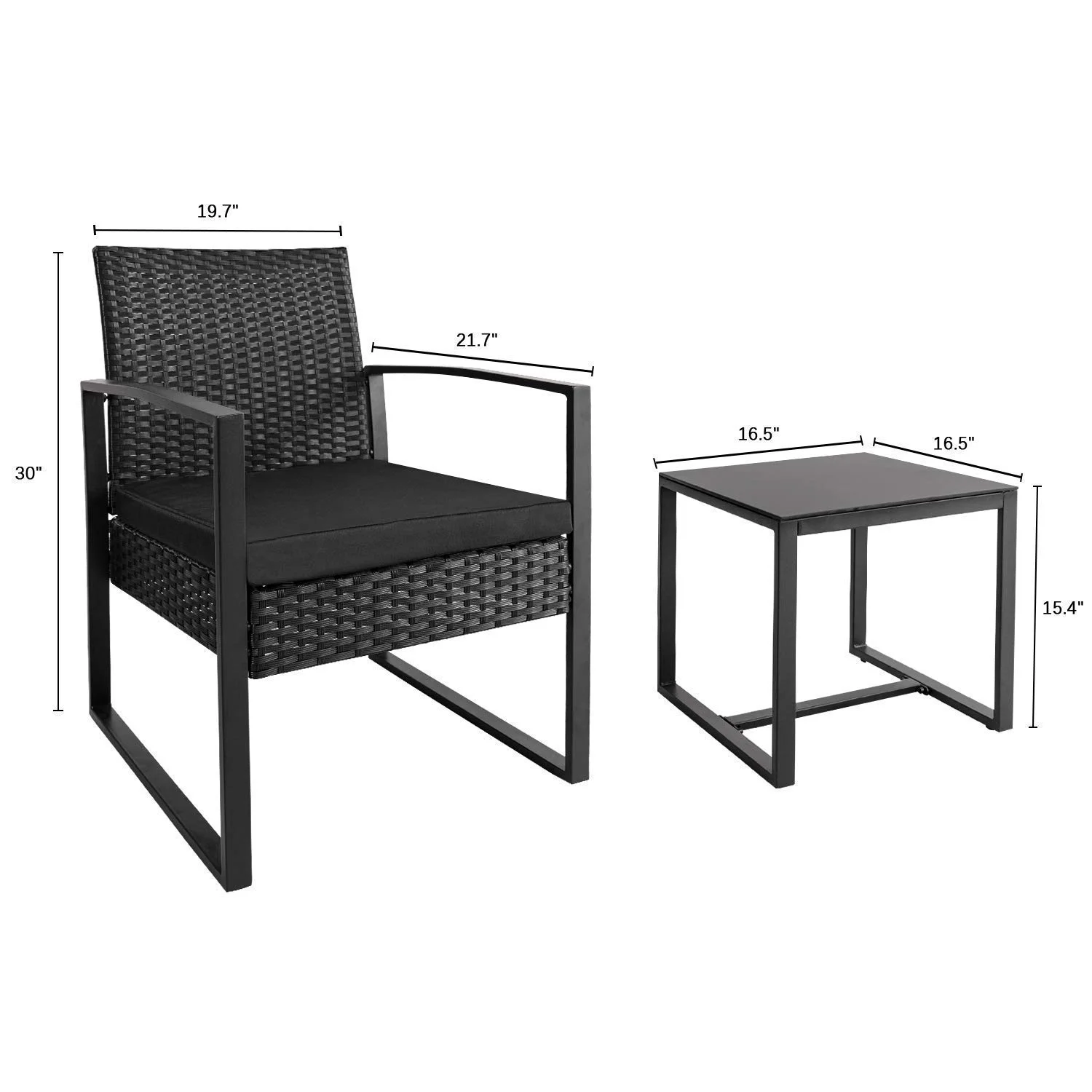 Walnew 3 Piece Patio Furniture Cushioned PE Rattan Bistro sets 3 Pieces Set Includes: 1 x coffee table, 2 x single chairs, 1 x tempered glass top, 2 x cushions Table: Removable black tempered glass top High quality steel frames with solid structure Table dimensions: 16.5″L x 16″W x 15.5″H Tempered glass top: 16.5″L x 16″W Chairs: All weather Black PE rattan wicker and strong steel frame Single Chair Dimension: 22.8″L x 21.8″W x 30″H Weight capacity: 285 lbs per chair Cushions: Black polyester fabric and sponge padded Removable cushion cover Cushion Dimension: 21″L x 21″W x 2.2″H Manufacturer’s Information: Available in multiple colors of finish and cushion Minimal assembly required 1-Year limited warranty Arrives in one box Package Dimension: 33.8″L x 22.5″W x 22.5″H For customer support, questions, and concerns, please contact Customer Service through email: [email protected]