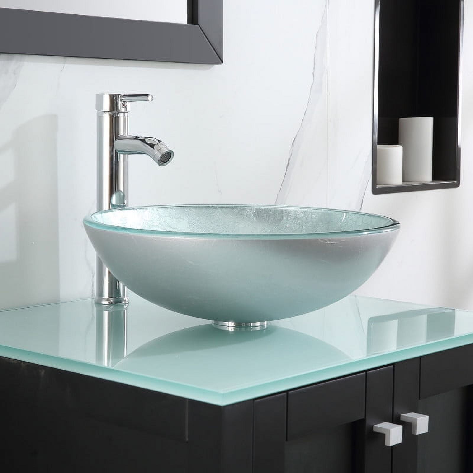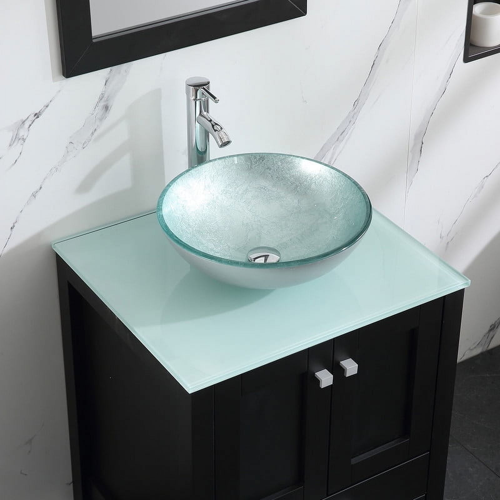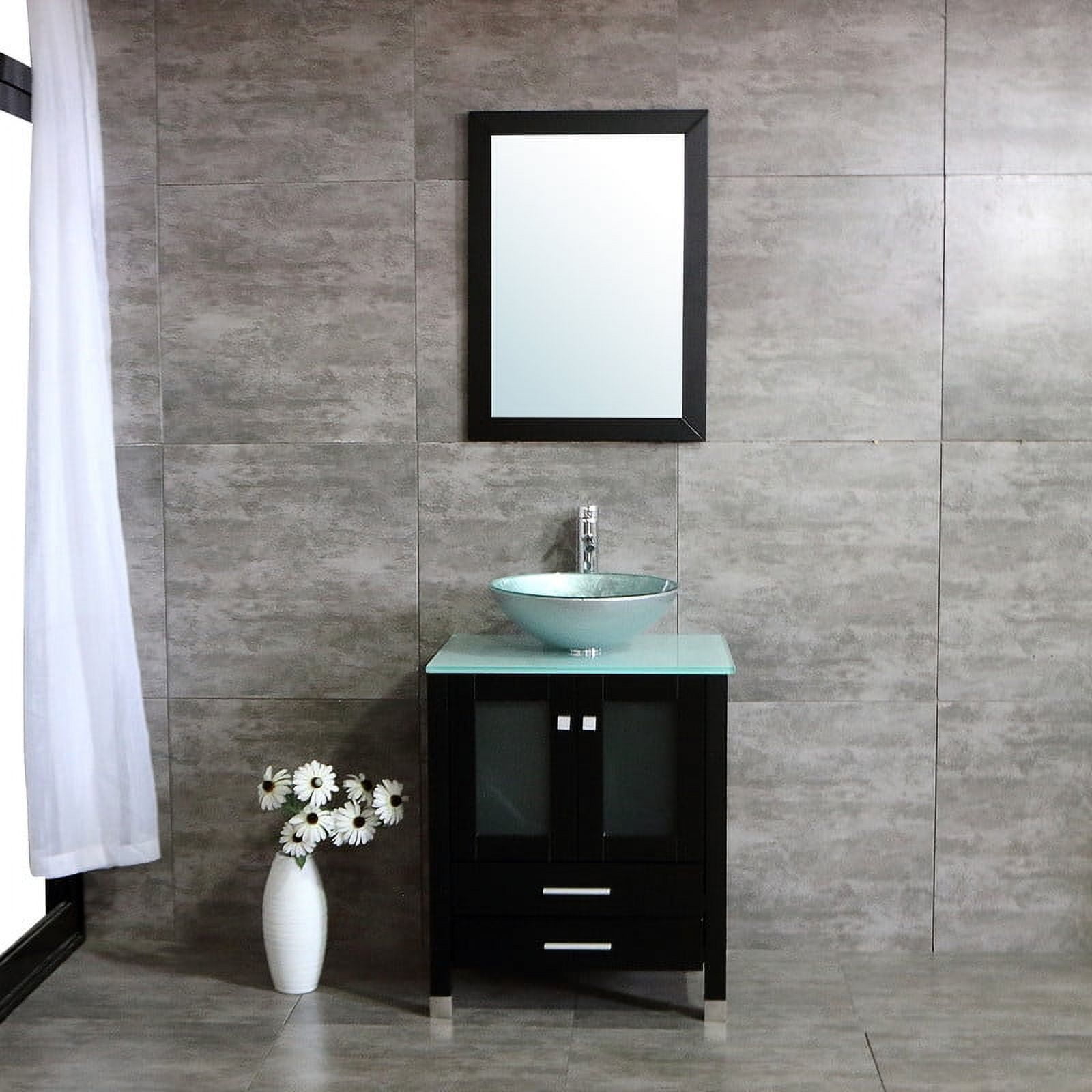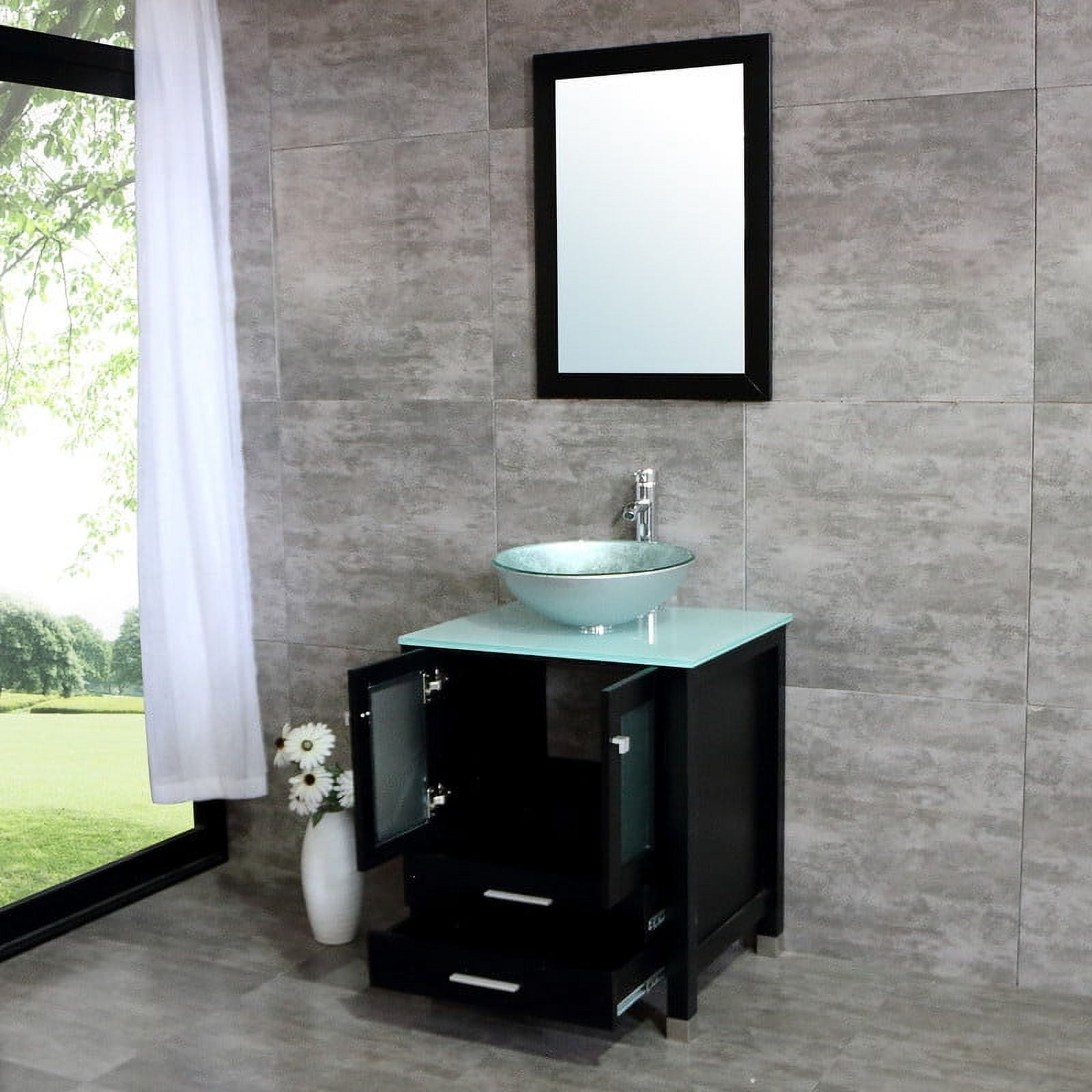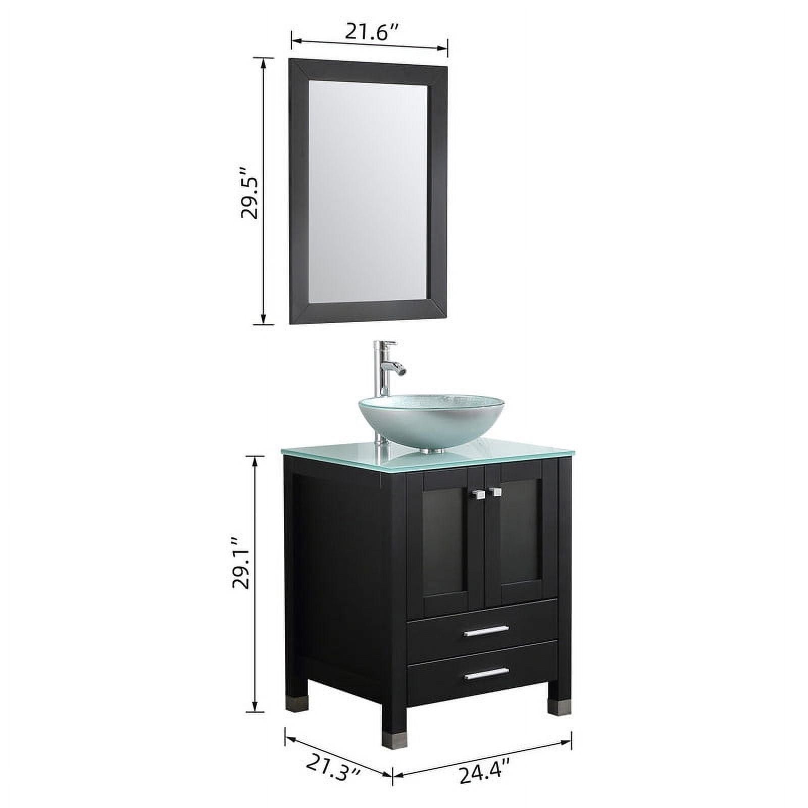 Durable and sturdy Structure: The MDF board is designed to not only withstand threats of moisture and humidity but also easy to clean and maintain. This ensures your high quality of life. Superior Stainless Steel Rail: International well-known brand DTC rail is durable and qualified for several thousand times fatigue tests. Soft-closing doors with adjustable hinges. Ample Storage Space: Two doors and 2 large drawer offer an extra big space for storage and make the room clean and tidy, providing abundant storage space for your bathroom essentials. Modern Sink and Mirror: The glass vessel sink offer long lasting use. Smooth surface is easy to clean and remove stain. The mirror uses a high-definition mirror for clear imaging. Easy to assemble: It only takes 10~30 minutes to assemble, compared to previous products with similar assembly difficulties, we have simplified the assembly process, no need to spend extra money to ask professionals to install. Some Installation Hardware Vanity Color: Black Vanity Size: 24.4″L X 21.3″W X 29.5″H Mirror size: 21.6″L X 29.5″H. Sink Bowl Color: Silver Faucet height: 12″ 1 x Cabinet 1 x Sink 1 x Tempered Glass Countertop 1 x Tempered Glass Vessel Sink 1 x ORB Pop-up Drain 1 x Faucet