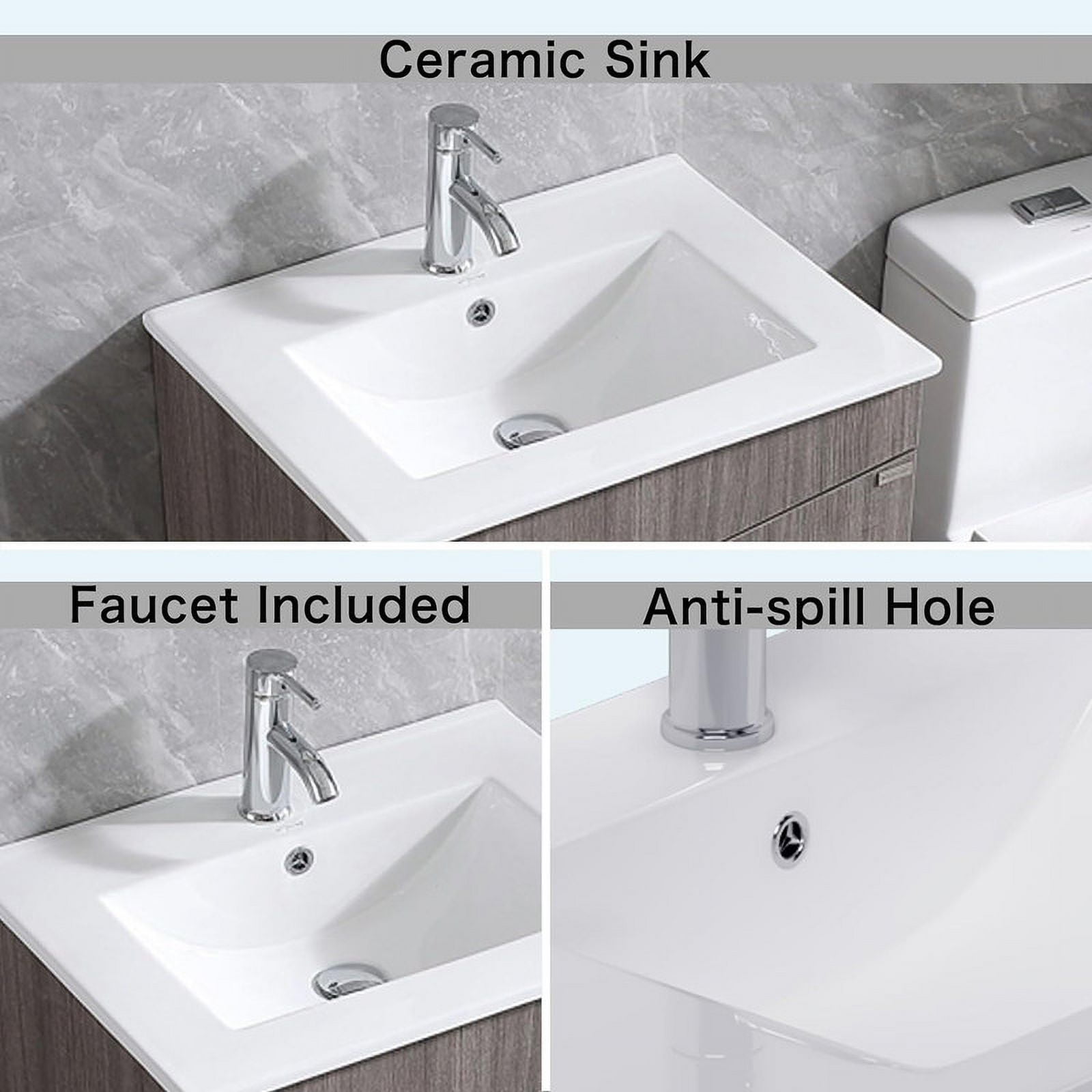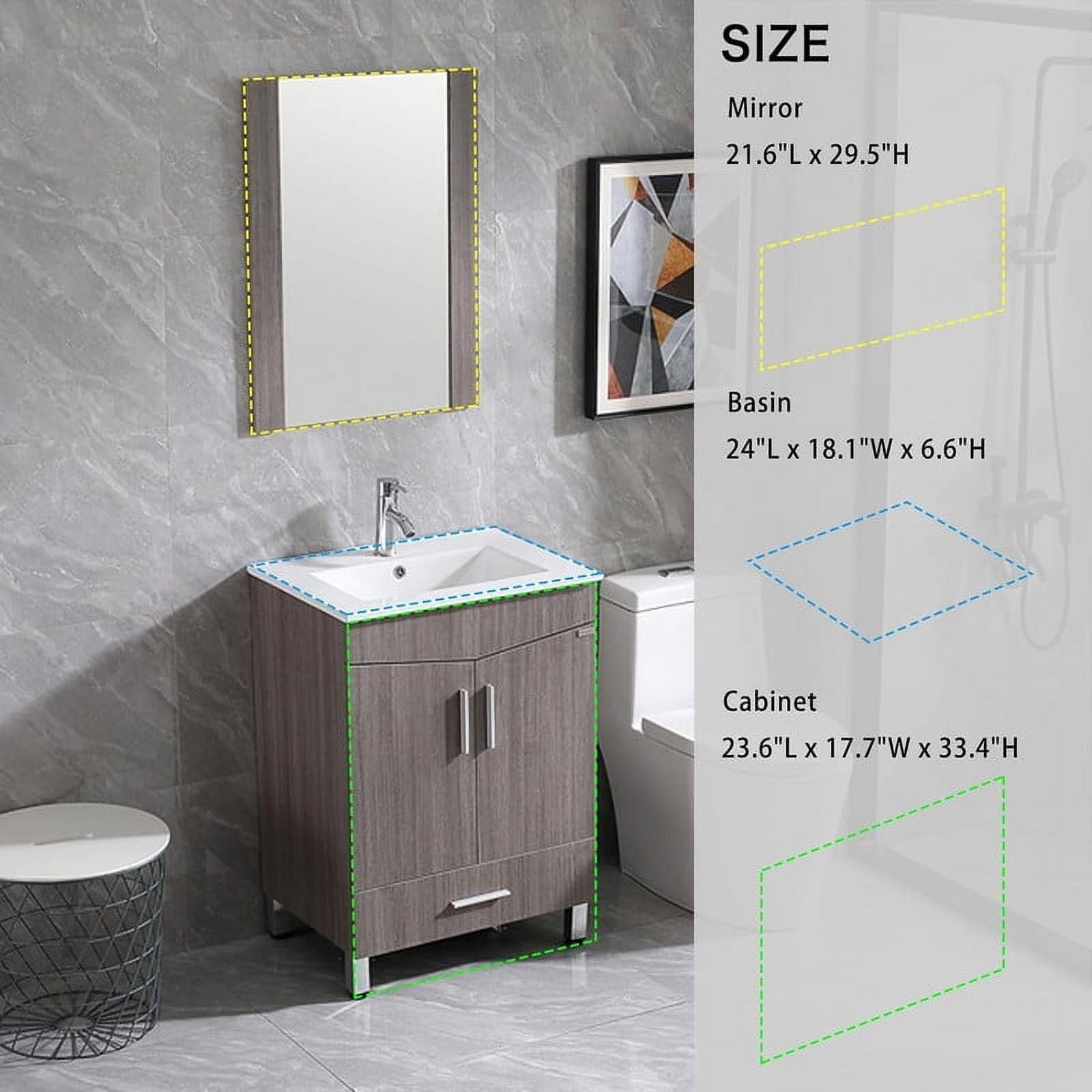Smooth Ceramic Sink Our bathroom basin sink is made of solid ceramic with smooth and water-proof finish, which hardly leaves water stains. Besides, the overflow with metal circle is in case of water spilling over when you forgot to turn off the tap. Solid Wood Board As the functional furniture in bathroom, wood as a frame makes it strong,boards are wearable and durable as well. Multi-functional Cabinet and Drawer The door of this vanity cabinet is designed as functional storage: you can store makeup and other stuff. Besides, the lower big drawer can be divided into different parts by the section panel. Easy Installation Vanity Size: 23.6″L x 17.7″W x 33.4”H. Sink Size: 24″L x 18.1″W x 6.69”H. Mirror Size: 21.6″L x 29.5″H .Faucet height:8” Bathroom Vanity Set Vanity Cabinet,Mirror,Ceramic Sink,Faucet,Pop-Up Drain,Hot and Cool Water lines,Other Sink Accessories are all included.