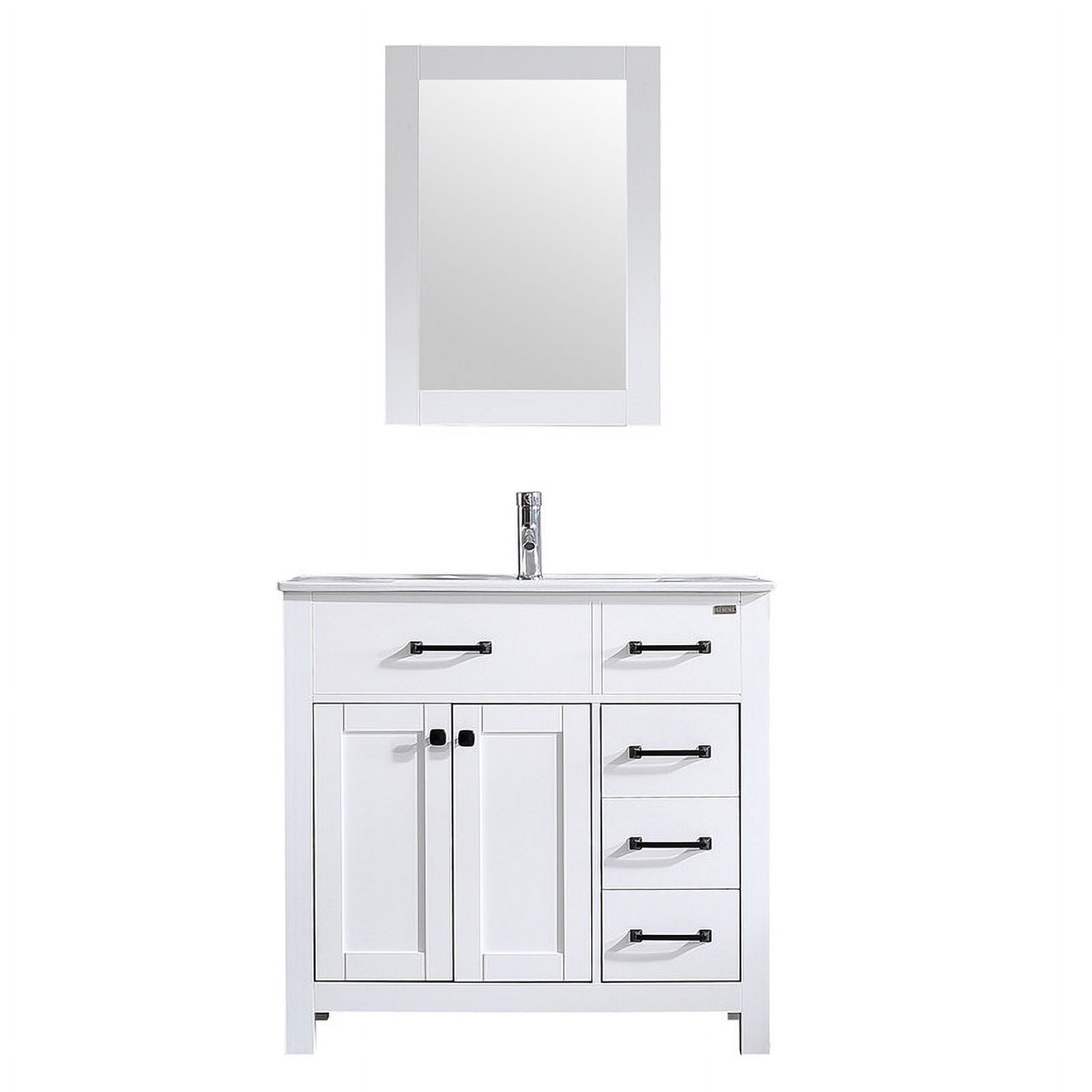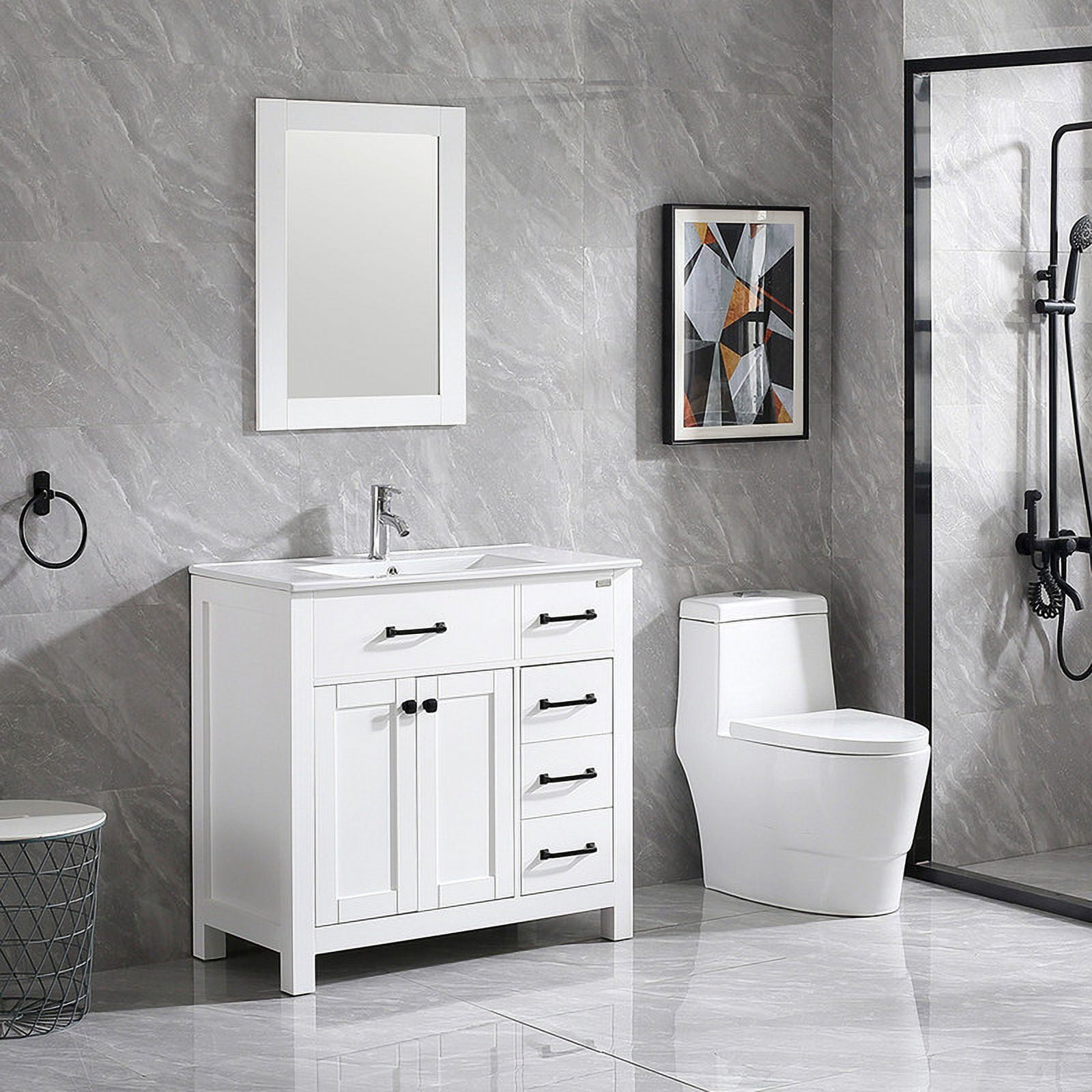 Space Saver, Perfect for Small Bathrooms This modern bathroom set needs to install and you can get it done easily following the installation instruction. As the professional vanity manufacturer, we pay more attention to product details, such as stainless steel buffer hinges, storage space, and structure. We hope you are happy with our product everyday. Its luxury design will surely brighten your bathroom and add value to your property. Product Features ????Durable and sturdy Structure The Multi-Layer Boards is designed to not only withstand threats of moisture and humidity but also easy to clean and maintain. This ensures your high quality of life. ????Superior Stainless Steel Rail International well-known brand DTC rail is durable and qualified for several thousand times fatigue tests.Stylish handles make the cabinet more modern and beautiful. ????Ample Storage Space Soft-closing doors and one drawers offers an extra big space for storage and make the room clean and tidy.Different kinds of items are stored in different 5 drawers and you could find what you need within seconds. ????Modern Sink and Mirror The ceramic vessel sink offer long lasting use. Smooth surface is easy to clean and remove stain. The mirror uses a high-definition mirror for clear imaging. ????Easy to Assemble This Small bathroom vanity with sink set comes with all necessary mounting hardware and detailed installation instructions for quick and easy installation. ????Care And Maintenance To ensure the longevity of your vanity, wipe it regularly with a dry soft cloth and avoid using cleaners that may damage the surface. Handle fragile sinks with care and avoid placing hot appliances directly on the countertop. Avoid overexposure to sunlight or excessive changes in temperature and humidity. ????Note Assembly needed. Shipped with 2 separate boxes.Please be patient and wait for all packages to arrive. Feel free to contact us whenever you encounter any problem and we will give you a reply within 24 hours. Specifications Color:White Cabinet: 35.4″L x 17.7″W x 31.5”H Mirror Size: 21.6″L x 29.5″H . Sink Size: 36.2″L x 18.1″W x 6.6”H. Material:Engineered Wood,Stainless Steel,ceramic Number of Doors: 2 Number of Drawers: 5 Finish : Painted Package Included cabinet Mirror Countertop with ceramic sink Chrome Faucet Chrome Pop-Up Drain Other Hardware