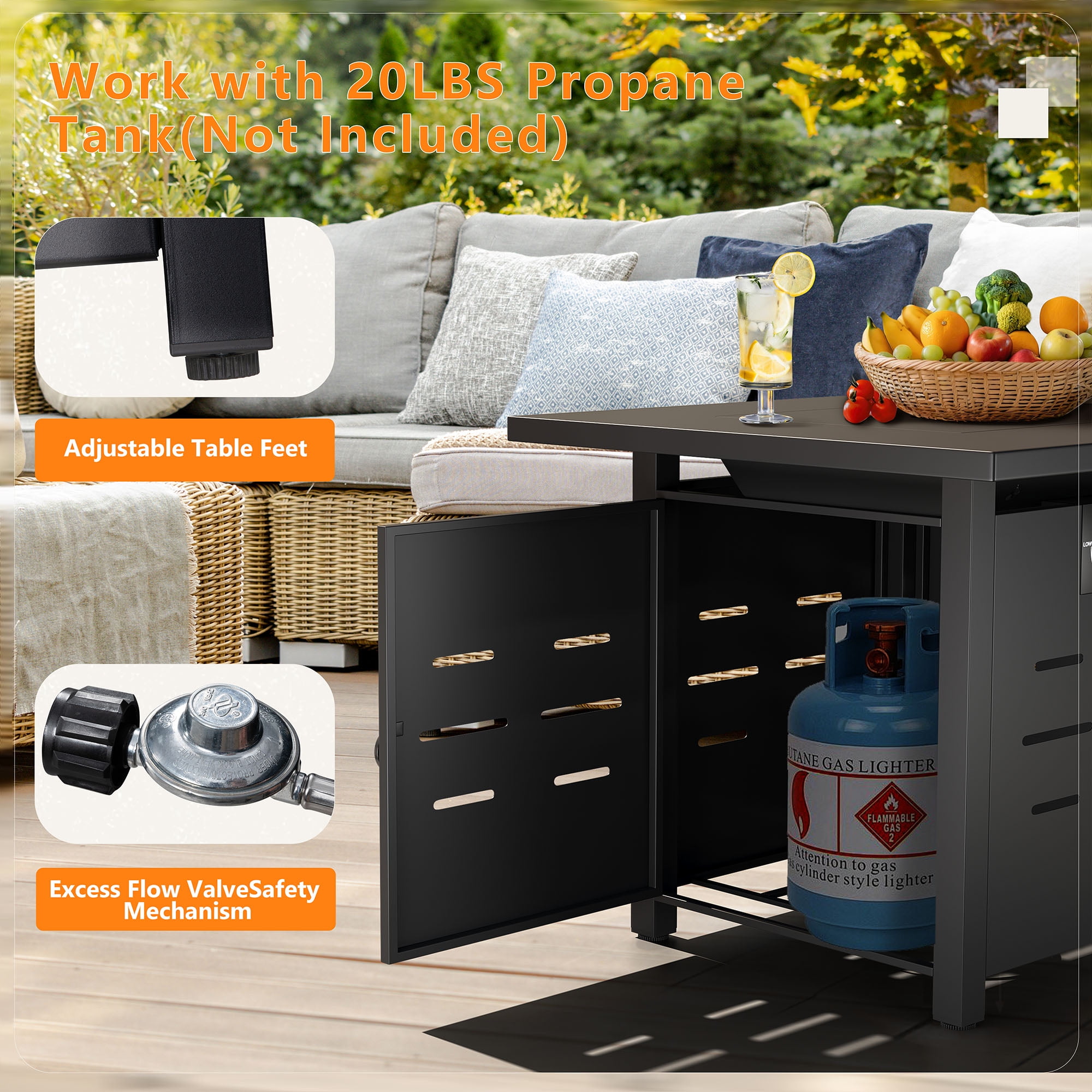 Feature: 【Perfect Patio Hangout】Whether you’re hosting an outdoor party after the summer sun has gone down, or you want to snuggle up with your family and chat into the early hours, our fire pit tables are the ultimate focal point for outdoor gatherings. 【Safe & Durable】Our propane fire pit table has safety certification to ensure it is qualified and safe to use. Made from stainless steel for a durable build that will last multiple seasons. Provide a sufficiently safe, warm, and romantic campfire atmosphere for your family and friends. 【Warm & Friendly】40000 BTU outdoor fire pits equipped with standard 20 lbs propane tank(not included). Propane fuel provides a stable, clean burn so you don’t suffer from ash and smoke. Gives plenty of warm atmosphere. 【Multi-purpose Fire Table】A 28-inch fire table is well-spaced enough to hold drinks, food, and snacks for your party or family conversation. Comes with a metal cover lid, and can be easily converted into a nice outdoor coffee table, a beauty to your outside backyard or your garden. With rain cover to avoid getting wet. 【Easy to Operate Ignition】The piezoelectric ignition on this propane fire pit table makes it easier to operate, and is more controllable than traditional pulse ignitions, you can light up the flame safely with a simple press and turn and adjust the flame to your desired temperature by turning the control button. Package Include: 1 x Fire Pit Table 1 x Removable Pit Lid 1 x Lava Rocks 1 x Assembly Instruction Specifications: Equipped with a Removable Pit Lid to protect from rain and dust. Assembled size: 27.9″L x 27.9″W x 24.8″H Package Weight: 60 lb