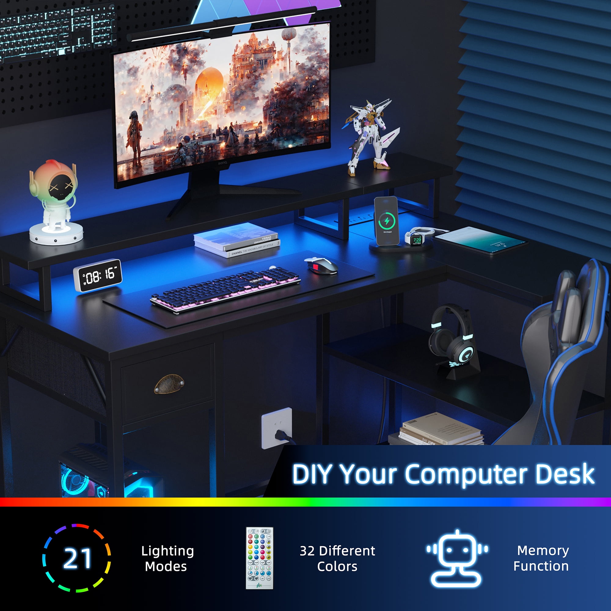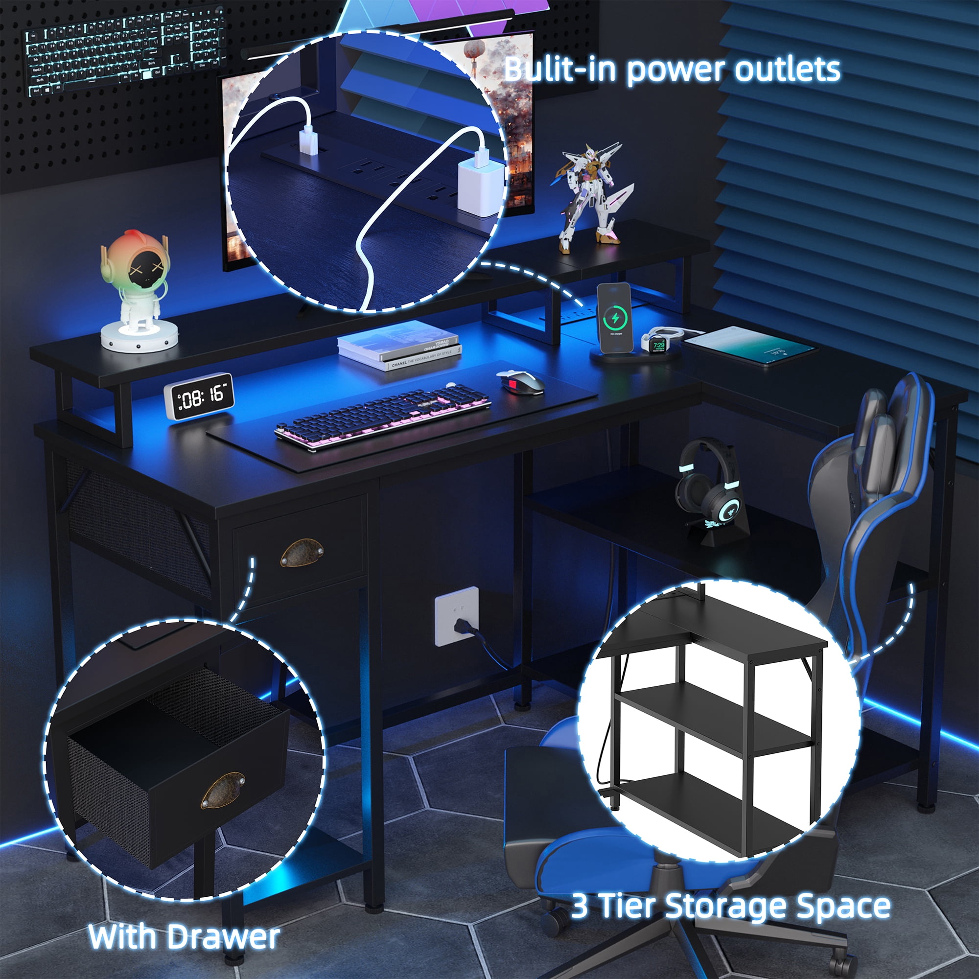 【Modern Design】Modern table design, stable structure. The L-shaped design also comes with power outlets and oversized storage space for your office needs. 【Large Storage Space】The large 3-tier storage shelves comes with a drawer to meet your storage needs in the office, whether it is to place documents and books or electronic devices, there will be more space for you to choose. 【Multifunctional LED light】It comes with a multi-function light strip with a remote control. It has 32 static colors, 36 color cycle switches, automatic cycle mode, and can adjust the brightness and speed of the light. There are also 21 dynamic modes and 8 music types. You can set time timing for the light. 【USB Charging Ports & Power Outlets】The L-shaped computer desk has 2 built-in USB charging ports and 4 sockets, which can provide fast charging for your mobile phone, Bluetooth, headset, tablet computer, mobile power supply, and game equipment, which provides great convenience for your life whether you are working or playing games. 【Sturdy & Solid Construction】This L-shaped table is quite sturdy. Durability is key to desk construction. This computer desk is made of high quality MDF and strong metal frame. Adjustable, non-slip foot pads not only protect your floor from scratches, but also ensure stability on uneven surfaces. It will not be easily damaged and can be used for a long time.
