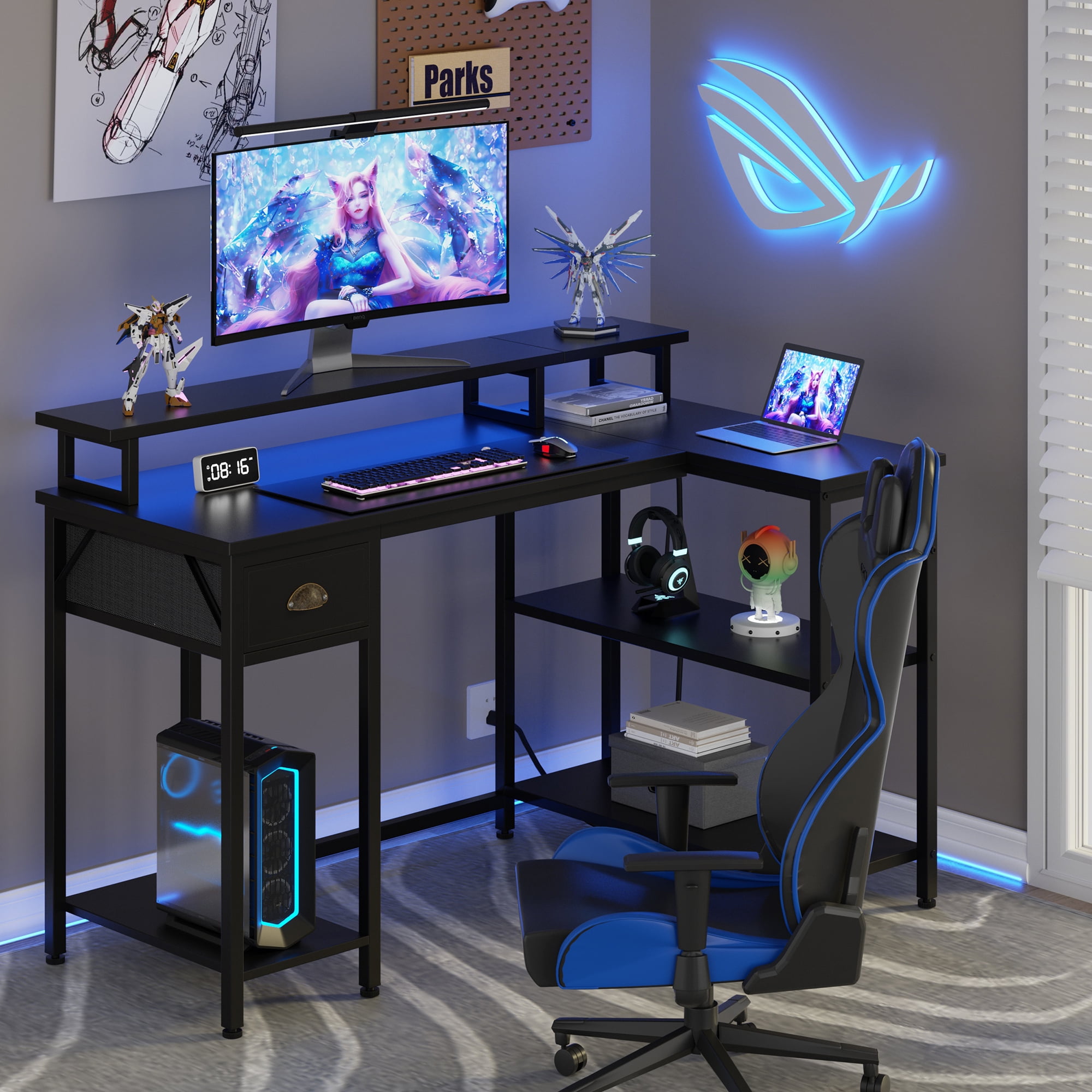 This modern L-shaped computer desk offers a stable yet stylish design, with integrated power sockets and ample storage options. Its spacious 3-tier shelves and drawers provide ample space for files, books, and electronic devices, ensuring a clutter-free workspace. Versatile LED light strips add pizzazz to your setup with multiple colors, dynamic modes, and music sync capabilities. Additionally, the desk features built-in USB charging ports and power outlets for added convenience while working or gaming. Made from high quality MDF and a sturdy metal frame with adjustable non-slip feet for durability and stability. This desk is a reliable, durable addition to your home or office.