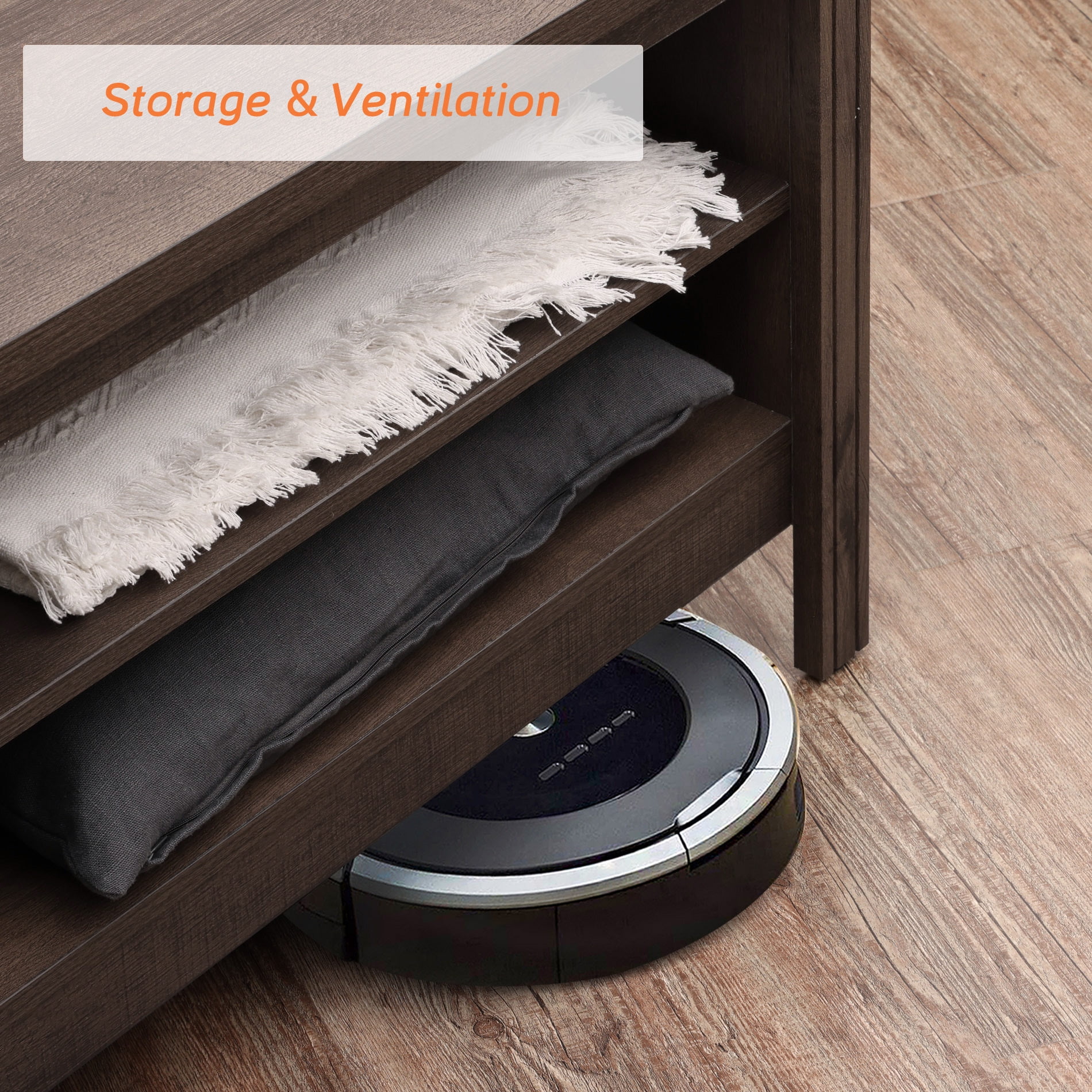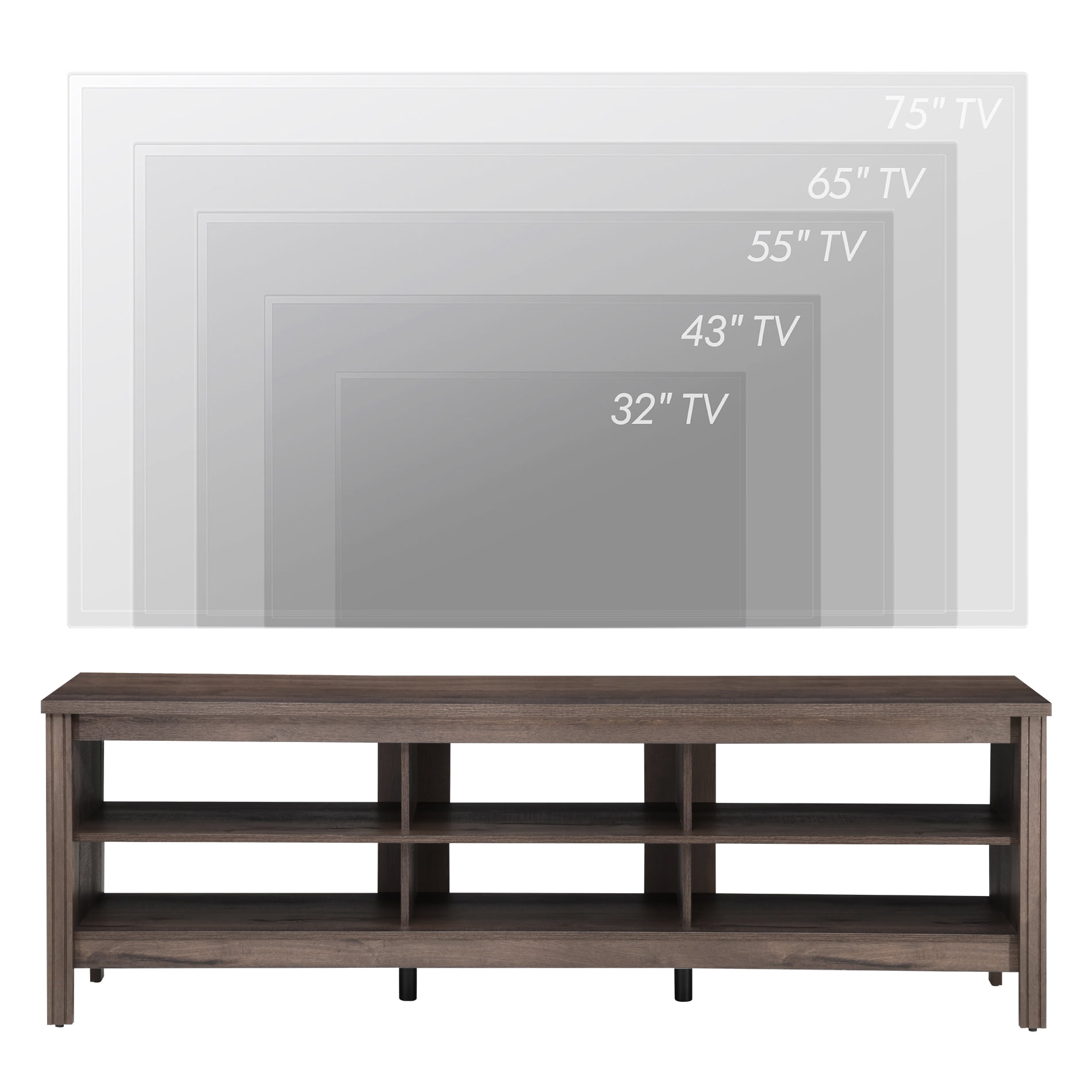 TV Cabinet / TV Table / Entertainment Center TV Unit: Farmhoues Design & Multifunction—The black wood grain and simple lines on this entertainment stand make it look classic and elegant. It can be not only used as TV stand, also perfect for sofa table, hallway Table, entry table, entertainment center, media stand, storage console table, etc. Large Capacity—This TV stand is perfect for TVs up to 75 inch TV.6 open shelves with big capacity allow you to storage the books, magazines, CDs and any other media or gaming devices. Stable Structure& Easy To Clean–Made from high-grade certified MDF for long-lasting construciton.Rich espresso wood grain finish is easy to clean.And its smooth waterproof surface is easy to clean with a soft damp cloth to facilitate your daily cleaning work. Accessible for Robot Vacuum Cleaner—The tv table is 3.9 in high height off the ground which adequate for robot vacuum cleaner can passing freely. No more headaches from dust under the cabinet. Easy to Assemble & Dimension—With detailed instructions and all hardware delivered, the wood TV stand for 75 inch TV is effortless to assemble.Dimension:70″ L * 15.5″ W * 23.6″ H.Max load capacity: 260 lbs.
