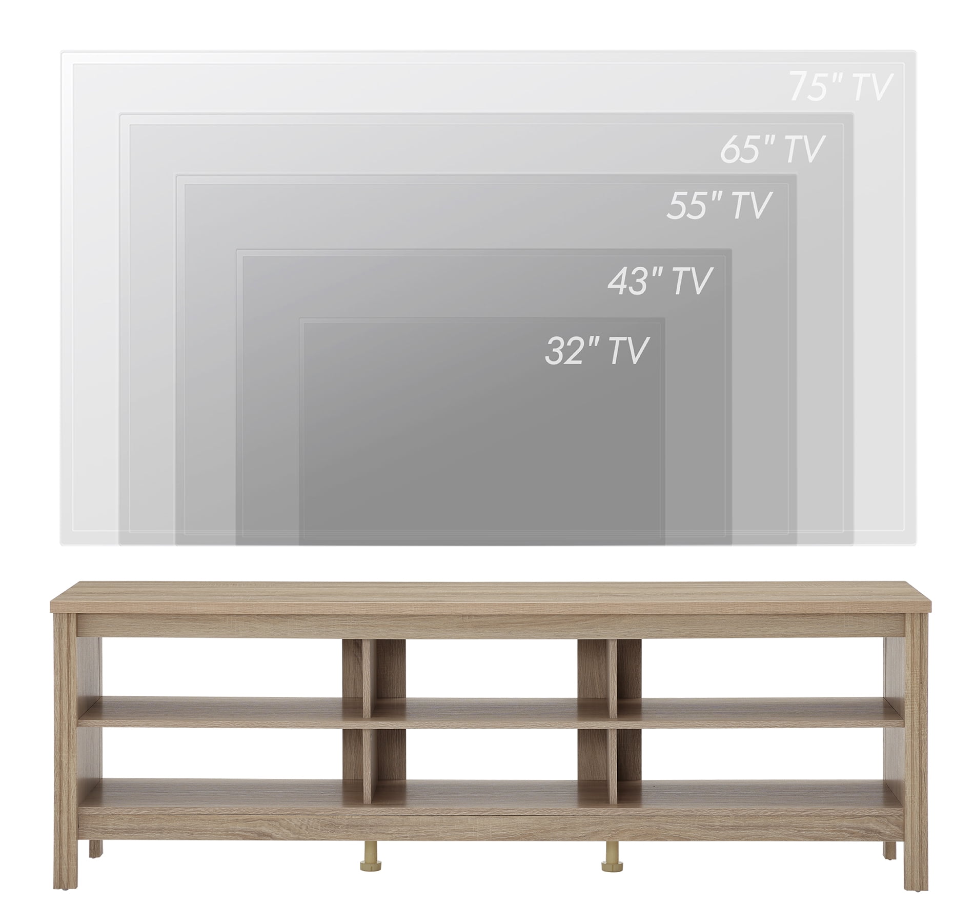 Dimension: 70″L x 15.5″W x 23.6″H. Complement a variety of contemporary decors with this sophisticated classic TV stand, perfect for the modern home. Superior Construction: Made of high quality MDF and wood material, this 70 inch TV stand features a sturdy and strong frame that boasts natural wood grain laminate, Offering long life span. Large Storage Space: The TV unit stand is perfect for 75 inch tv. And 6 open shelves with big capacity allow you to storage the books, magazines, CDs and any other media or gaming devices. It provides space for loose media accessories and a set-top box. Keeping your living room clean and tidy is the mission of our TV media cabinet. Versatile Entertainment Center: The perfect piece for living rooms, bedrooms, and lounge areas, this oak media console accommodates your entertainment essentials with ease while supporting TVs up to 75″. Easy to Assemble: The assembly of this tv console table is very simple. We provide all the required accessories and detailed instructions for the installation. Simply follow the instructions and you can quickly assemble it.