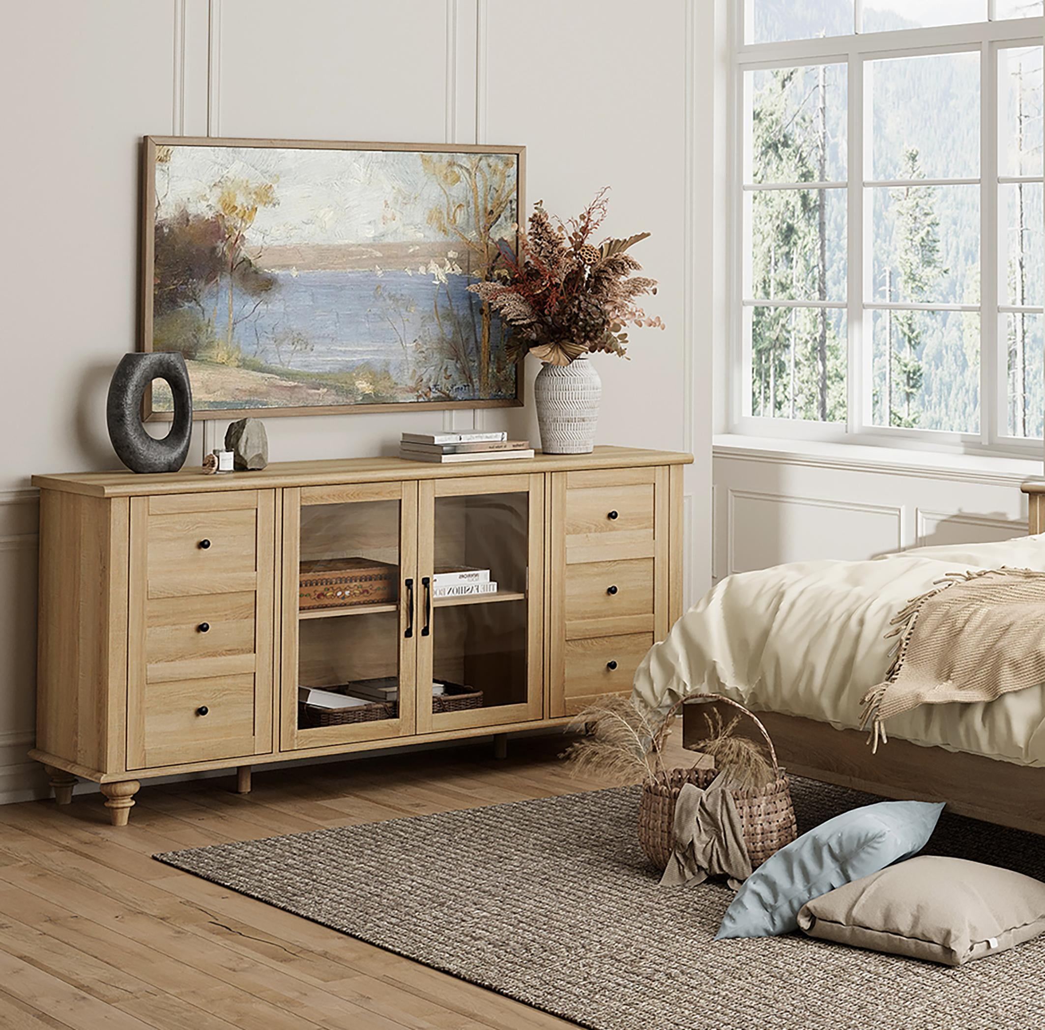Glass Door Farmhouse TV Stand for TVs Up to 75 inch, Wood Universal TV Console Table with 4 Storage Cabinets, Entertainment Center for 32-75 inch TV, 58”,Oak