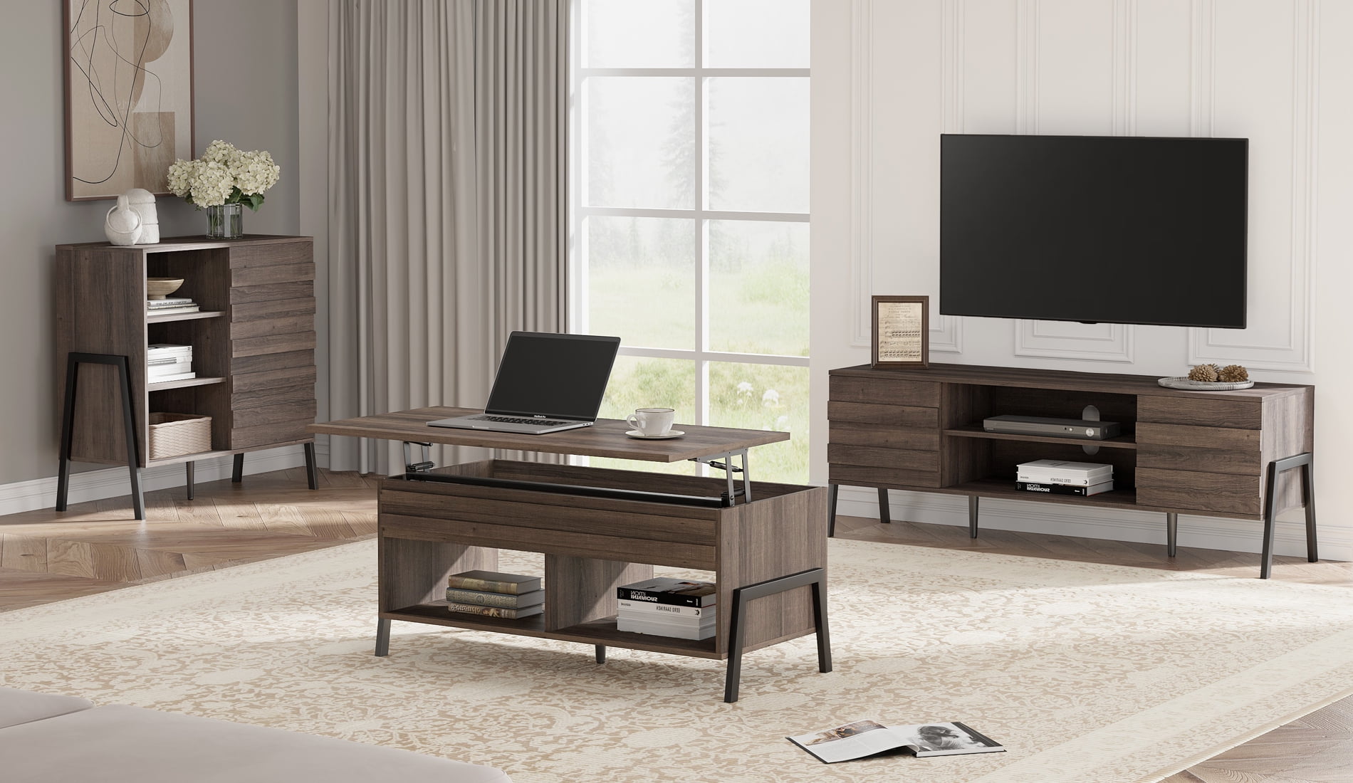 WAMPAT Mid-Century Lift Top Coffee Table for Living Room, Rising Tabletop with Storage Compartment, Brown