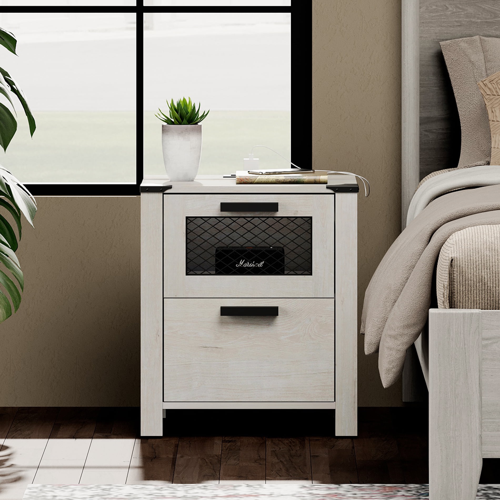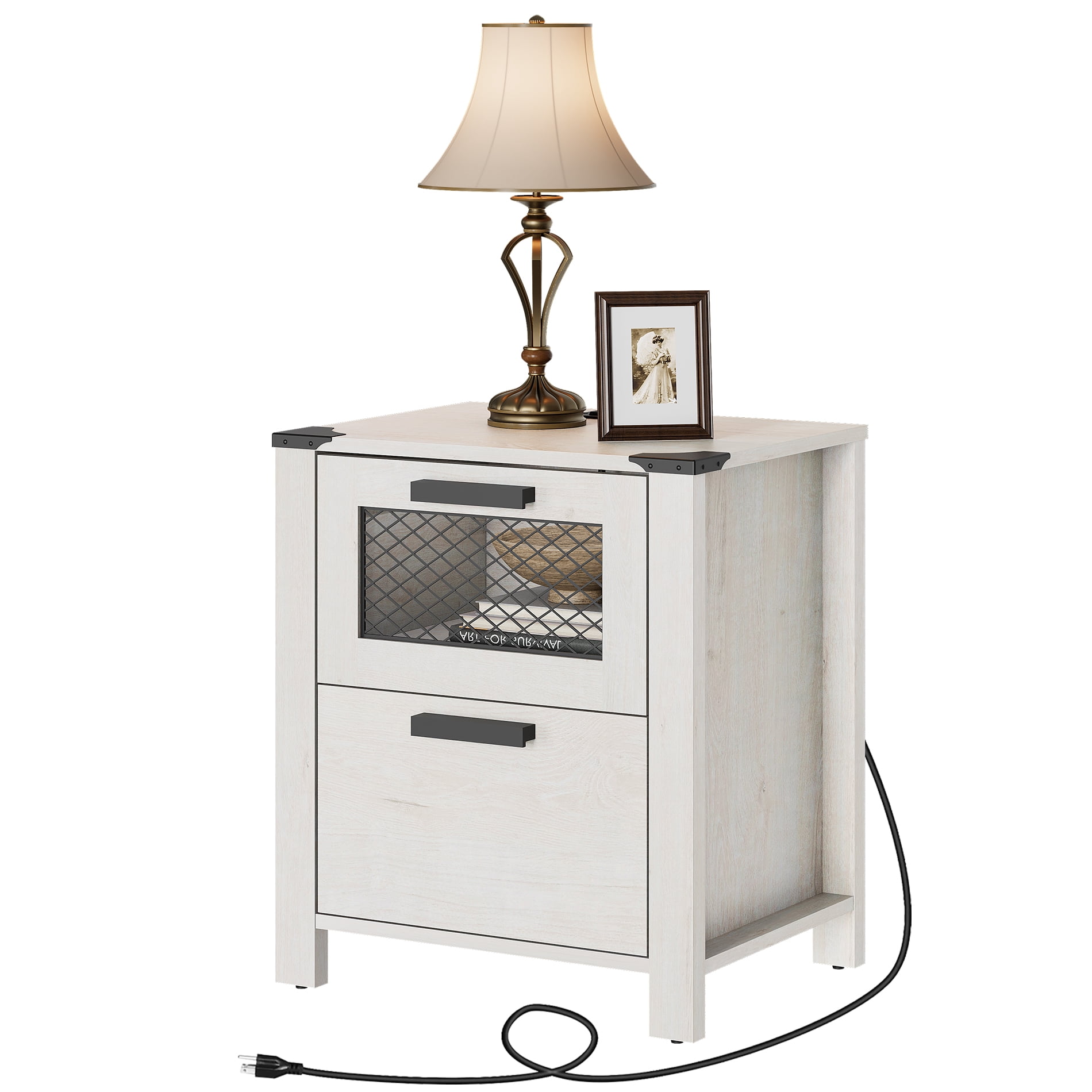 【Charging Function with USB Ports】Featured with 2 Standard Plug Outlets & 2 USB Ports, this side table is an ideal setup for charging your phones, lamps and other devices. Handy for your place as everything needed is within your arm’s reach. 【Retro Design for Universal Compatibility】Embracing a timeless retro aesthetic, the furniture piece seamlessly integrates into a broad spectrum of interior styles.The decorative metal corner and iron mesh elements, with vintage white wood grain, make this end table more industrial retro. 【Superior High Quality】Crafted from premium-grade MDF board , this exceptionally well-built furniture piece exemplifies superior quality and durability. The drawer operates on smooth, whisper-quiet glides, ensuring effortless opening and closing even when fully loaded, safe and durable. 【Ample Storage Capacity】The cabinet boasts a series of drawers, meticulously crafted to glide smoothly on robust metal runners, providing ample space for discreet organization of small items. The front of one drawer is adorned with the signature iron mesh, adding depth and texture while allowing a glimpse of the contents within, fostering a sense of curated display. 【Easy & Fast Assembly】A clear, step-by-step instruction manual accompanies the item, guiding users through each stage of assembly with concise text and intuitive illustrations.The installation of this product is a straight forward and enjoyable undertaking, thanks to its intuitive instructions, logically organized components, and ingeniously engineered design.