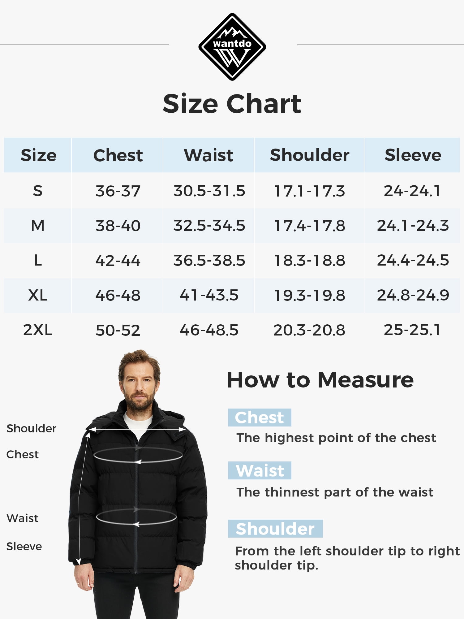 Recycled Fabric: Wantdo men’s winter coats are crafted with 150D recycled mechanical elastic fabric and recycled cotton for lasting durability. In addition, the soft lining of these jackets for men deliver cold-weather warmth without bulk. Waterproof and Warm: Our men’s puffer jacket guarantees durability and reliable with a 5000mm waterproof rating and level 4 splash protection. Stay warm and dry in damp or cold weather with our waterproof jackets for men. Windproof Designs: This men’s jacket boasts an adjustable hood. Featuring SBS zippers, our winter jackets for men ensure smooth quality. Moreover, the ribbed elastic cuffs on the sleeves of the puffer jacket hug your wrists. Functional Pockets: The men’s cozy puffy coat boasts multiple pockets, including 2 hand pockets and 1 inner pocket, providing generous storage for your essentials. Additionally, these hand pockets of this men’s jacket offer extra warmth. Stylish Choice: Wantdo men’s jackets are perfect for daily wear and styling versatility. A piece of men’s winter coat pairs well with your favorite shirt, sweater or sweatshirt, which can enhance your silhouette, visually elongating your figure. Versatile: Our men’s winter jacket is designed for an active lifestyle, seamlessly transitioning from outdoor adventures to city commuting. Plus, the coats for men make an ideal gift for special occasions such as Christmas and New Year.
