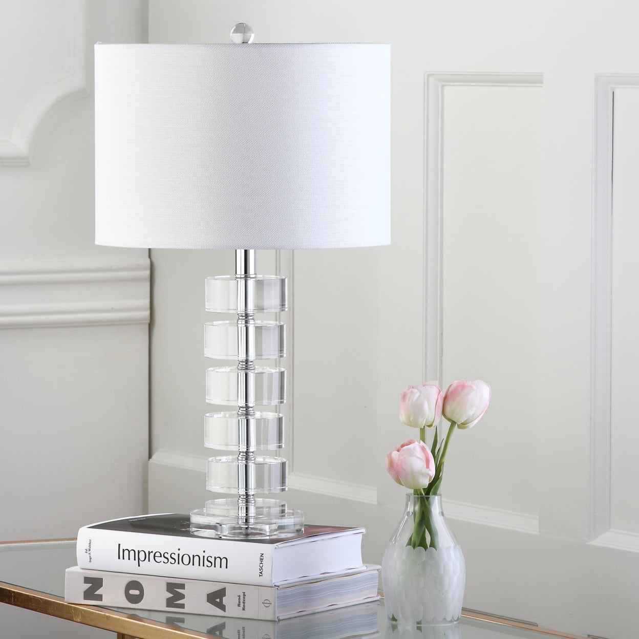 Add some elegance to your home with this ‘Hera’ shaded chromechandelier. This dynamic lighting element features generous rows ofcascading crystals to catch the light and steal the attention inany room. Enjoy the beauty of this sparkling, shaded chandelier in anyarea in your home. The unique metal-edged fabric shade filters themultidirectional, light for a warm, inviting glow. Four 40-wattbulbs produce 1,800 lumens of soft lighting, making this chandelierideal for the dining room or library. The white shade and subtlyretro styling complement any decor. Setting: Indoor Fixture finish: Chrome Material: Metal, crystal, and fabric Switch: Hardwired Number of lights: Four (4) Requires four (4) 40 watt bulbs (not included) Dimensions: 22 inches long x 16 inches wide x 56 inches tall This fixture does need to be hard wired. Professional installation is recommended. Attention California Residents: This product contains Lead, achemical known to the Sate of California to cause cancer and otherreproductive harm.