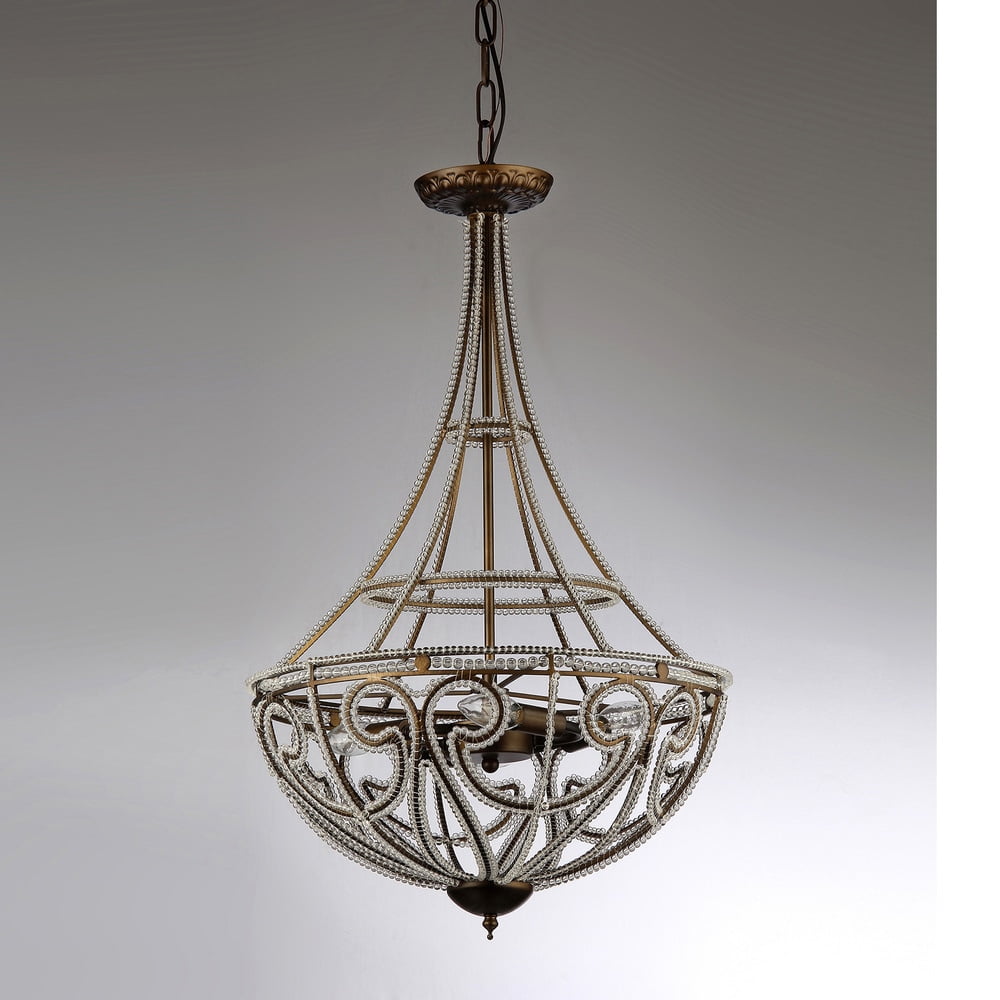 Four 60-watt bulbs light up this Roman-inspired chandelier design. The crystal beads strung along the chandelier frame add a showy touch to the fixture. Setting: Indoors Fixture finish: Antique bronze Materials: Metal, crystal Number of lights: 4 Requires: Four (4) 60-watt bulbs (bulbs not included) Dimensions: 18 inches in diameter x 28 inches high