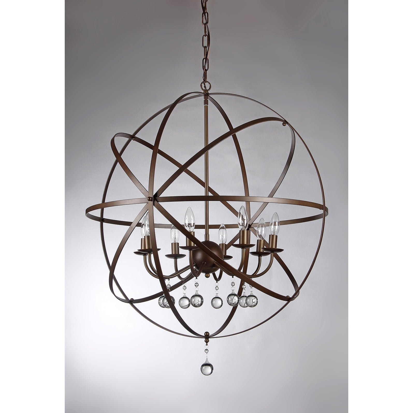 Functional and fascinating, this chandelier will add a bright and unique touch to your room. The chandelier is crafted into the shape of a globe using bands of crossing metal. An eight light candelabra hangs inside the globe. Round crystal bobbles drop from each light. A single bobble hangs from the bottom of the globe. The bronze finish and exclusive design make this chandelier striking and brilliant. Crystal chandelier Bronze chandelier 8-light chandelier Product Features: CSA Listed, ETL Listed, UL Listed Includes 36 inches of wire, 30 inches of chain Setting: Indoor Fixture finish: Bronze Shades: Metal Number of lights: Eight (8) Requires Eight (8) x 60-watt E12 bulbs (NOT INCLUDED) Line switch Dimensions: 30 inches diameter x 36 inches high Assembly required. This fixture does need to be hard wired. Professional installation is recommended.