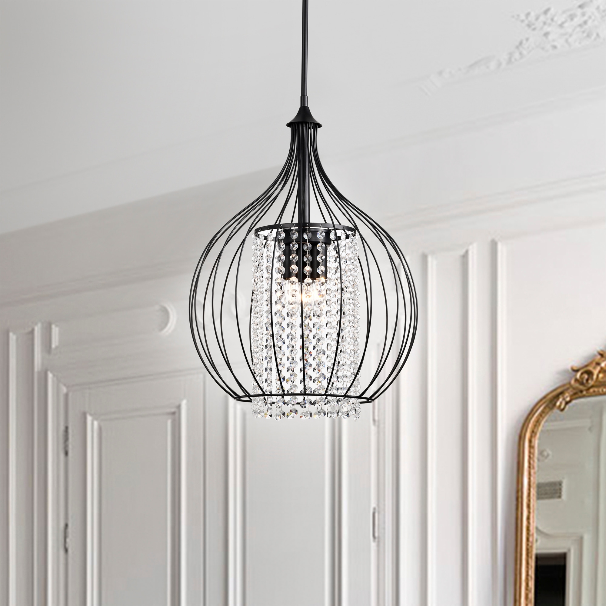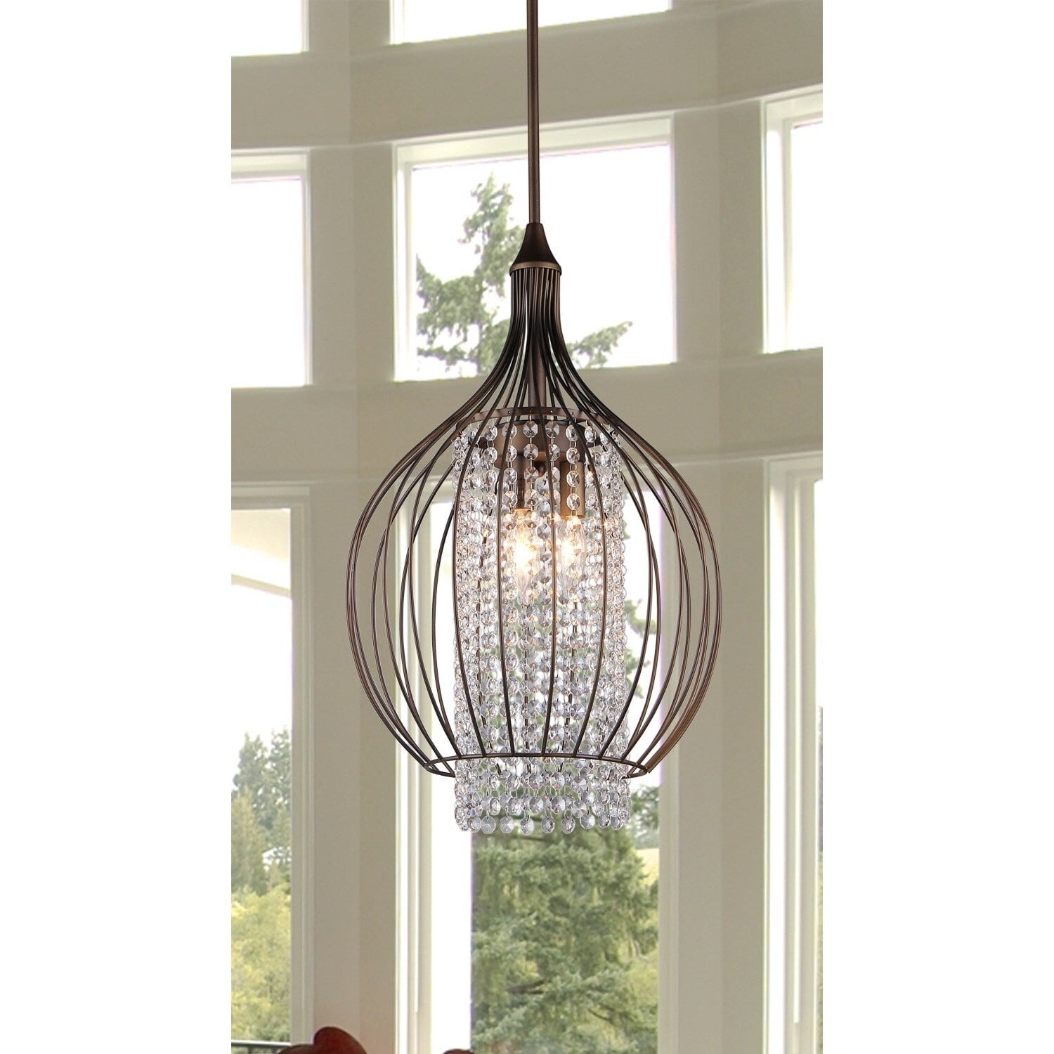 The rounded shape of the pendant and its wire design provide a lightweight look. Light easily bounces off of each dangling crystal to provide extra lighting and a hint of sophistication, ideal for elevating the appearance of your dining room. With its antique bronze finish, this chandelier infusing old-world charm, perfect for traditional-style dining rooms. Combine the two rods included with this light to create a dramatic look appropriate for high ceilings.