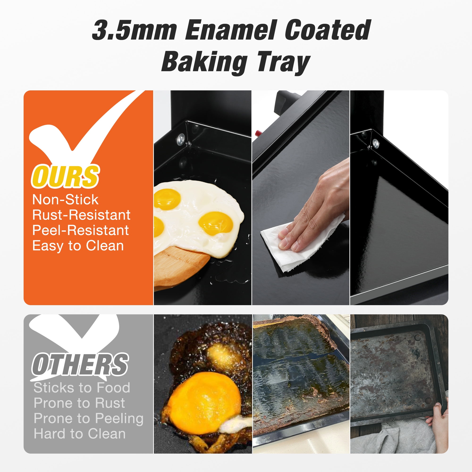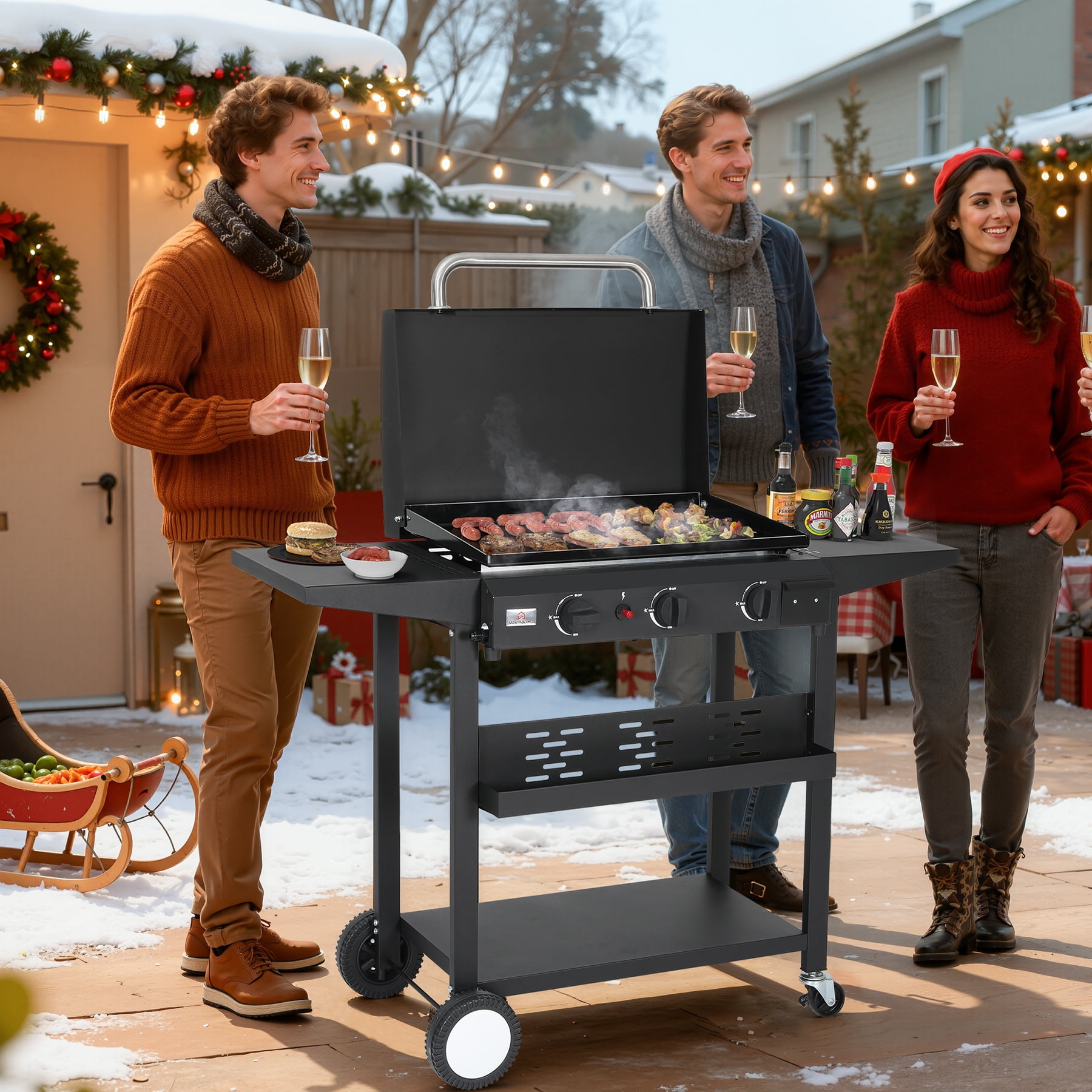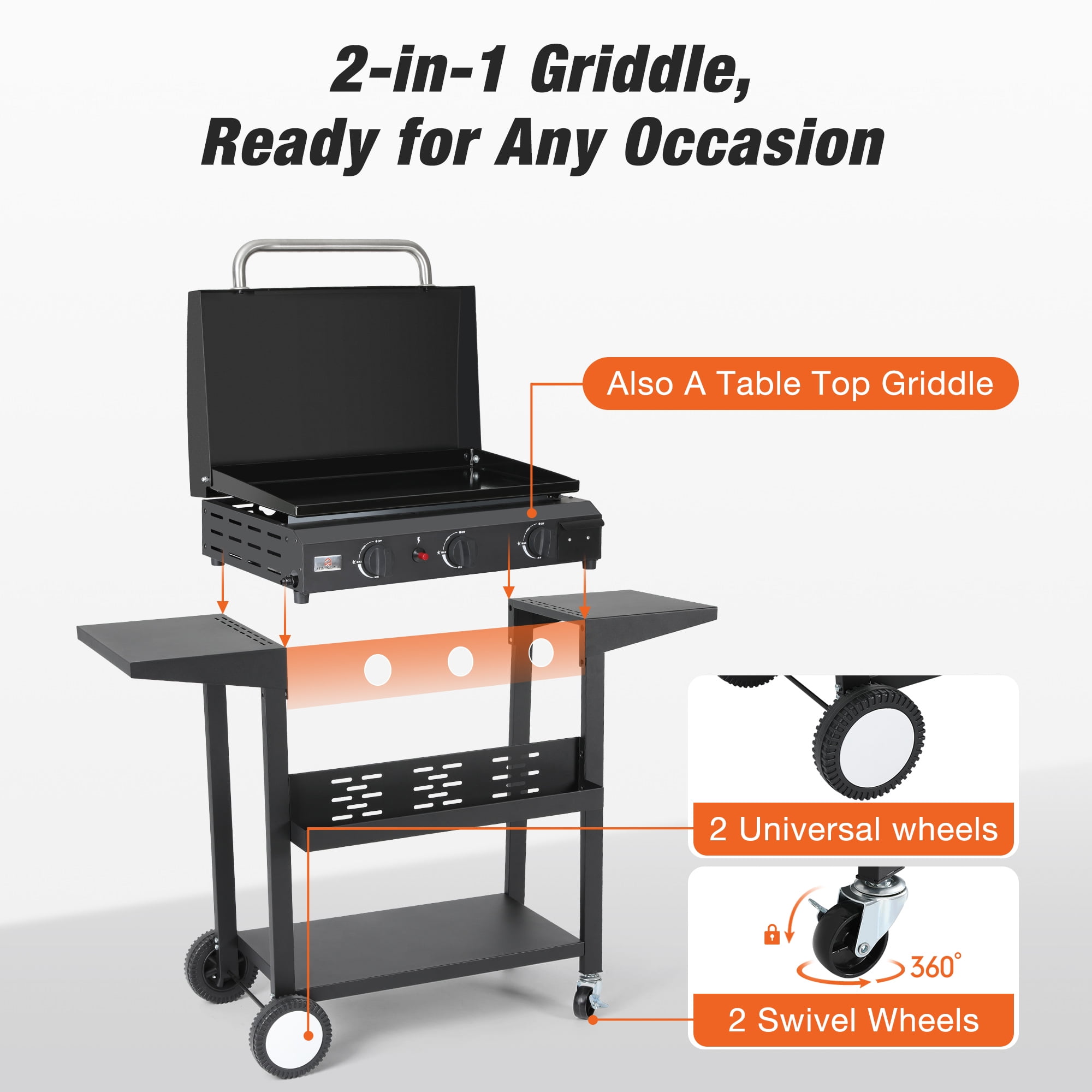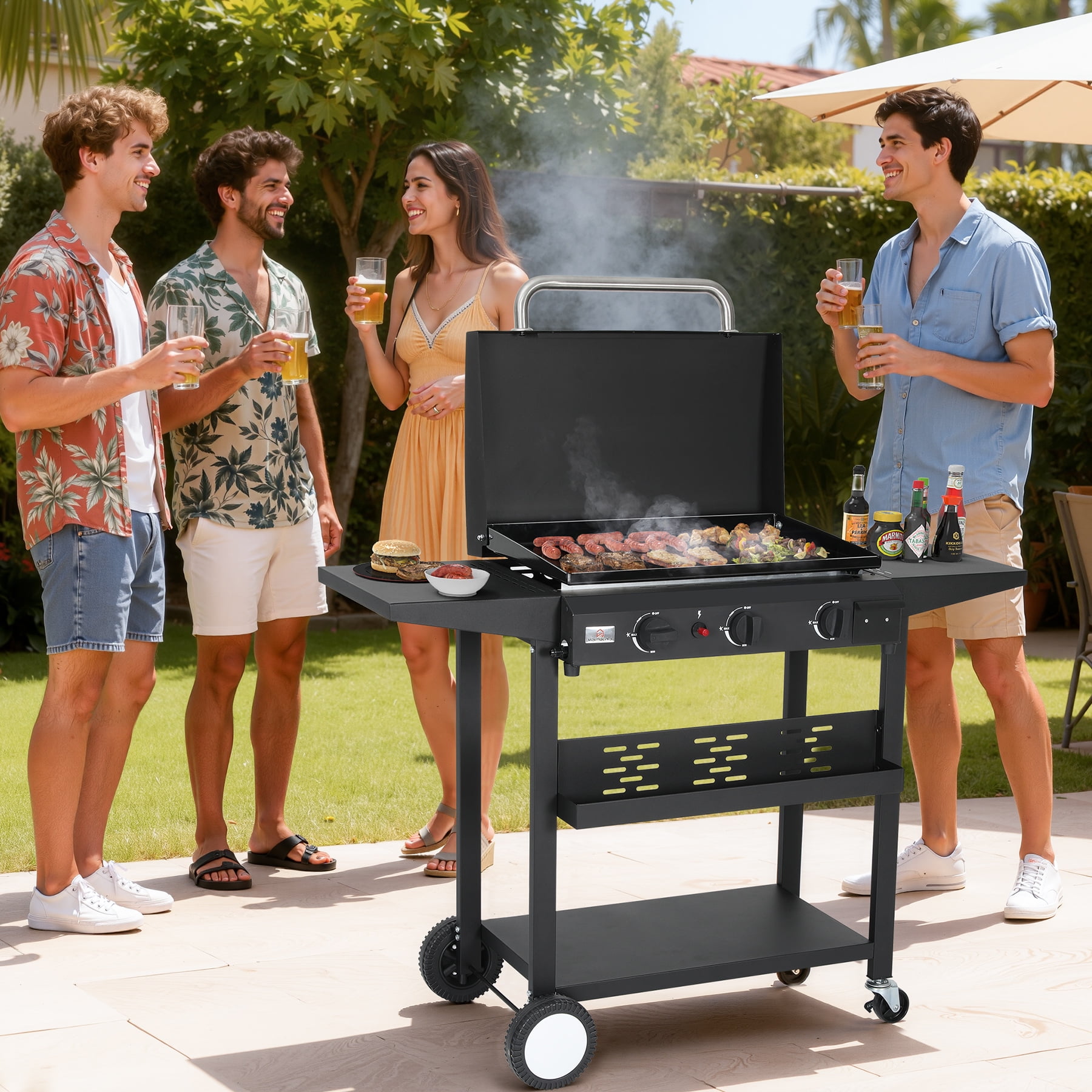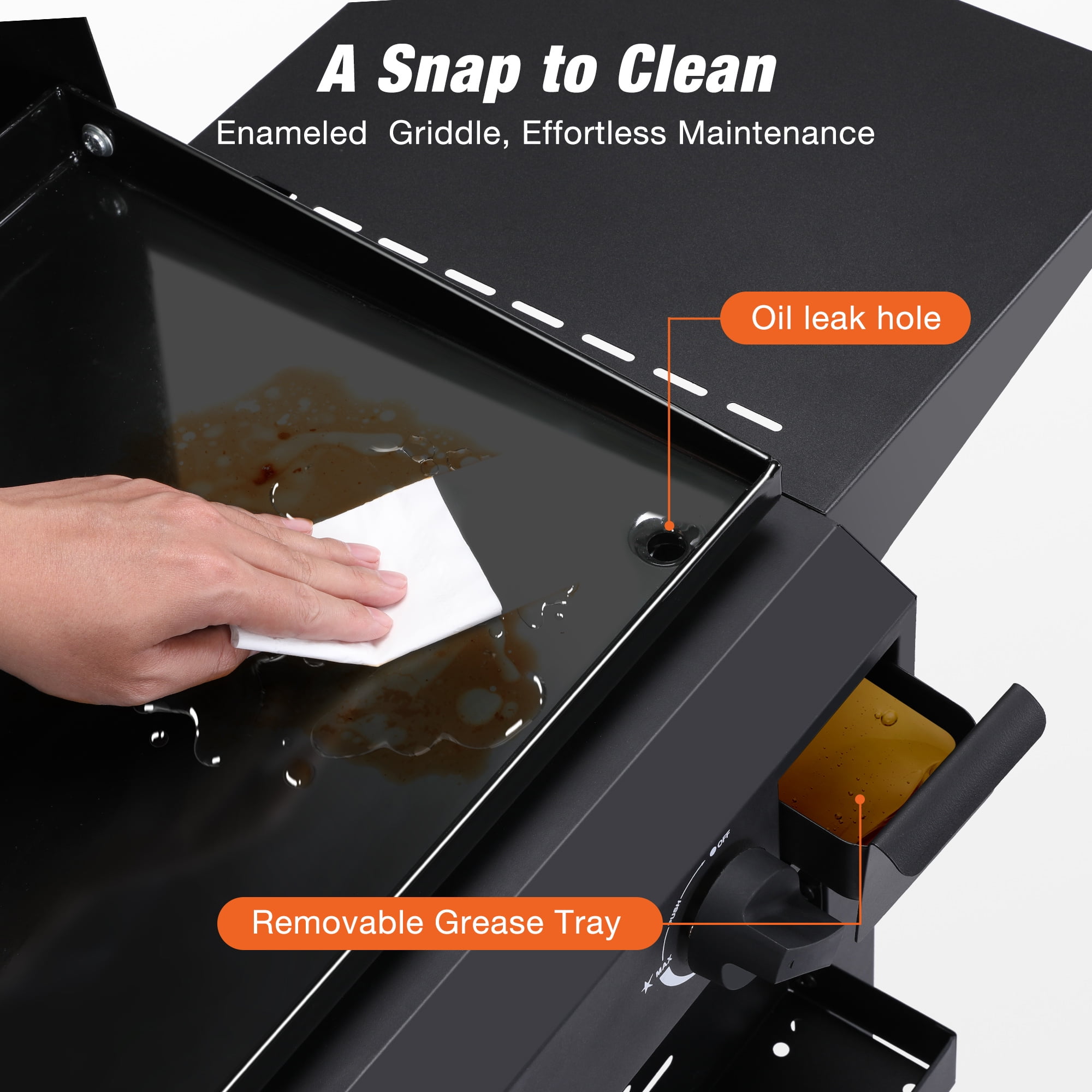 Key Features: 【2 in 1 Propane Griddle】 Removable outdoor griddle design, the flat top grill can be removed independently. Easy to carry after removal, placed on the table as a tabletop grill. Two ways to use, use as a garden cart outdoor griddle or a portable tabletop grill. 2 universal wheels and 2 swivel wheels, make it more flexible to move around. Quickly used or stored without tools, suitable for camping and BBQ. 【Spacious Cooking Surface】 With a large 322 square in cooking area measuring 23 x 14 in, our removable flat top grill with lid is suitable for gatherings of 3-5 people. Cooking multiple foods at the same time and flip the food easily. Whether it’s cooking eggs, pancakes, grilling cheese, seafood, or steak, you can do it all with ease. 【Even Heating & Controllable Heat Zones】 3 independently controlled tube burners offers a total of 24, 600 BTU of power, maintain a constant temperature on the entire surface. Turn on 3 burners, after about 10 minutes, the temperature will stabilize to 340℃. Turn on 3 heat zones of the propane grill to cook more different dishes at the same time, or use a single zone for more energy saving. The temperature of different heat zones are accurately controlled by the knob. Heats more evenly than 4 burners gas griddle, not easy to deform. 【3.5mm Upgraded Enduring Material 】 To withstand the rigors of outdoor cooking, our baking tray is made of upgraded enamel. 3.5mm thickened high-strength enamel material will more effectively prevent rust and sticking, will not deform even at high temperatures, enhance cooking experience. No peeling, easily clean up with kitchen paper towels, bring more protection for health. 【Practical lid & Storage space】 To improve the usability, we equipped the propane griddle with a protective lid, adjust it according to your needs. When opened, it blocks wind and prevents oil splatter, making heating more efficient. When closed, it will keep the food warm and protect the baking tray. No need to worry about the food getting cold and taste getting worse. Also 3 storage spaces: side tables, lower shelf and storage slot to place seasonings, ingredients or paper towels. Provides convenience for cooking. 【Easy to Clean】 3 burner gas griddle’s front access grease management system features a concealed grease pan that makes the cleanup time a breeze. The oil collection system will collect excess grease into a slide-out grease pan. Simply use the kitchen paper towels to clean the baking tray and wipe the exterior of the griddle with a cleaning cloth and detergent. No need to spend time on maintenance after use. FAQ & How to use the propane grill: The baking tray is not hot and the food is not cooked? When 3 burners are turned on, the temperature will reach 340℃ after 10 minutes. It is recommended to adjust the heat according to needs. The baking tray is heated unevenly? The baking tray has 3 heating zones. If you need to use the entire baking tray area, please turn on 3 heating knobs to heat the entire baking tray. What to do if the food is half raw and half cooked? Turn the food frequently to ensure that the food is completely and evenly heated; control the burning area to adjust the temperature of different areas. What causes food to burn and leave a charred char on the baking tray? How can it be prevented? Causes of food burning include too high a temperature, too long a cooking time, the wrong type and thickness of food, the wrong height or position of the baking sheet, sugary seasonings, and lack of pre-treatment or anti-stick measures. Solutions include using precise temperature controls, monitoring cooking time, adjusting for food type and thickness, positioning the baking sheet correctly, using anti-stick methods (such as using oil), and avoiding high-sugar seasonings. Notes before use: ① Check the gas connection. Make sure the propane tank is properly and securely connected to the grill and check for leaks at the connection. ② Gas regulator check. Confirm that the gas regulator switch is in the correct position and is not blocked or damaged. Suggestions for use: Recommended to put enough oil on the baking tray before use and adjust the heat to a suitable temperature to prevent the food from burning. Do not cook food on the baking tray without adding oil. How to clean the baking tray correctly: 1. If there is only a small amount of grease or slight food residue on the enamel baking tray, wipe it clean directly with kitchen paper. 2. The oil collection system will collect excess grease into a slide-out grease pan. Remove the grease pan, pour out the grease, and clean it with detergent. 3. For burnt food charred char or grease, soften the burned part with warm water and detergent. Then use a wooden or plastic spatula to remove the charred char. Finally, scrub the burned part with a sponge or non-metallic brush. Cleaning Tips: √ Kitchen Paper Towels √ Sponge √ wooden/plastic scraper × Metal Brushes × Steel Wool 【Note】It is not recommended to use a metal brush or steel wool. And the above items are not included in the package. Specifications: Power: 24600 BTU Cooking Surface Length: 23 in Cooking Area: 322 square in Product Dimensions: 46 x 17.5 x 35.4 in (L x W x H) Product Weight: 44 LB