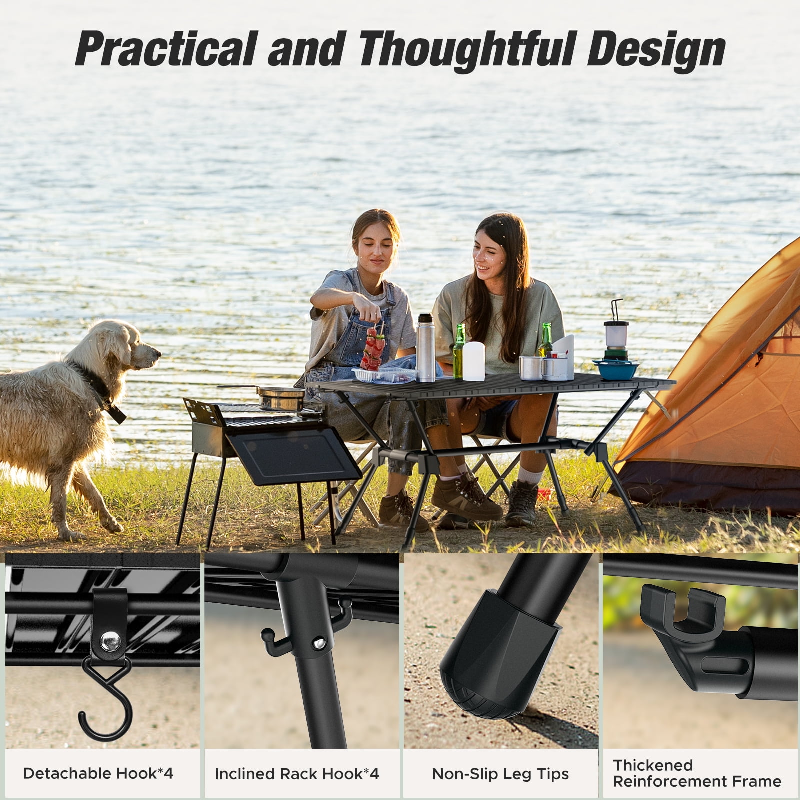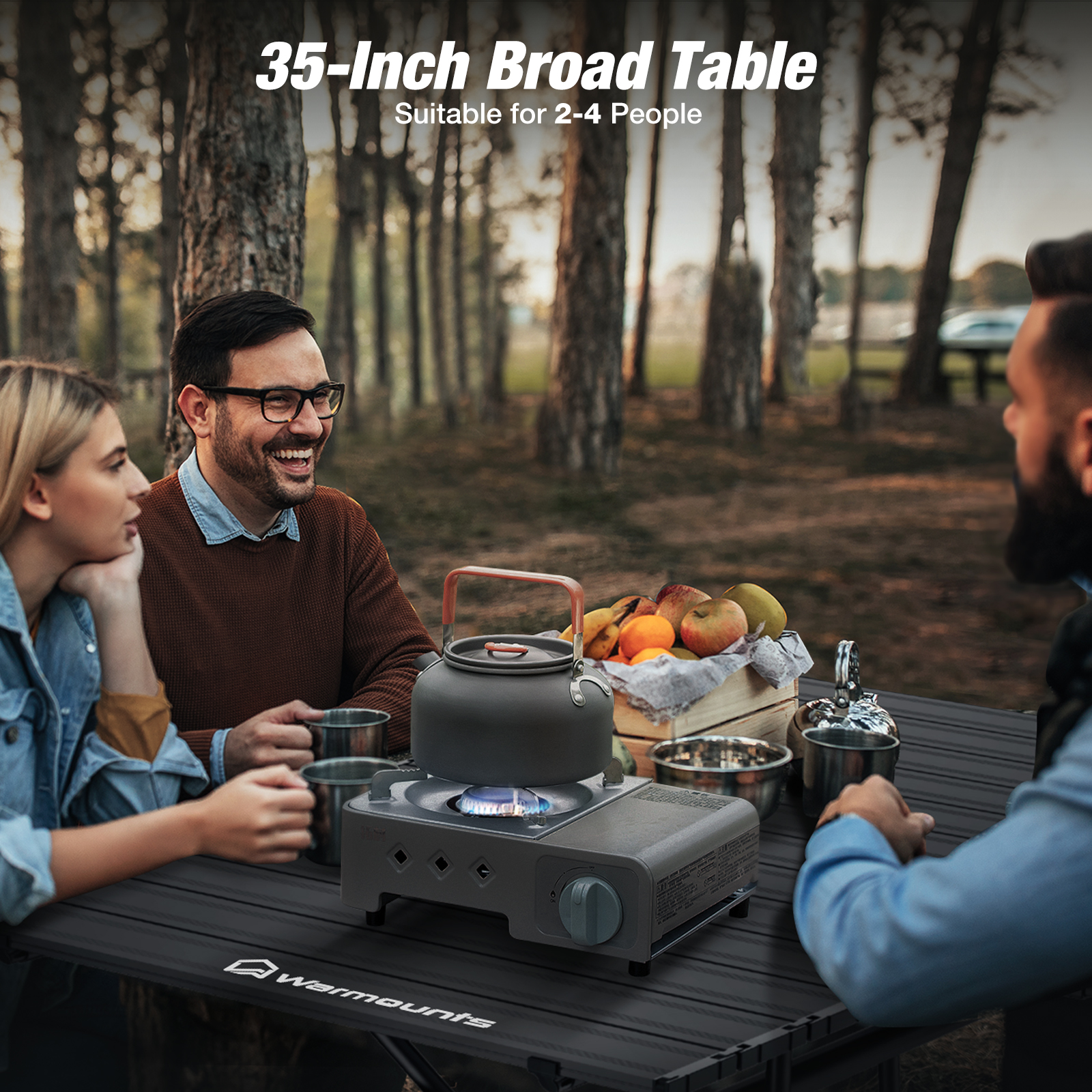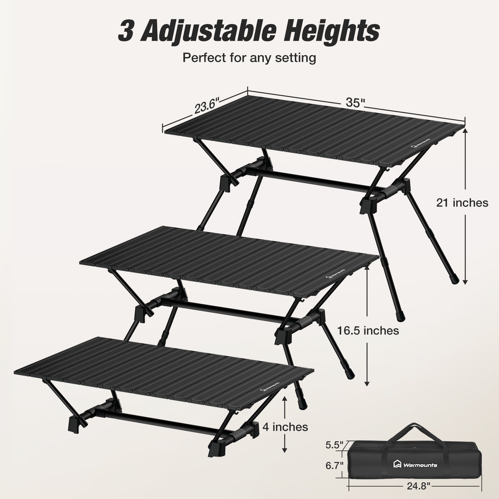 【Sturdy for More Gourmet Delights】WARMOUNTS pioneering exclusive Ultra-Stable “H” Structure. This design distributes force evenly, increasing stability by 67%, and noticeably reducing shaking, compared to triangular or square structures of metal foldable tables for camp. With this structure, the loading capacity of the picnic camping table is up to 145 lbs. 【Multi-Usage, Comfort at Its Best】The portable beach table adopts an adjustable height design. Just press the button on the table leg of aluminum roll up table foldable to adjust the height from the lowest 4″ to the medium height 16.5″, and then to the highest height 21″, fully meeting your needs. 【Compact Fold, Broad Spread】The portable camp table size measures 35″ Wide, unfolded size of the table is: 35”×23.6”×21”. WARMOUNTS aluminum outdoor camping table that fold up lightweight weighs only 8.8 lbs, and it can be folded into a compact size: 24.8”×5.5”×6.7”, 1/3 of the size of traditional collapsible table portable. Carrying it for various activities is a breeze. 【Reliable Use, Built to Last】Made of aero-grade aluminum alloy with anodized surface, the camp table for grill is not easy to rust, corrosion-resistant and easy to clean, effectively prolonging its service life and making aluminum roll up camp table to cook on an ideal choice for outdoor indoor activities. 【Set Up in Seconds, Ready to Enjoy Your Trip】With just 4 steps, no tools are required, simply align the installation port with the shock-cord poles and pull ring to assemble the foldable adjustable height table, and disassemble the camp kitchen table is just as simple.