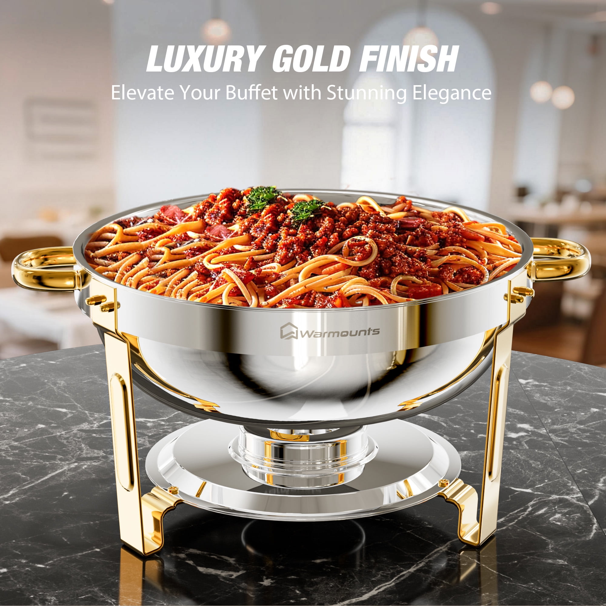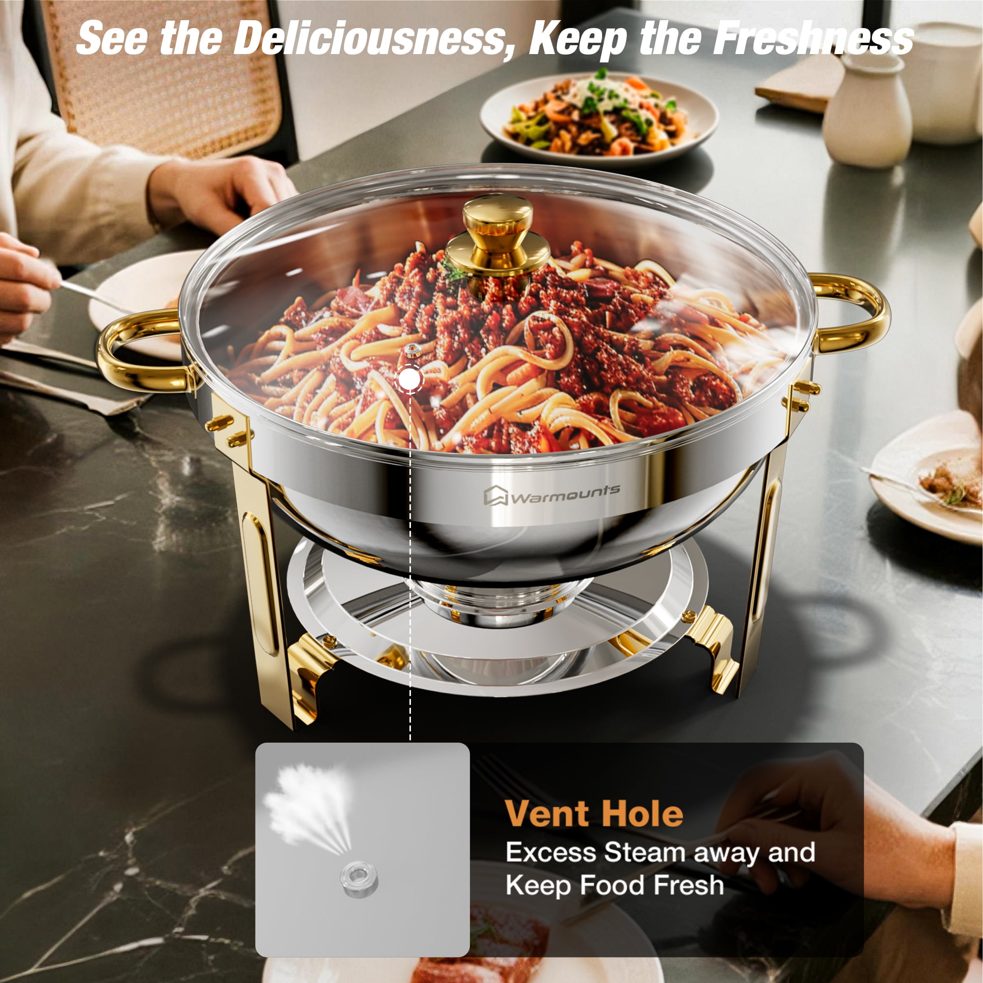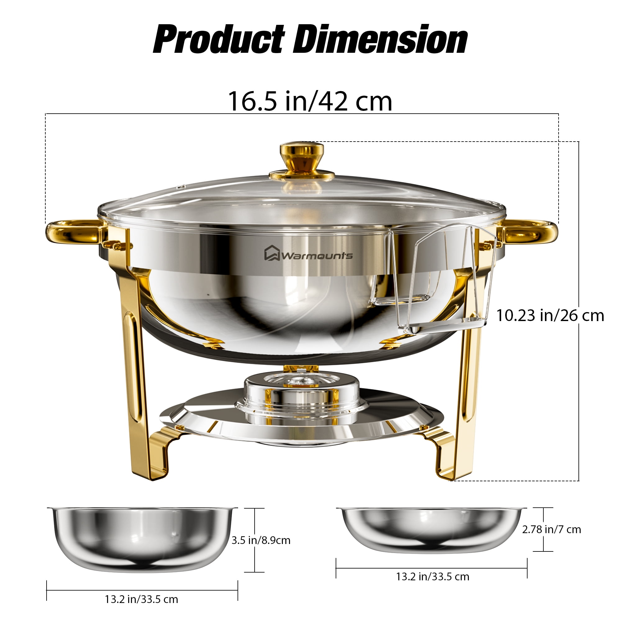 Key Features: [CRAFTED FOR STRENGTH, DESIGNED FOR SAFETY] WARMOUNTS Upgrade gold chafing dishes for buffet are made of thickened food-grade stainless steel, which ensures safer use and is less prone to rusting. The edges of both the water pan and food pan are meticulously. [SEE THE DELICIOUSNESS, KEEP THE FRESHNESS] Glass lid of the chafing dishes allows you to see the food inside without opening it. Vent holes on the lid can keep food fresh while minimizing the possibility of breaking, enhancing safety during use. [SAVOR THE PARTY, RELISH THE EASE] Gold chafing dish for buffet set features lid holder that prevent touch tables, ensuring cleanliness and convenient access. [EVERY DISH, JUST RIGHT TEMPERATURE] With 5QT capacity, the round chafing dishes can serve at least 5 people, making it ideal for various gatherings. The chafers for catering comprise 1 water pan & 1 food pan, capable of maintaining both hot and cold temperatures consistently. This temperature stability ensures a uniform flavor in the food, enhancing the dining experience for guests. [CLEAN FAST, SHINE ON] The gold chafers and buffet warmers sets undergo a meticulous precision polishing process, rendering them simpler to cleanse. You can easily wipe them down, saving valuable time during post-event cleanup. Specification: -Quantity: 2 -Capacity: 5QT -Product Weight: 12.76 lbs -Material: Food-Grade Stainless Steel -Heating Method: Fuel -Food Pan Size: 12.99″×2.56″ -Water Pan Size: 13.58″×3.74″ Package Included: 2 × Chafing Dish Frame 2 × Food Pan 2 × Water Pan 2 × Fuel Can 2 × Lid Holder 2 × Glass Lid