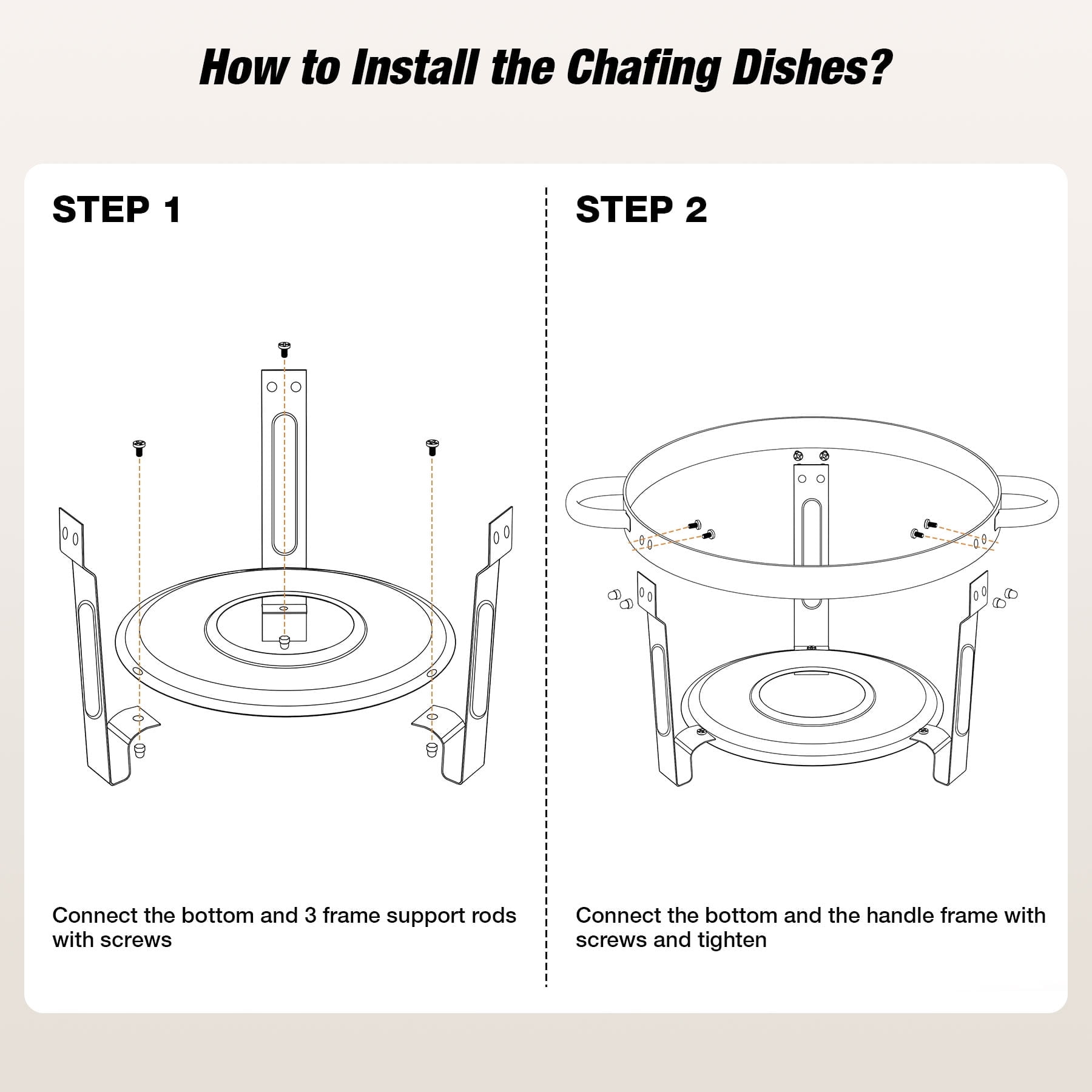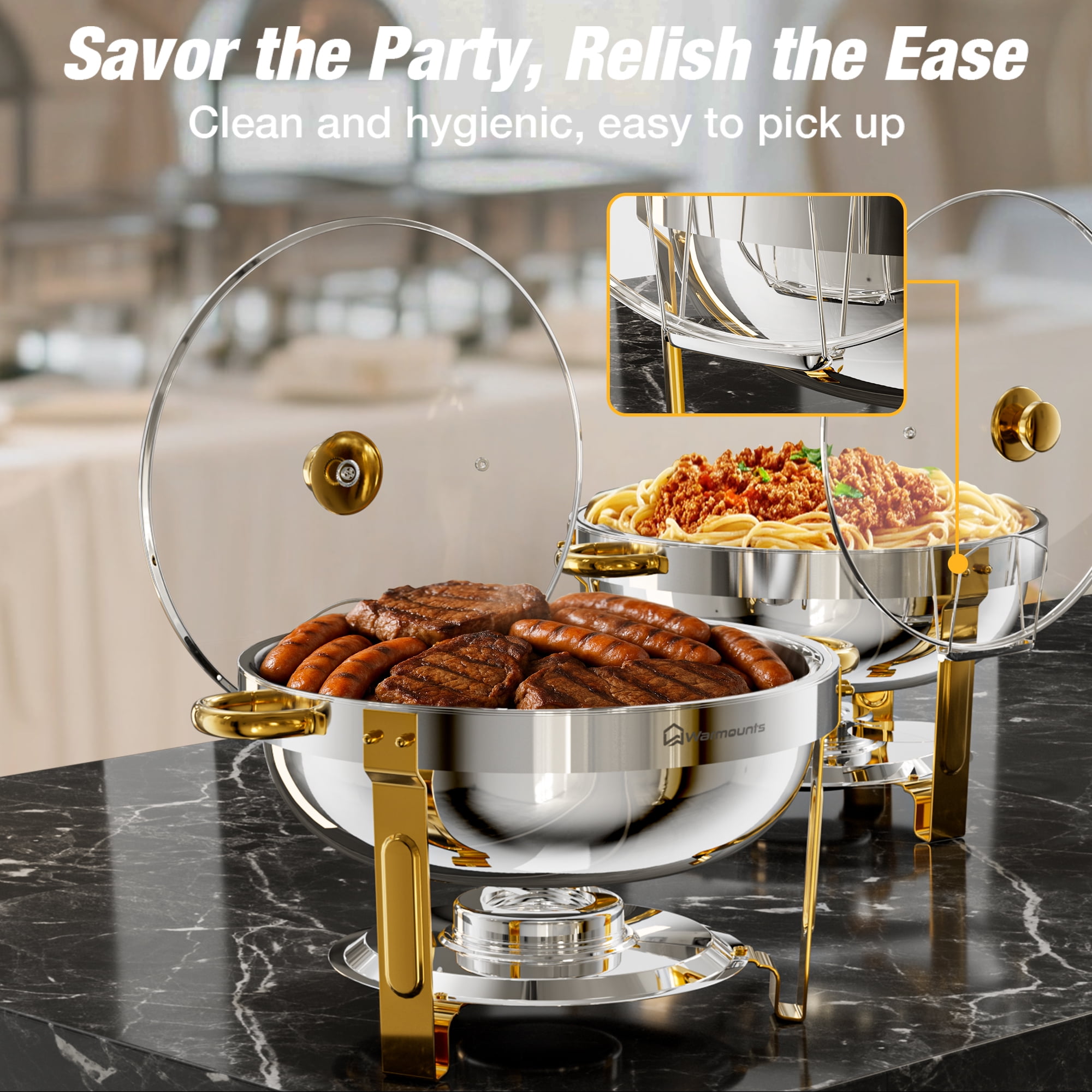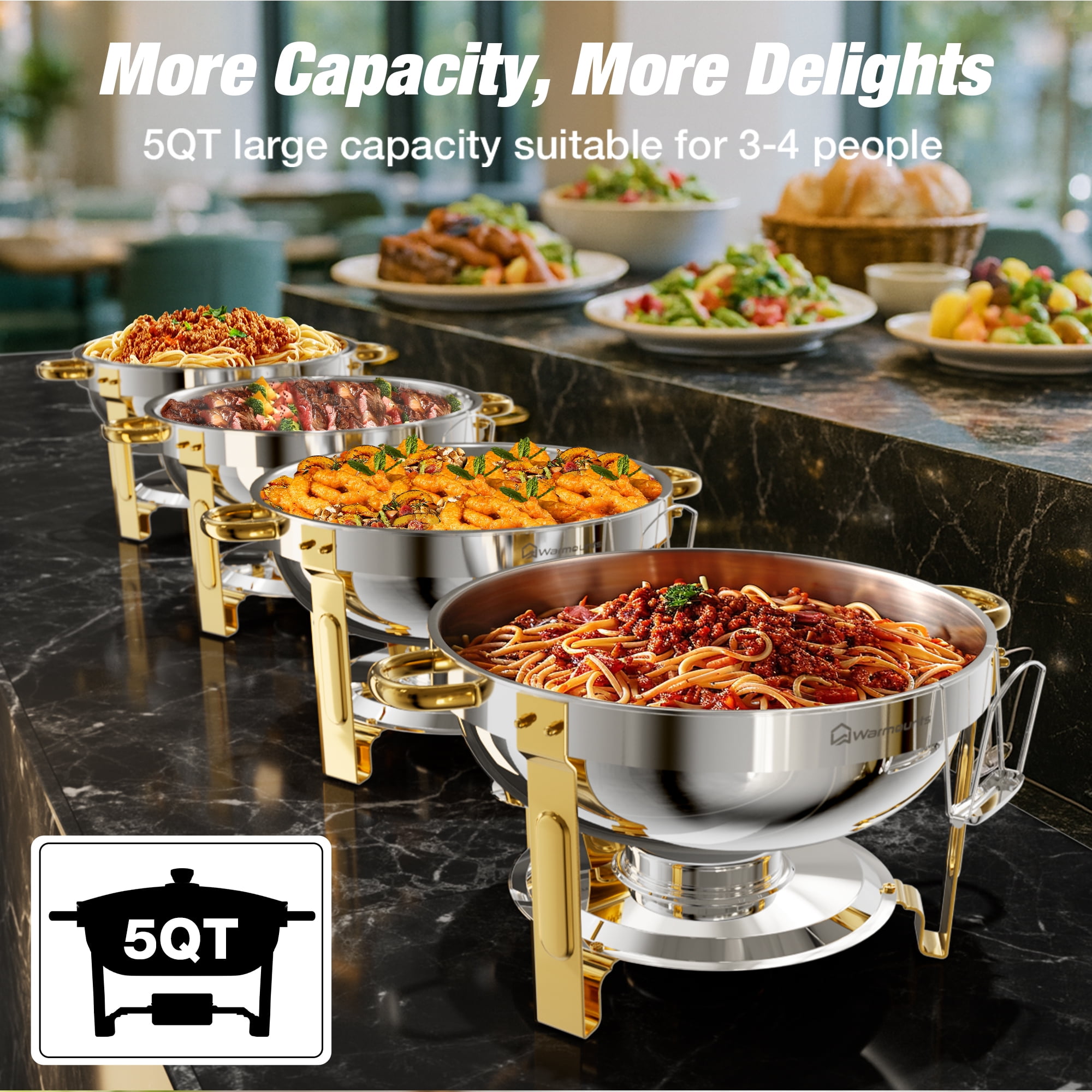 Key Features: [CRAFTED FOR STRENGTH, DESIGNED FOR SAFETY] WARMOUNTS Upgrade gold chafing dishes for buffet are made of thickened food-grade stainless steel, which ensures safer use and is less prone to rusting. The edges of both the water pan and food pan are meticulously. [SEE THE DELICIOUSNESS, KEEP THE FRESHNESS] Glass lid of the chafing dishes allows you to see the food inside without opening it. Vent holes on the lid can keep food fresh while minimizing the possibility of breaking, enhancing safety during use. [SAVOR THE PARTY, RELISH THE EASE] Gold chafing dish for buffet set features lid holder that prevent touch tables, ensuring cleanliness and convenient access. [EVERY DISH, JUST RIGHT TEMPERATURE] With 5QT capacity, the round chafing dishes can serve at least 5 people, making it ideal for various gatherings. The chafers for catering comprise 1 water pan & 1 food pan, capable of maintaining both hot and cold temperatures consistently. This temperature stability ensures a uniform flavor in the food, enhancing the dining experience for guests. [CLEAN FAST, SHINE ON] The gold chafers and buffet warmers sets undergo a meticulous precision polishing process, rendering them simpler to cleanse. You can easily wipe them down, saving valuable time during post-event cleanup. Specification: -Quantity: 2 -Capacity: 5QT -Product Weight: 12.76 lbs -Material: Food-Grade Stainless Steel -Heating Method: Fuel -Food Pan Size: 12.99″×2.56″ -Water Pan Size: 13.58″×3.74″ Package Included: 2 × Chafing Dish Frame 2 × Food Pan 2 × Water Pan 2 × Fuel Can 2 × Lid Holder 2 × Glass Lid