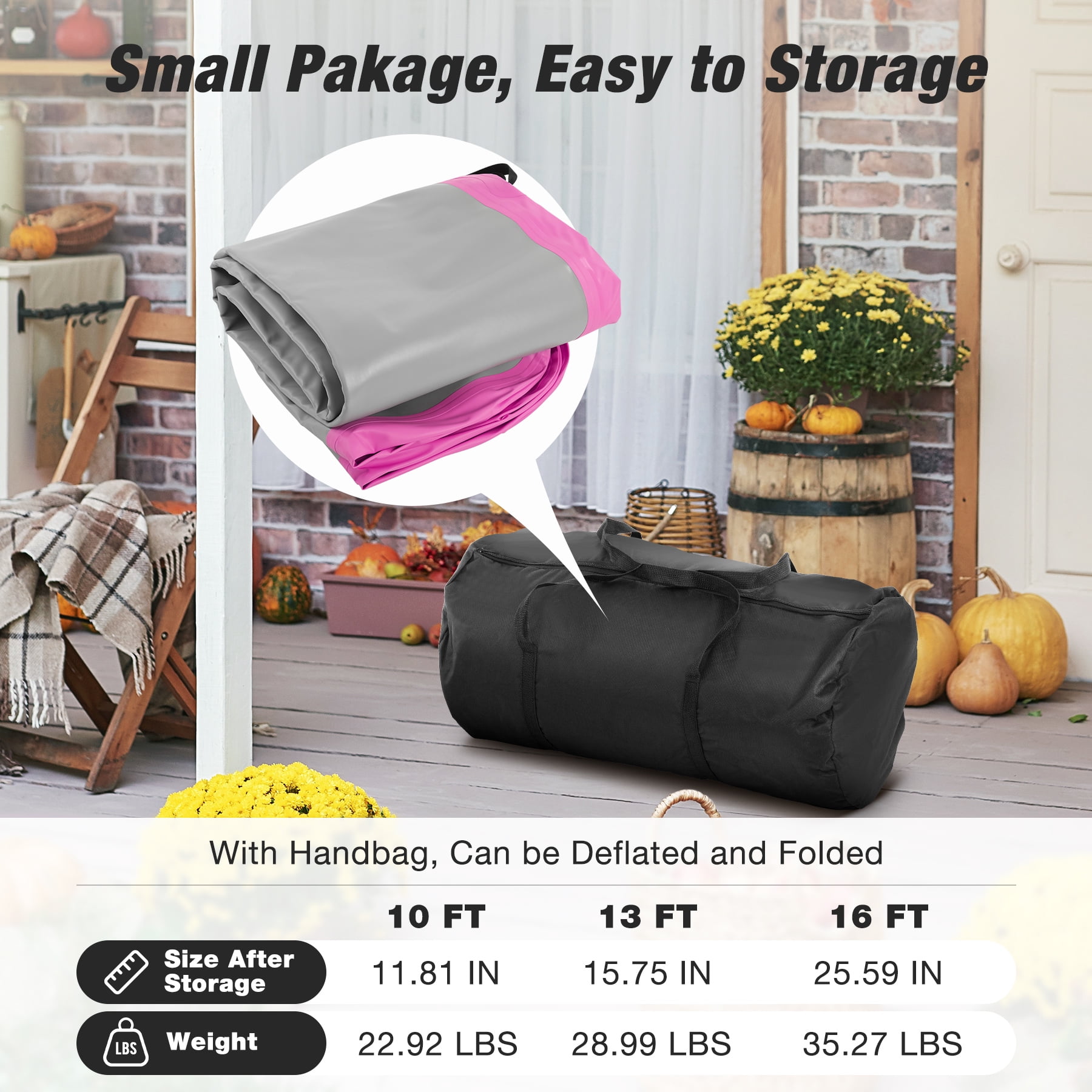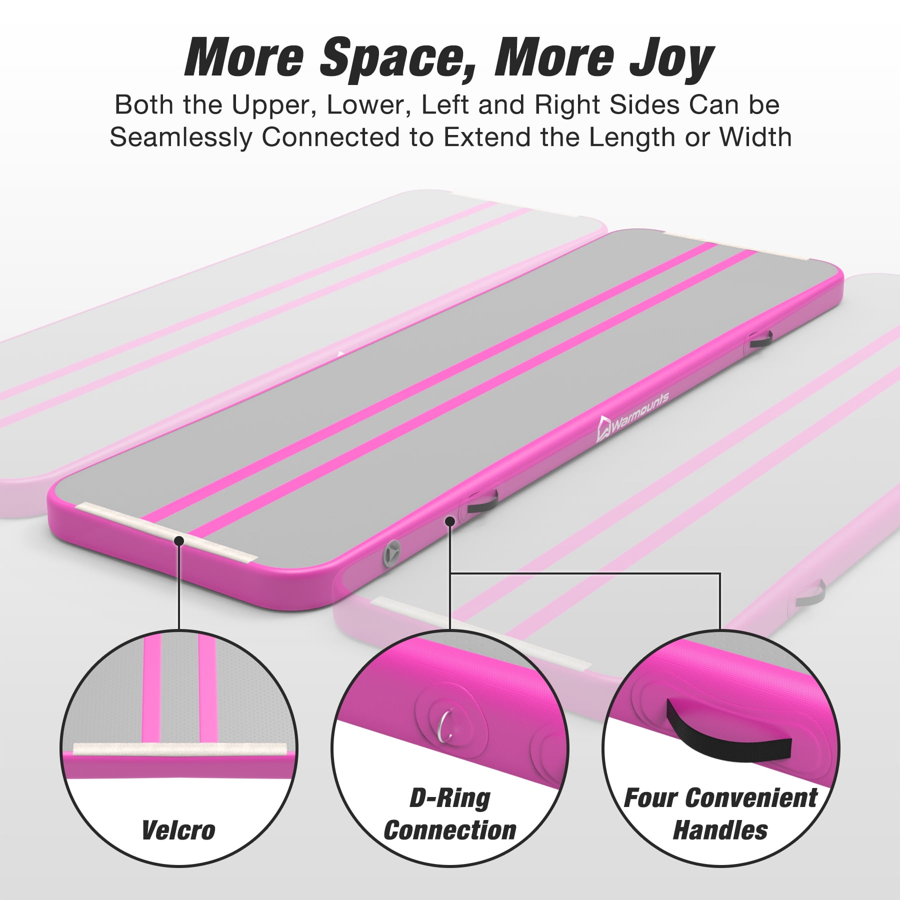 Key Feature of Inflatable Gymnastics Tumbling Mat : 【Safe & More Realiable】 This kids gymnastics mat is made from double-layer PVC, providing a soft and highly elastic surface for training. It’s waterproof (rated IP67), slip-resistant, and eco-friendly. When fully inflated, the mat reaches a height of 4”, offering excellent cushioning and support. 【30-Second Quick Inflation & Deflation】 The 10ft air tumbling mat equipped with a 500W electric air pump, allowing it to be fully inflated or deflated within just 30 seconds, thanks to a maximum pressure of up to 2 PSI. This efficient system makes it convenient to set up or pack away the mat, ideal for use on the go. 【Reinforced Seams to Prevent Air Leaks】 Say goodbye to air leaks with reinforced seams. Each seam is professionally sealed to ensure no air escapes, keeping the inflatable gymnastics mat firm and airtight during use. This significantly enhances the mat’s longevity and performance. 【Portable & Space-Saving】 The inflatable gymnastics tumbling mat comes with a convenient carrying bag, allowing you to easily fold and store it when deflated. After folding, its dimensions are 25.6” ✕15.7” ✕11.8” and it weighs 22.9 lbs, making it easy for anyone to carry without dragging. 【Expandable & Versatile】 Featuring hook-and-loop strips at the head and D-rings on the sides, you can seamlessly connect multiple inflatable air tumble track to extend length or width as needed. Whether you’re in the backyard, at home, at the gym, or even in water, this mat performs well in any setting. It’s ideal for gymnastics training, yoga, dance, and other outdoor activities. Usage Precautions: During Use: Use on a clean, flat surface to avoid sharp objects. Ensure ample space around the inflatable tumbling mat for kids to avoid collisions or impacts. If an air leak is detected, stop using immediately, locate the leak, and repair it with the provided kit. After Use: Deflate, roll up the inflatable tumbling mat for gymnastics, and store it in a cool, dry place. Avoid placing heavy objects on the air gymnastics mat to prevent deformation during long-term storage. Specification of Inflatable Track for Gymnastics: Size: 10 ft Thickness: 4” Max Pressure: 2PSI Net Weight: 22.9 lbs Package includes: 1 x Inflatable Air Training Mats 1 x Electric Air Pump 3 x Nozzles 2 x Repairing Kit 1 x Handle Bag 1 x Instructions