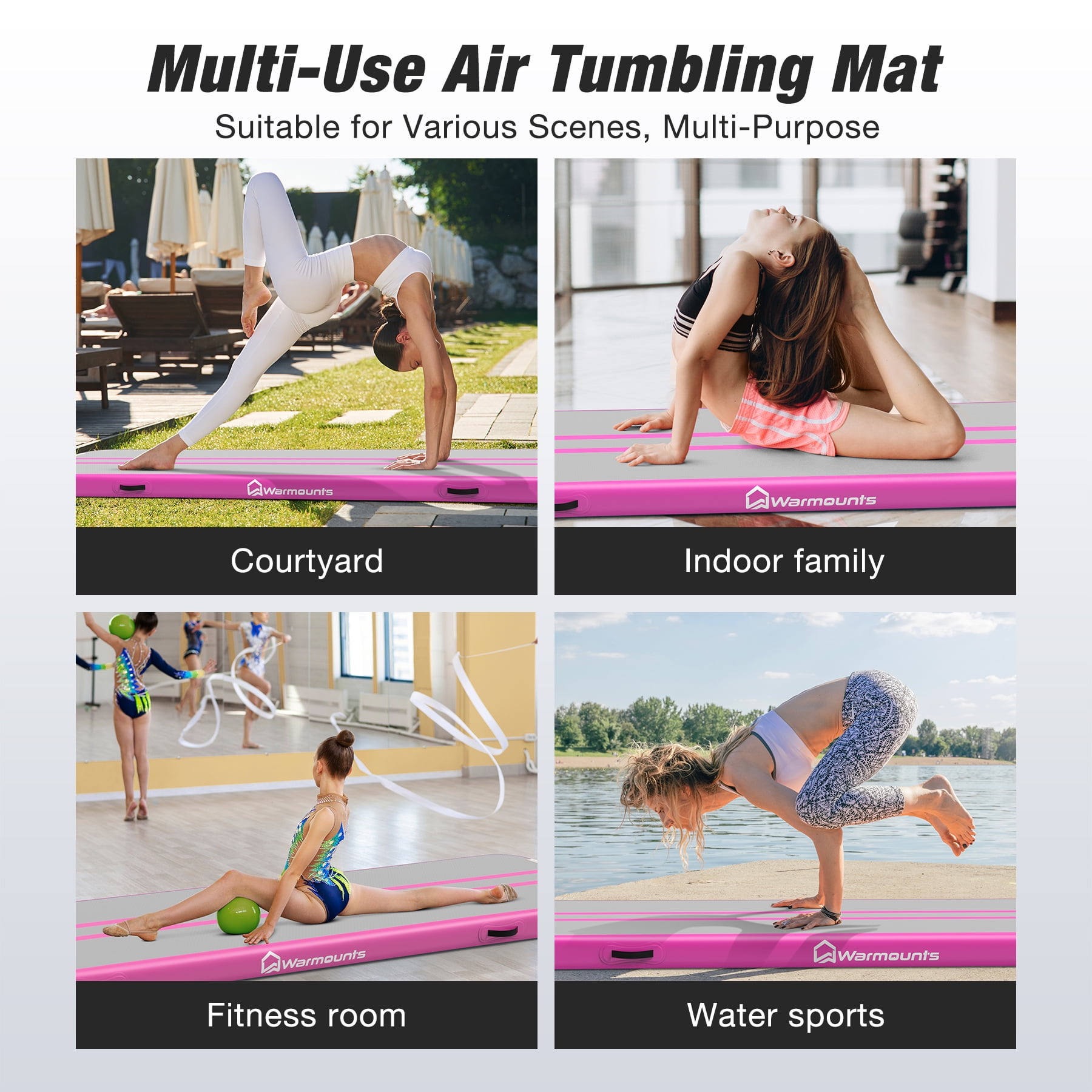 WARMOUNTS Tumbling Mat, 10 ft Inflatable Air Gymnastics Training Mats w/ Electric Pump, 4” Thick Tumble Track for Home, Gym, Cheerleading, Water, Outdoor