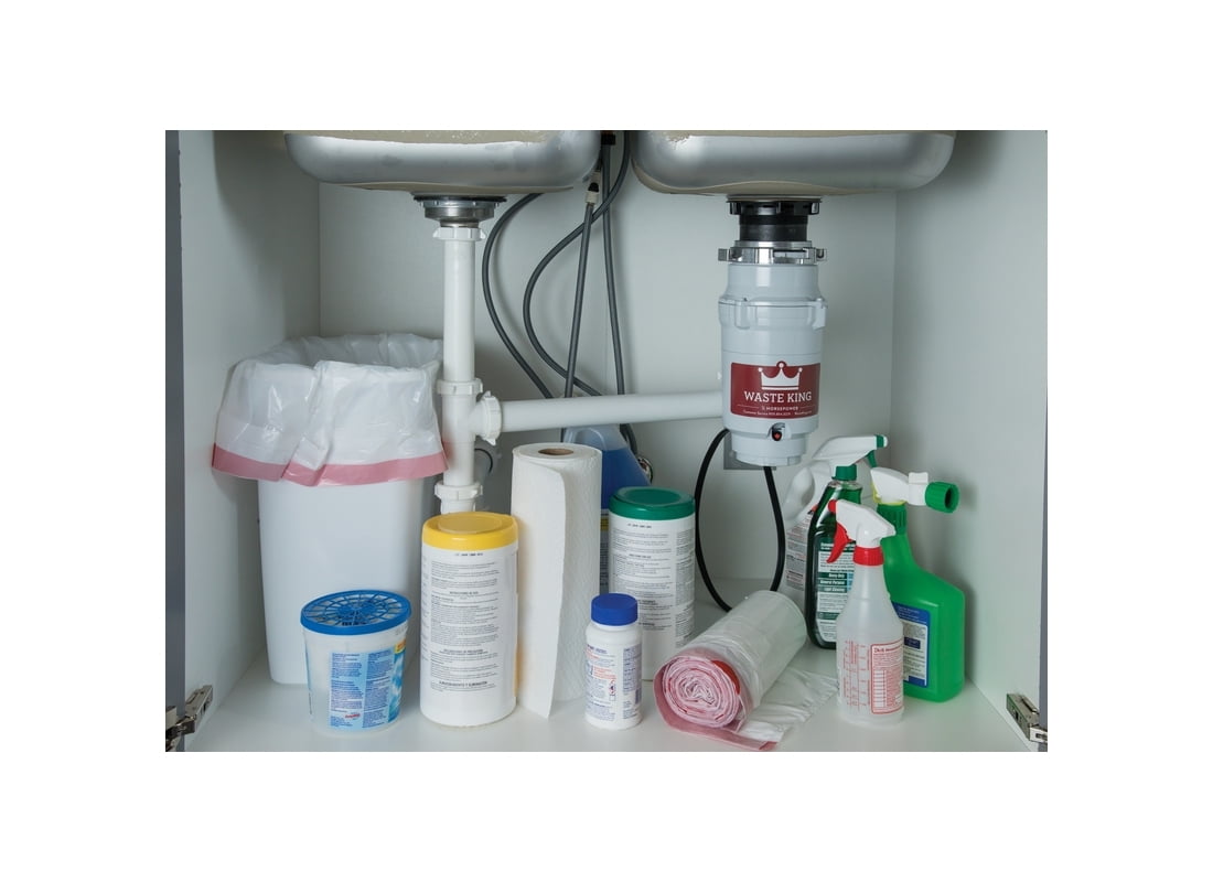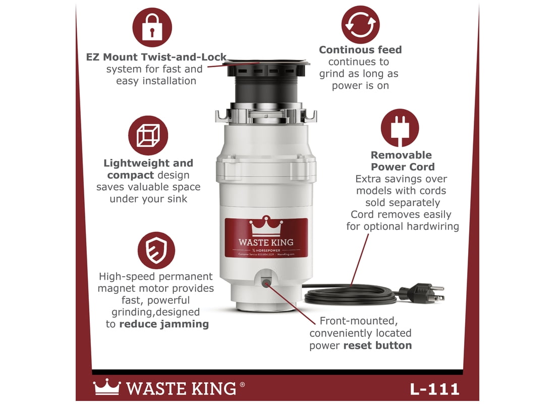 Waste King L 111 1 3 horsepower garbage disposal with pre installed power cord and sound insulation Energy efficient permanent magnet motor and stainless steel swivel impellers help reduce jamming Fast and easy to install with a removable splashguard that is easy to clean and replace Rust and corrosion proof glass filled nylon grind chamber and drain housing Continuous feed technology Front mounted reset button for easy use Safe to use with properly sized septic tanks Has dishwasher hookup