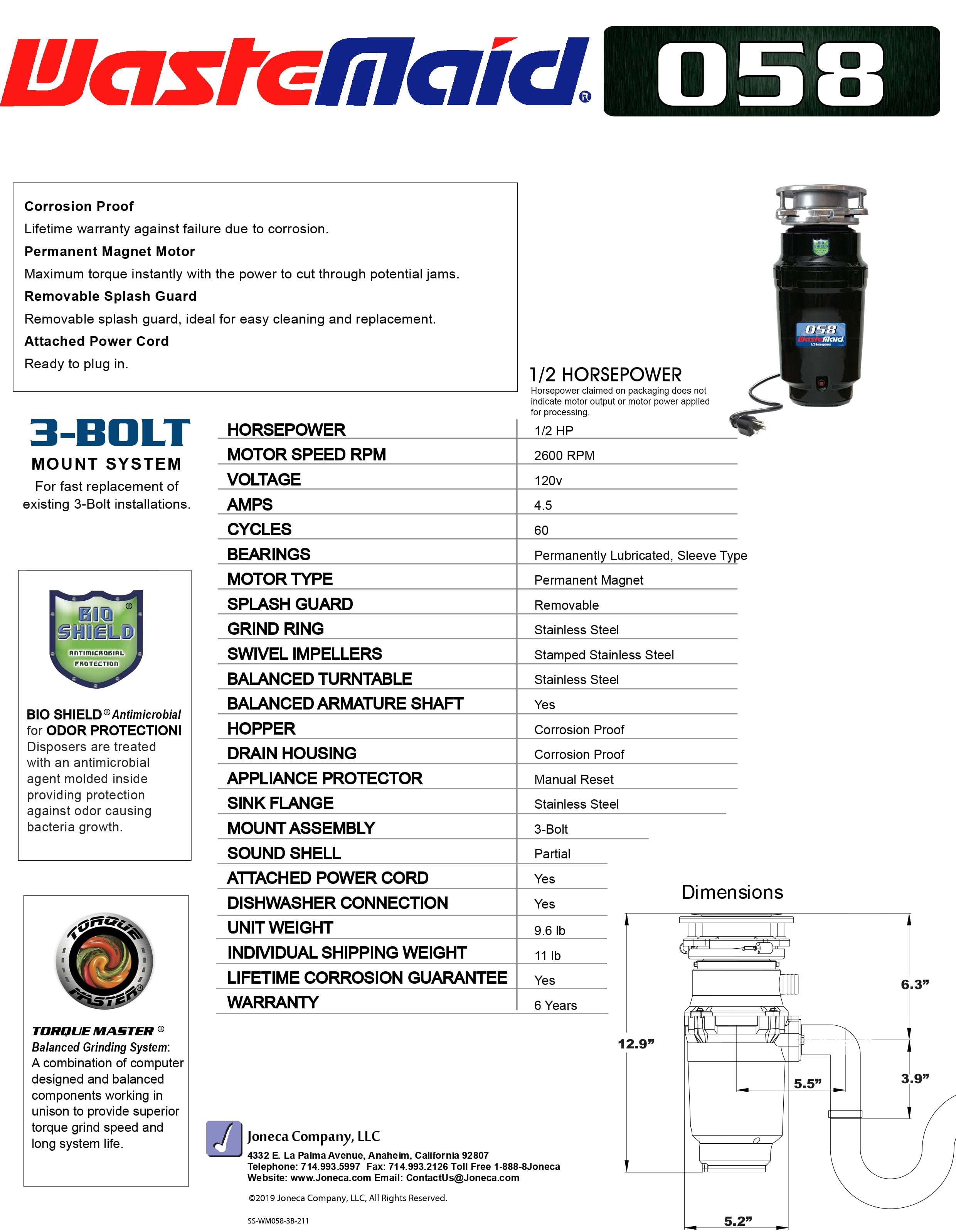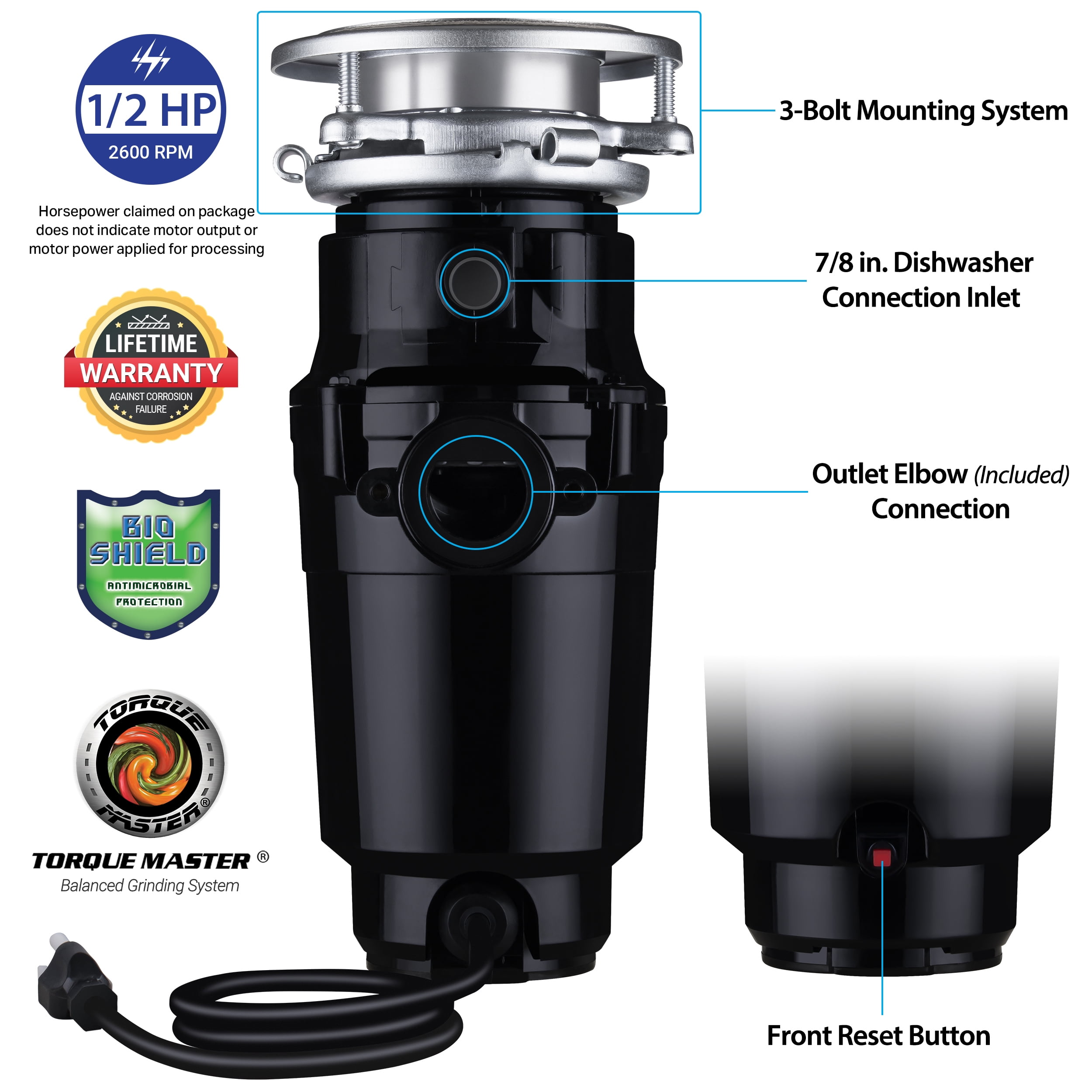 1/2 HP 2600 RPM Permanent Magnet Motor (Horsepower claimed on package does not indicate motor output or motor power applied for processing) 29 oz Grind Chamber Capacity (Standard) Stopper and Removable Splash Guard Included 5.2″ x 12.9″ (WxH) 3-Bolt Mount – Easy to Swap Disposers with Similar Mounts Torque Master Balanced Grinding System – High Torque, Less Vibration, Anti-Jamming Bio-Shield Odor Protection Space-Saving Compact Design Shell Dishwasher Hookup Septic Tank Safe Alternative Hardwire Instructions in Manual