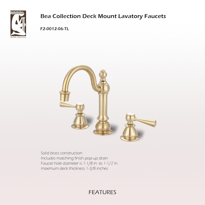 Crafted to the superior standards with fine quality and workmanship, the Water Creation™ F2-0012 lavatory faucet is a charming addition to your bath space. The European-inspired design is enhanced by variable selections of matching handles, which offers the choice of lever and cross handles in refined style. The ball-tipped pop-up rod is seamlessly associated with the attractive pillar, while curved escutcheons perfect the sensibility. Combined with the beautiful brass pop-up drain stopper, this faucet celebrates form as well as function. Adorned with a stylish sculpture, this Water Creation faucet is an ideal mix between classic and contemporary designs for your bathroom room.