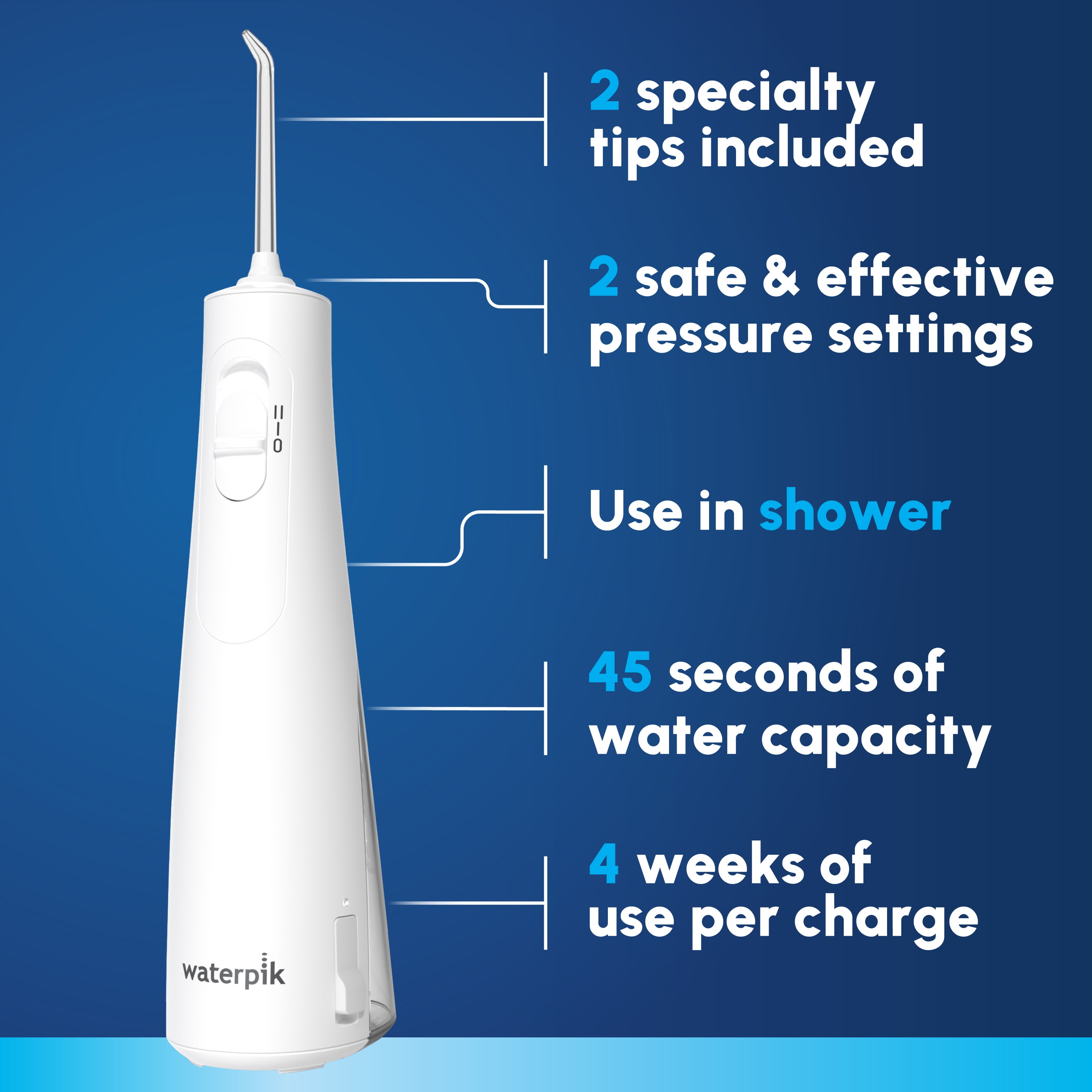 MODEL: Waterpik Cordless Enhance portable and rechargeable water flosser oral irrigator with 2 flossing tips for multiple family members FEATURES: 2 safe and effective pressure settings, 6-ounce water reservoir, 2 flosser tips, USB-A charging cable, up to 45 seconds of flossing time, in-handle pressure control, waterproof and may be used in the shower CLINICALLY PROVEN: Waterpik brand water flossers are backed by 80+ studies and clean deep between teeth and under the gumline where traditional brushing and string flossing can’t reach EFFECTIVE: Waterpik water flossers use Precision Pulse technology to deliver a combination of water pressure and pulsations, removing up to 99.9 percent of plaque bacteria from treated areas that cause gingivitis, cavities, and bad breath GREAT FOR TRAVEL: Provides multiple uses on a single charge, ultra-quiet design, ergonomic non-slip hand grip, up to 4 weeks of use on a 4-hour lithium-ion battery charge, battery recharge indicator, global voltage compatible IN THE BOX: Waterpik Cordless Enhance water flosser in White (WF-21), 2 Precision flossing tips (JT-450E), USB-C to USB-A charging cable (wall adapter NOT included) HEALTH PLAN: May be covered by FSA/HSA. Contact your health plan administrator regarding eligibility.