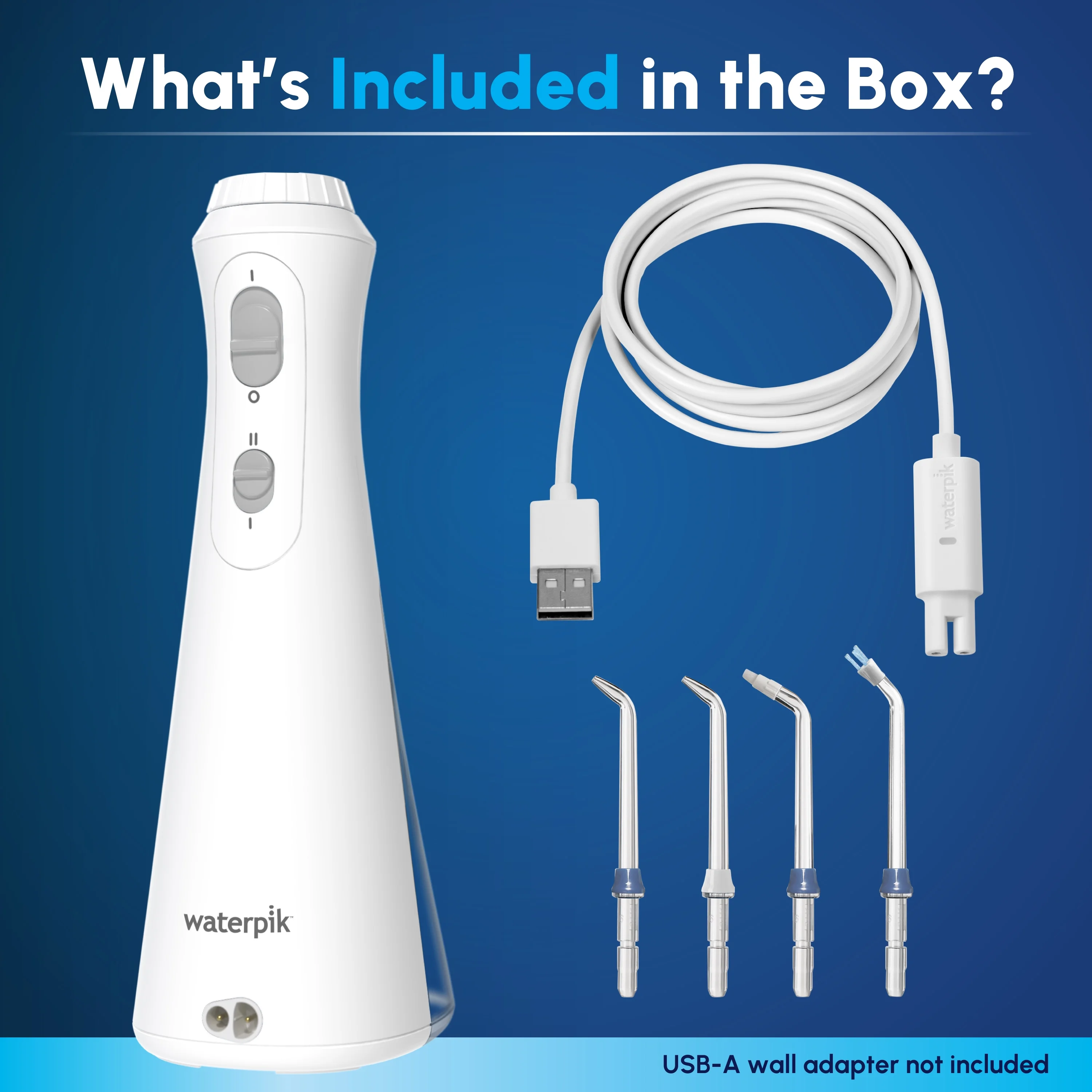MODEL: Waterpik Cordless Plus portable and rechargeable water flosser oral irrigator with 4 flossing tips for multiple family members and dental needs FEATURES: 2 safe and effective pressure settings, 6-ounce water reservoir, 4 flosser tips, USB-A charging cable, up to 45 seconds of flossing time, in-handle pressure control, 360-degree rotating tip handle, portable and ultra-quiet design, global voltage compatible CLINICALLY PROVEN: Waterpik brand water flossers are backed by 80+ studies and clean deep between teeth and under the gumline where traditional brushing and string flossing can’t reach EFFECTIVE: Waterpik water flossers use Precision Pulse technology to deliver a combination of water pressure and pulsations, removing up to 99.9 percent of plaque bacteria from treated areas that cause gingivitis, cavities, and bad breath IN THE BOX: Waterpik Cordless Plus water flosser in White (WP-450), 2 Precision flossing tips (JT-450E), 1 Orthodontic flossing tip (OD-100E), 1 Plaque Seeker flossing tip (PS-100E), USB-A charging cable (wall adapter NOT included)