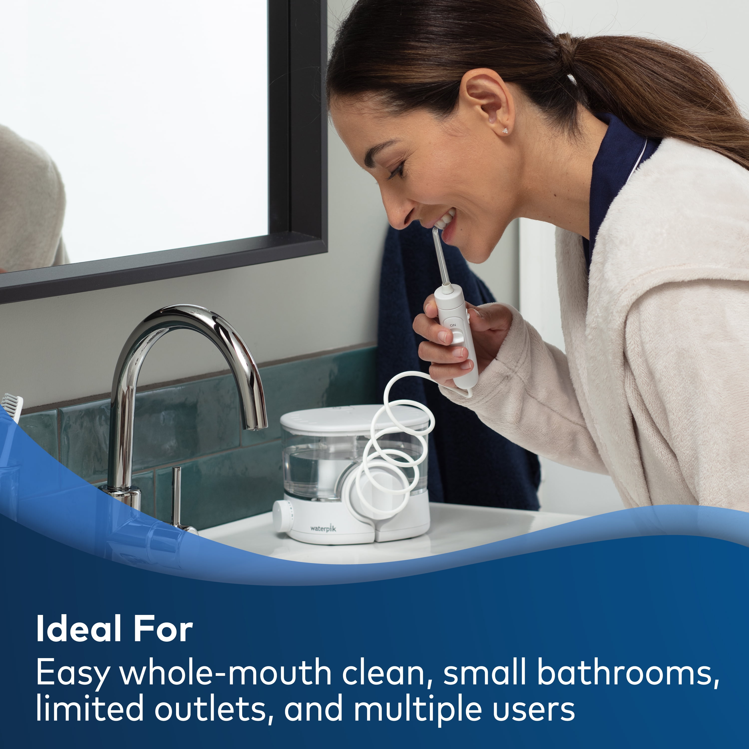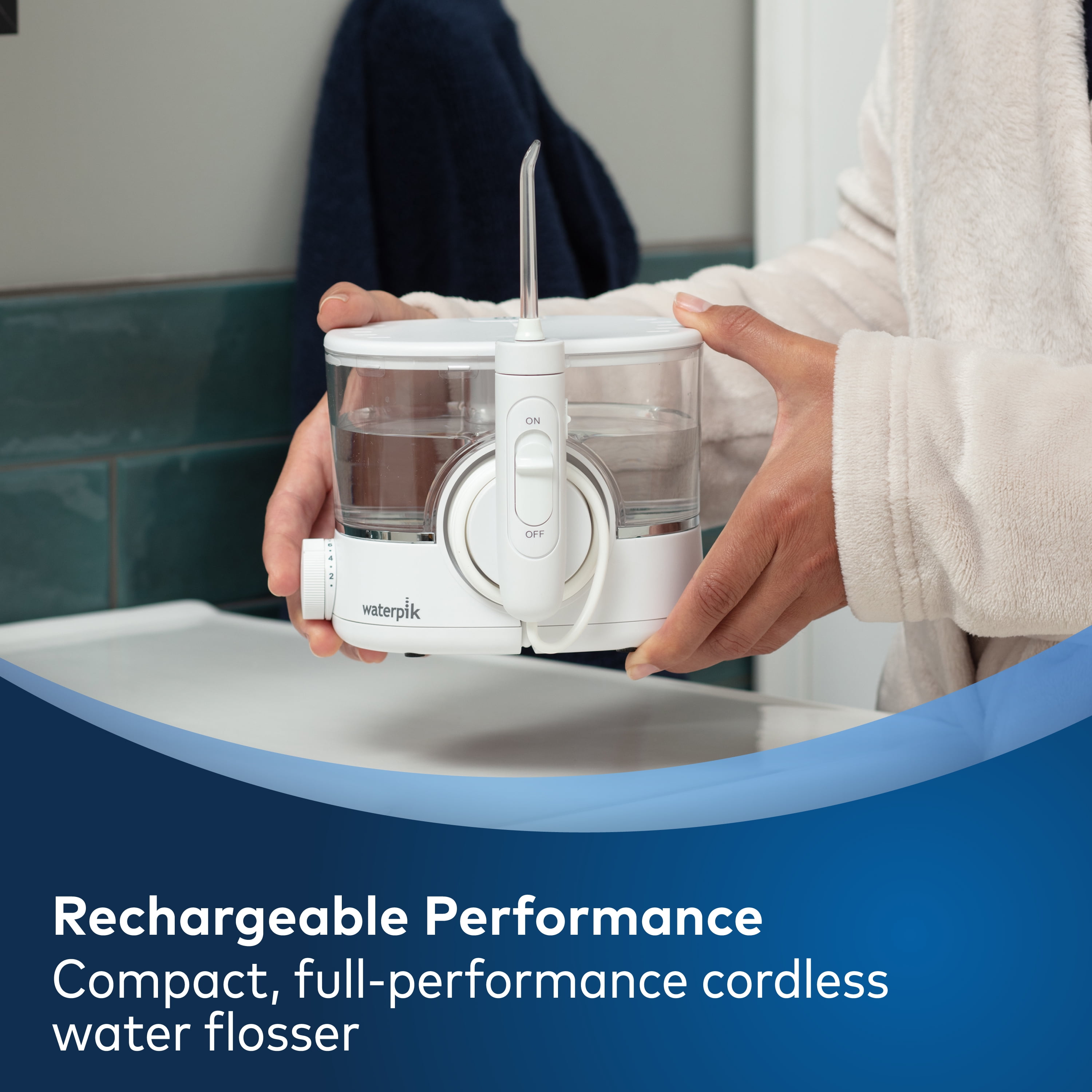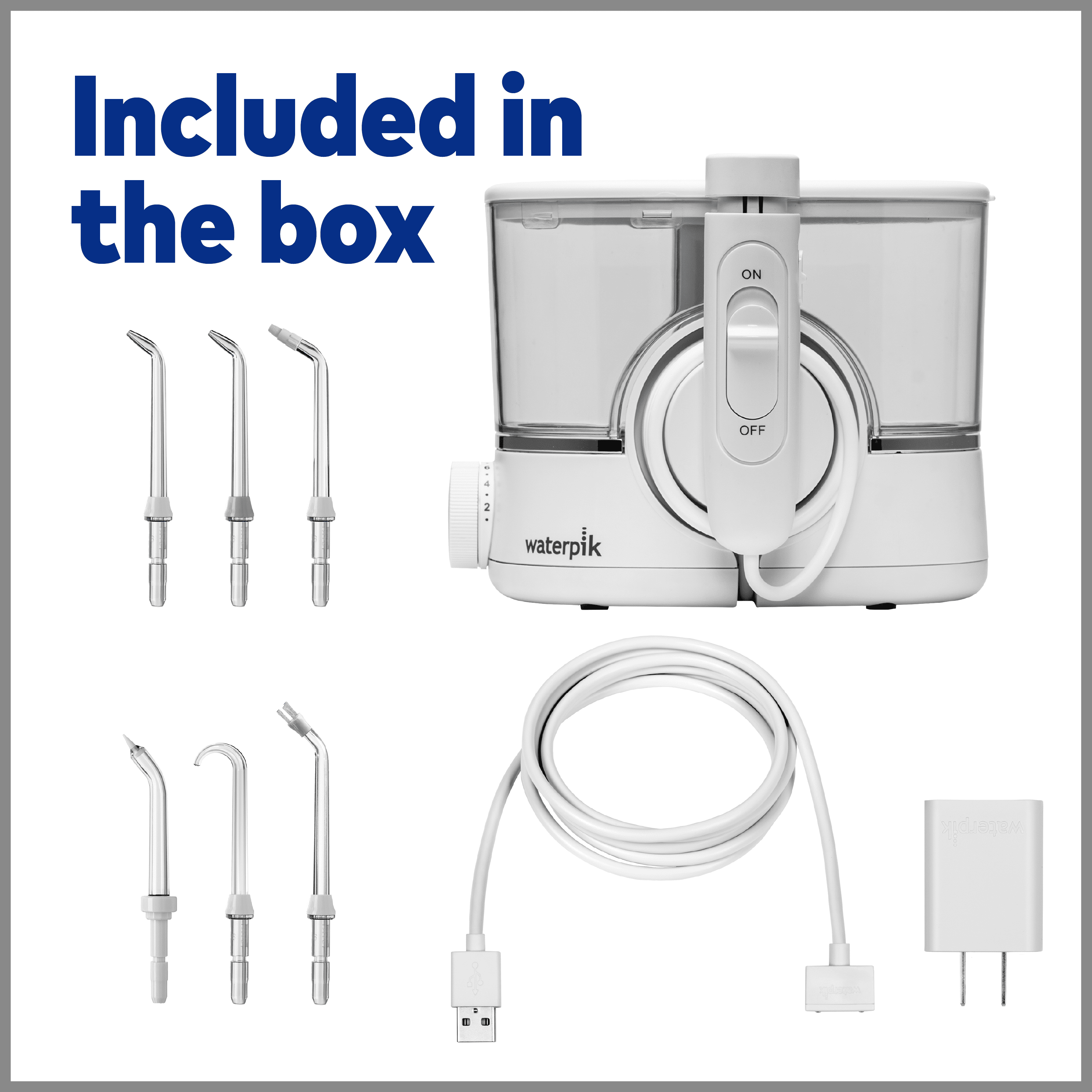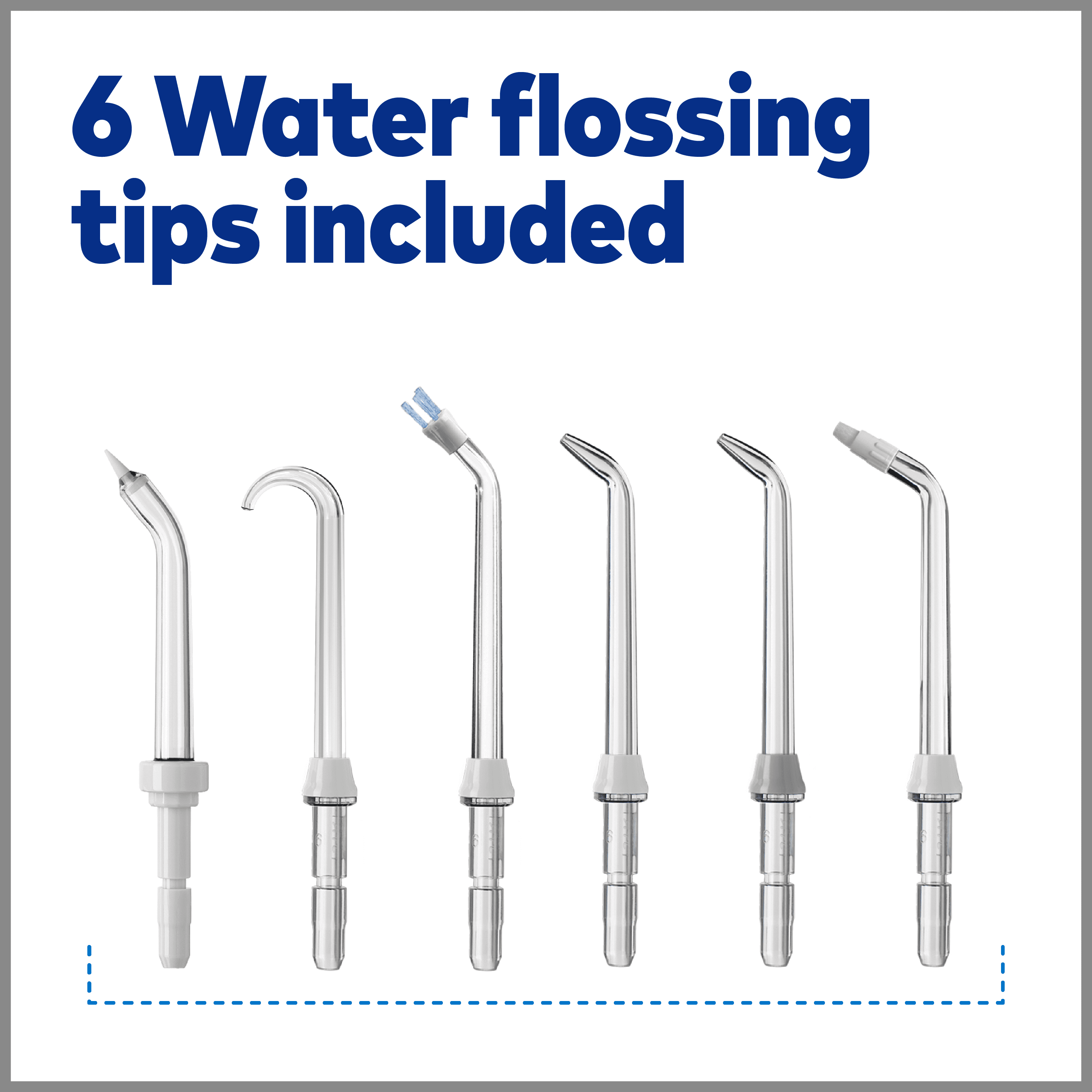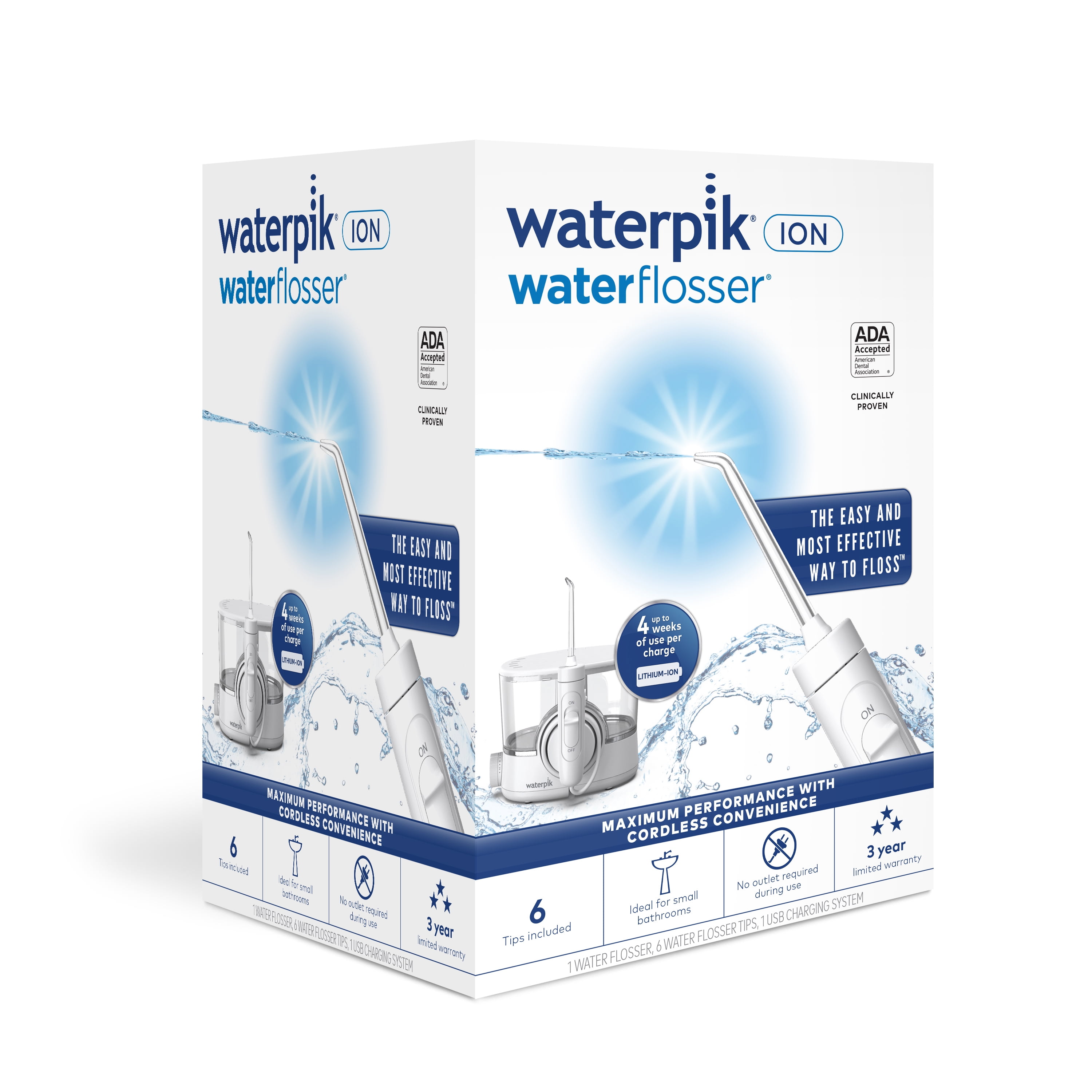 Dentist Recommended: Waterpik is the #1 water flosser brand, recommended by 9 in 10 dental professionals over other water flosser brands ADA Accepted: Waterpik is first water flosser brand to earn the American Dental Association (ADA) Seal of Acceptance for safety and effectiveness Clinically Proven: Only Waterpik brand water flossers are clinically proven by 70+ studies – they remove up to 99.9 percent of plaque from treated areas and are up to 50 percent more effective than dental floss for improving gum health Effective: The Waterpik water flosser helps protect your oral health between dental visits by thoroughly cleaning deep between teeth and below the gumline where traditional brushing and flossing can’t reach Model: Waterpik ION cordless countertop water flosser WF-11, the perfect combination with maximum water flosser performance and the convenience of a cordless design, comes with 6 color-coded flossing tips for multiple family members and dental needs Features: 10 pressure settings, a contemporary design 30% smaller than traditional plug-in water flosser models, ideal for small bathrooms, convenient and maneuverable swivel handle with on/off control and magnetic cradle, 22-ounce (650 ml) covered reservoir, 1-minute timer with 30-second pacer pauses briefly to remind you to floss all areas, advanced lithium-ion battery provides up to 4 weeks of use per charge In the Box: Waterpik ION water flosser (WF-11), 2 Classic Jet Tips (JT-100E) for general use, 1 Orthodontic Tip (OD-100E) for braces and orthodontics, 1 Pik Pocket Tip (PP-100E) for periodontal pockets, 1 Plaque Seeker Tip (PS-100E) for implants, bridges, and other dental work, 1 Toothbrush Tip (TB-100E) for manual brushing while water flossing, charging adapter Compatibility: 120VAC/60Hz outlets for use in North America only Warranty: Three-year limited warranty, visit waterpik.com/warranty or call 1-800-525-2774 for additional information Health Plan: May be covered by FSA/HSA. Contact your plan administrator regarding eligibility.