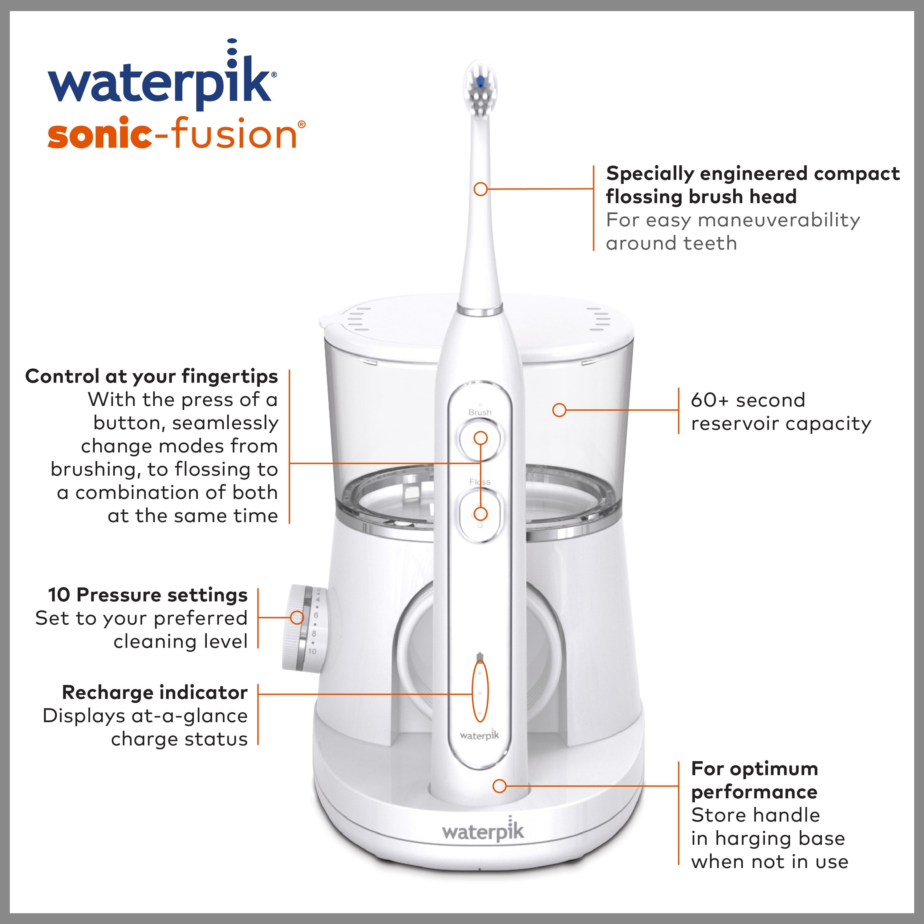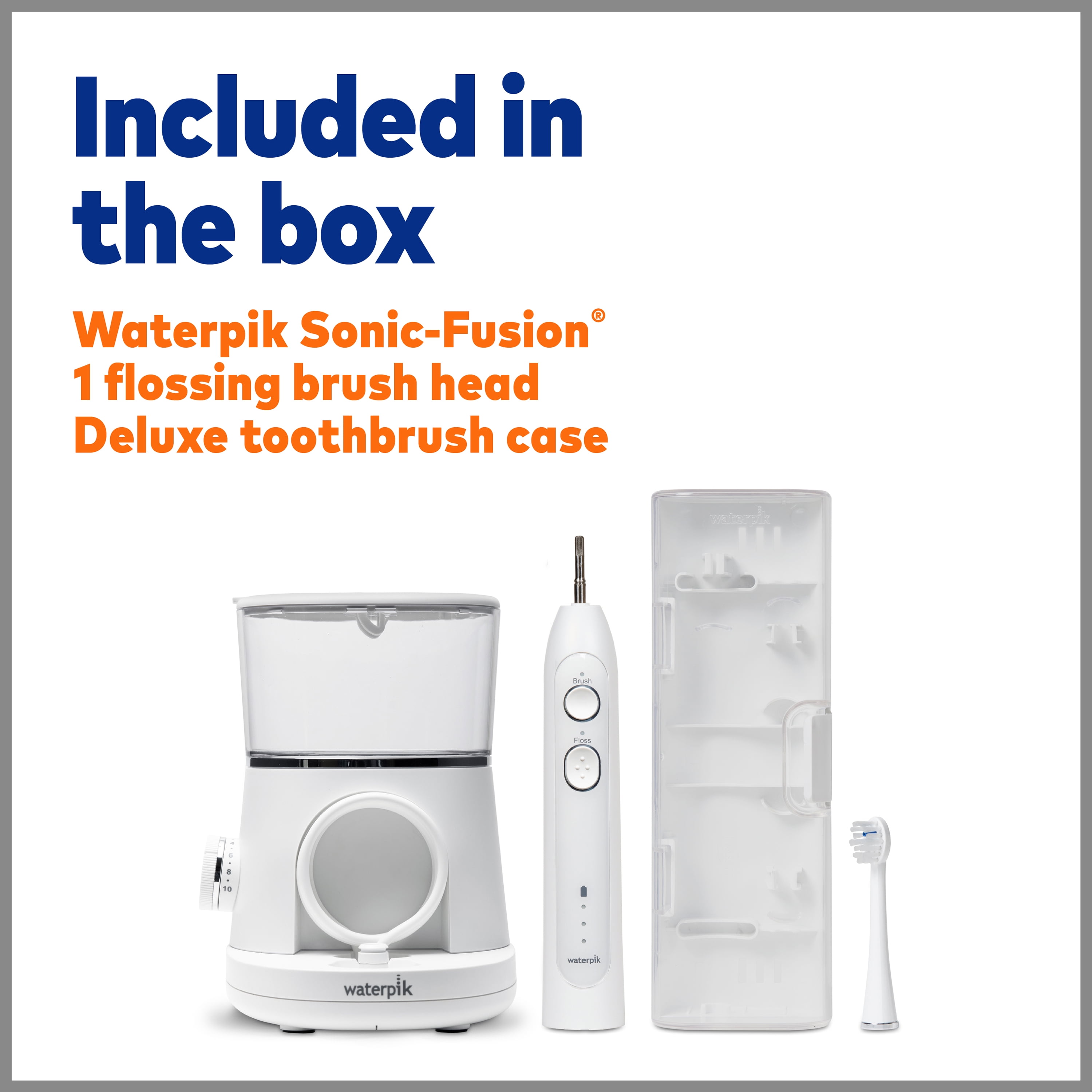 Waterpik Sonic-Fusion Electric Flossing Toothbrush, White: Brush & Floss At the Same Time: Sonic-Fusion combines the power of a sonic toothbrush with the proven effectiveness of a Waterpik Water Flosser Clinically Proven: Up to 2X as effective as traditional brushing and flossing for removing plaque and improving gum health; removes up to 99.9% of plaque from treated areas; accepted by the American Dental Association (ADA) 3 Modes at the touch of a button: Brush, Floss, Brush & Floss Includes 1 patented flossing brush head, 10 pressure settings, a contemporary compact design, 15-ounce covered reservoir with 60+ seconds of water capacity, 2-minute timer with 30 second pacer, and a premium toothbrush travel case Can be used with your favorite mouthwash Leaves your mouth feeling fresh and clean Three-year limited warranty, visit waterpik.com/warranty or call 1-800-525-2774 for additional information Global voltage compatible: 100-240 VAC, 50/60 Hz outlets Click here to view Waterpik Sonic-Fusion compatible brush heads May be covered by FSA/HSA. Contact your plan administrator regarding eligibility.