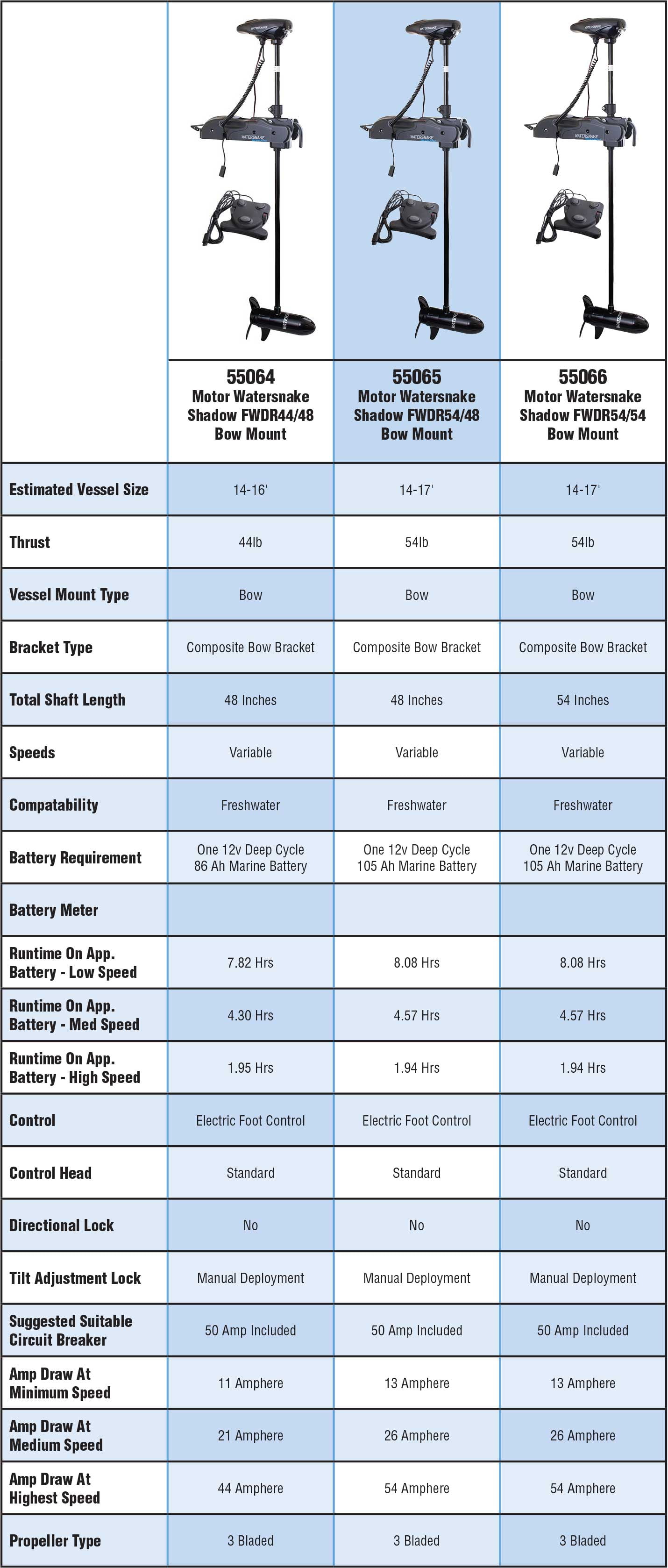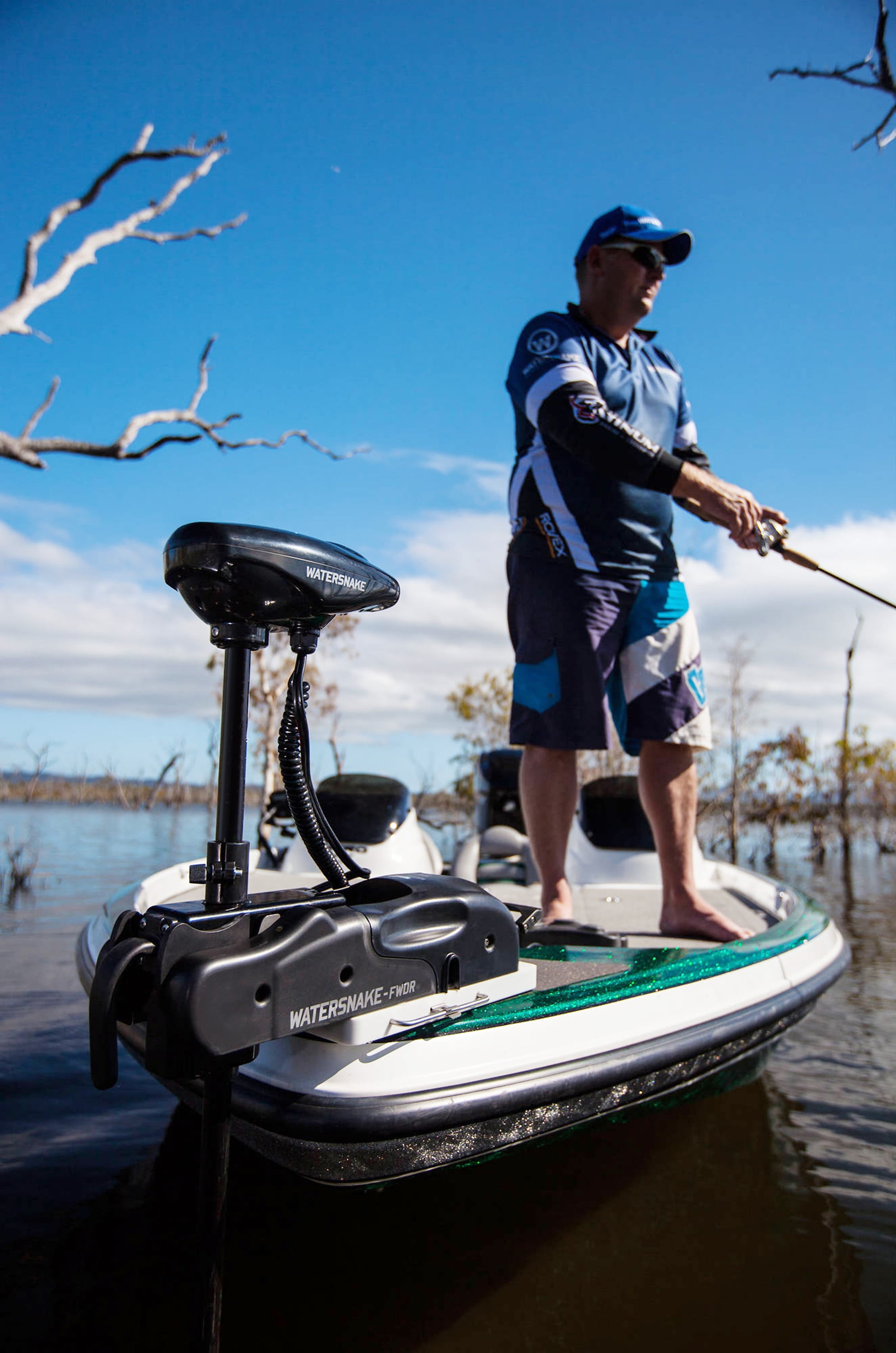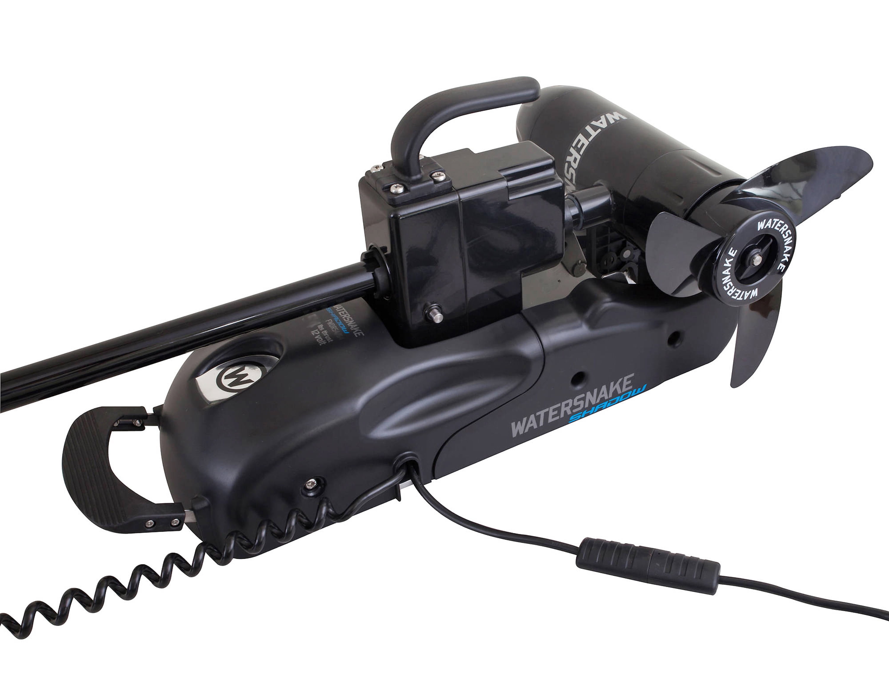 Take the motor to favorite spots out on the river or lake and fish for hours with confidence. Contact the distributor for additional information. Watersnake Shadow FW 44/48 BM Features: Suitable for a variety of small watercraft Bow mount Electric foot controls High and low-speed control Forward and reverse switch Thrust: 44lb Volts: 12V Amps: Max 44 Shaft: 48″ bow, stainless steel Prop: 3 blade, weedless design Warranty: 1-year, contact distributor for info Bow-mounted electric trolling motors are easy to install Utilize this trolling motor out on the river or lake and fish for hours with peace of mind