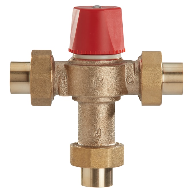This 1/2 inch lead free hot water control valve is designed for installation on water heating equipment to provide tempered water to point-of-use fixtures and is ideal for radiant heat applications. The double throttling design combines hot and cold water control for a sensitive response to water temperature changes in the mixing chamber. It consists of a lead free brass body, solder union connections, solid wax hydraulic principle thermostat, integral filter washers and check valves, virtual shutoff upon loss of cold water supply, and a locking mechanism for the temperature setting. The maximum pressure is 150 PSI (10.3 BAR).