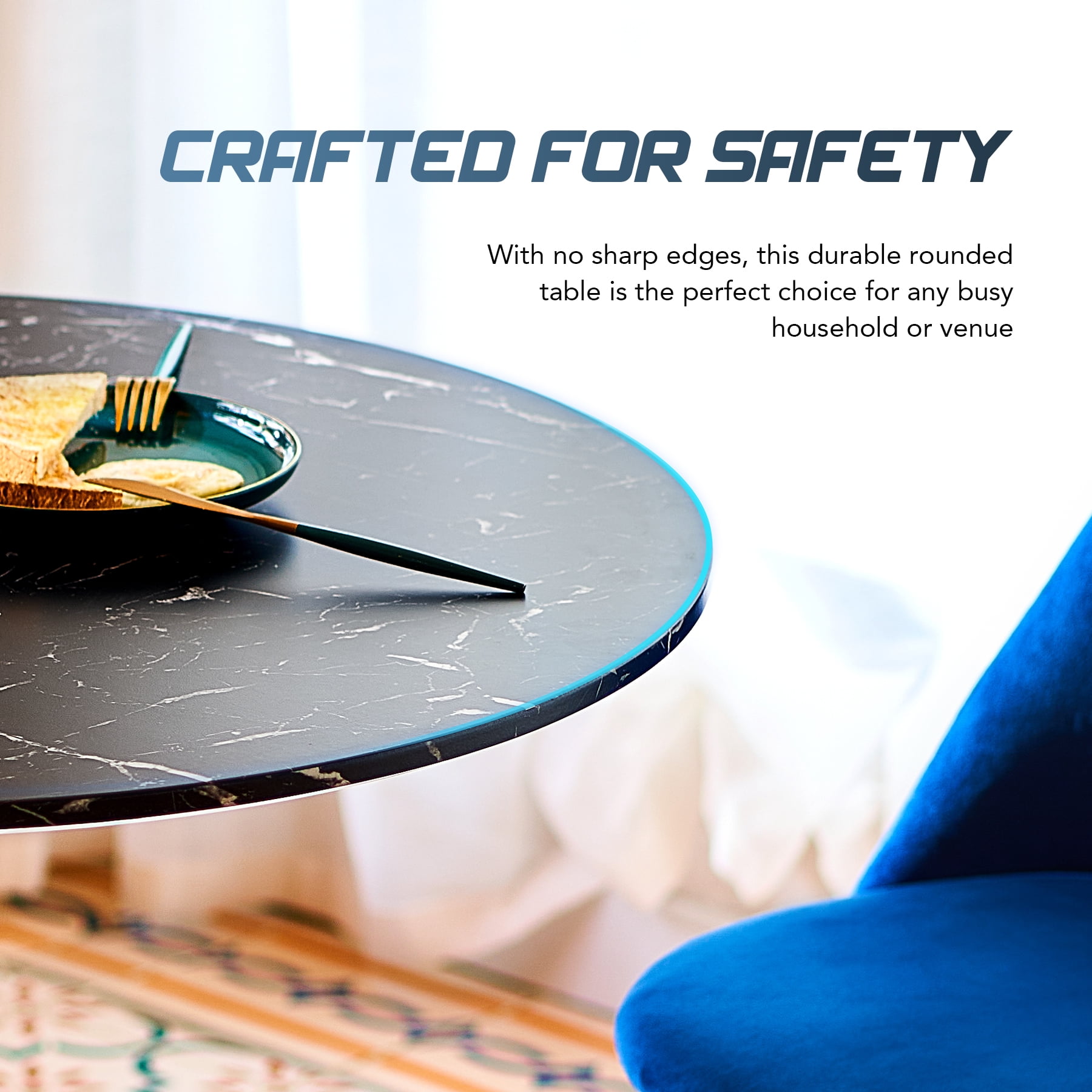 NOOK FOR 2-4: Without defined edges and designated sides, this round dining table creates a romantic nook for two but also allows you to squeeze in another 2 chairs for a small family gathering or bestie party CONTEMPORARY STYLE: The slim footprint and the elegant marble accents of this round dining table make it an ingenious addition to any dining room or eat-in kitchen, seamlessly blending with room decors from modern minimalist to farmhouse boho MADE TO LAST: The beautiful marble veneer over the MDF tabletop is scratch-resistant and super easy to clean while the metal frame and base are sturdy enough to hold up to 165 pounds and are also lacquered to last through years of dinner parties EXCEPTIONALLY STABLE: The nearly 20-inch tulip pedestal is weighted to anchor your coffee table in place on any flooring but meanwhile does not invade your leg space, keeping things from getting wobbly or too crowded under the table SET UP IN MINUTES, LAST FOR YEARS: Predrilled holes underneath the tabletop guide quick and easy assembly, with all necessary tools included. You’ll be done in minutes: just align the legs, tighten their bolts, and enjoy! Round, rectangular, or square? If you’re looking for a dining table that takes up less space, creates a more intimate setting, and promotes easy-flow conversations, you should definitely go with the round one! This understated round dining table smartly combines a sleek shape and vintage marble accents, instantly bringing your dining and entertaining experience to a new level. Measuring 31.5 inches in diameter, our kitchen table has a small footprint but still works well in spaces both small and large. Perfect for everything from impromptu family parties to card games with friends, this dining room table carves out a relaxing dining nook for parties of 2-4. The MDF tabletop and sturdy metal frame strongly hold up to 165 pounds. Don’t be fooled by the beauty of the tulip base to assume this table is a delicate piece of furniture. The tulip metal pedestal not only makes it easy to gather chairs around but also makes the dreaded table-wobble a thing of the past. Easy to assemble, this functional yet elegant modern accent table is ready to welcome you into the minimalist world and certain to brighten your life for years to come. Specifications Material: MDF, Metal, Marble Veneer Color: Black Tabletop Diameter: 31.5 in. (80 cm) Height: 29 in. (74 cm) Base Diameter: 19.6 in. (50 cm) Seating Capacity: 2-4 Weight Capacity: 165 lb. (75 kg) Net Weight: 26.5 lb. (12 kg) Package List 1 x Round Dining Table 1 x Instructions
