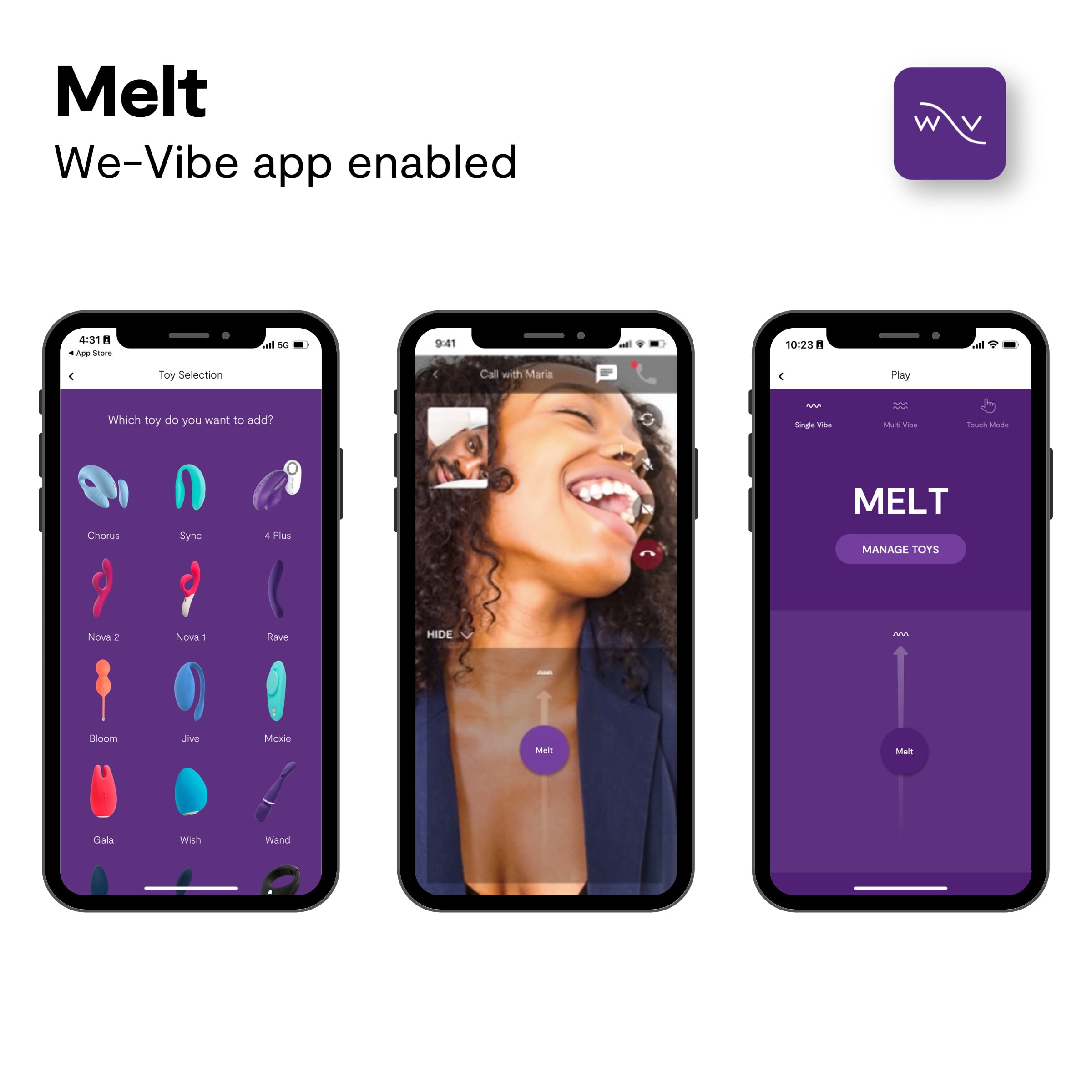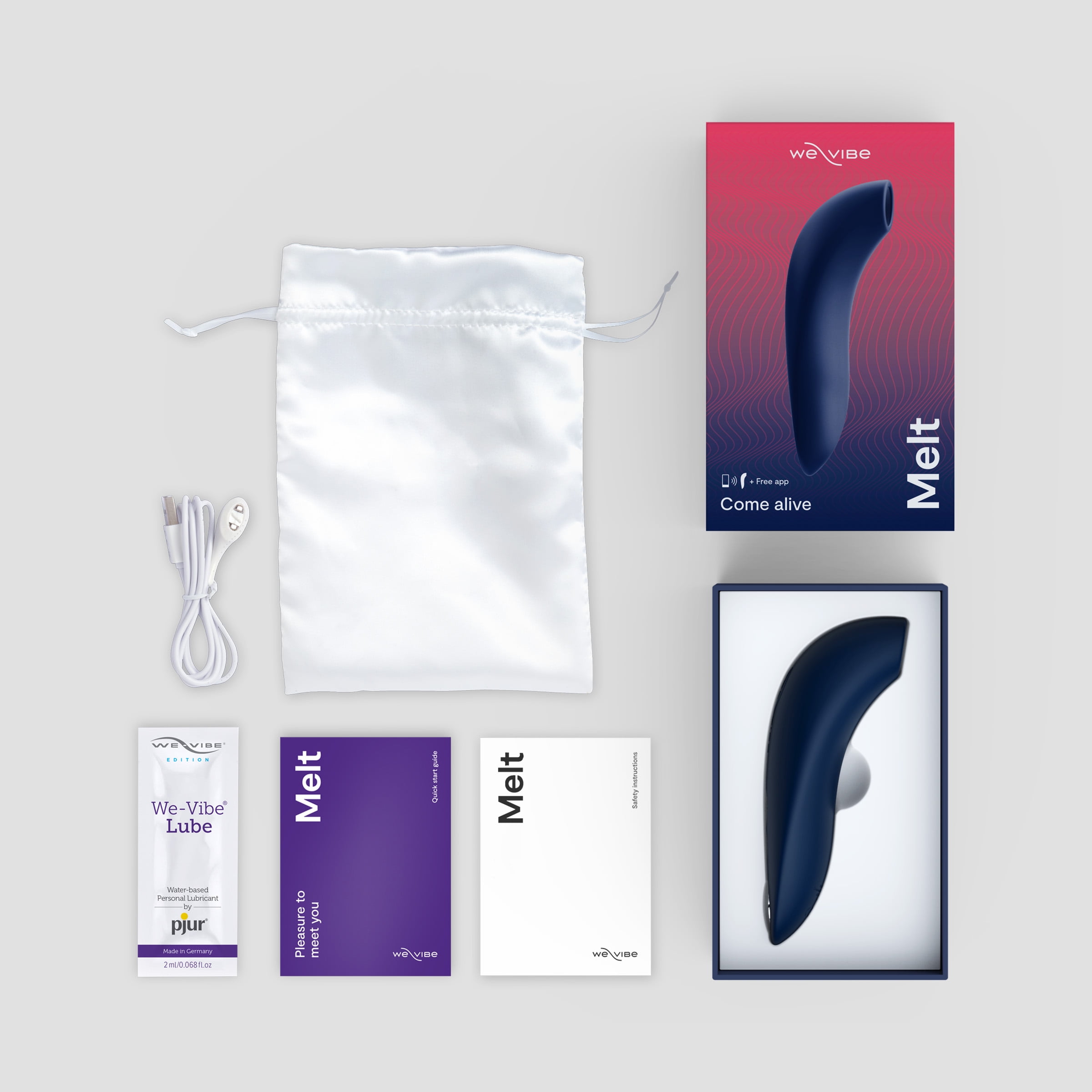 12+ intensity levels – Intensify pleasure sessions with 12+ intensity levels, including custom stimulation in the free We-Vibe app. USB rechargeable – Experience up to 2 hours of uninterrupted play when fully charged. We-Vibe app control – With the free We-Vibe app you can play and share control of Melt from anywhere, access Melt’s full range of intensity settings, as well as play together with other We-Vibe toys. Body-safe silicone – Made with body-safe silicone, produced without phthalates, BPA or latex. Waterproof (IPX7) – Melt is 100% waterproof, making it easy to enjoy anywhere and simple to clean.