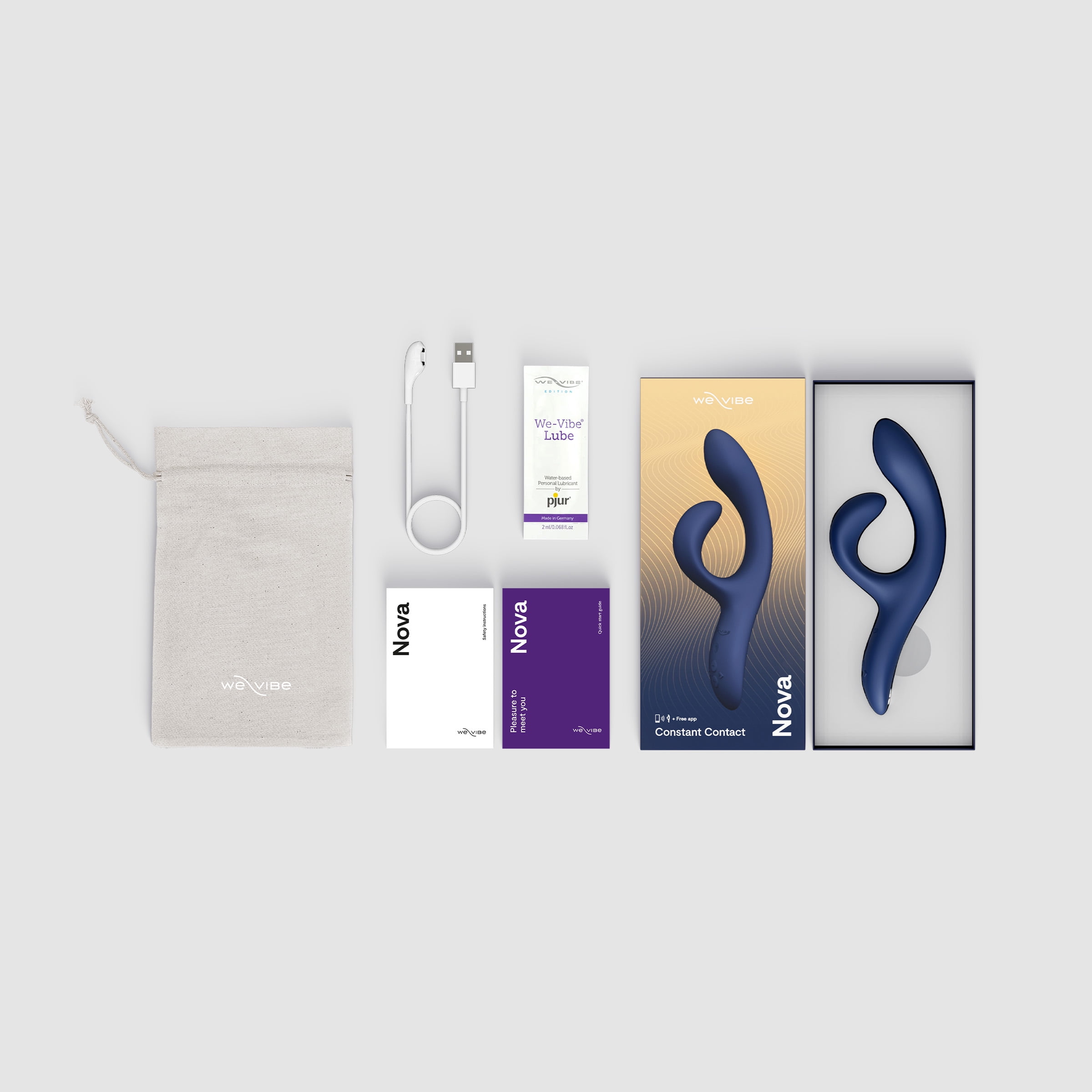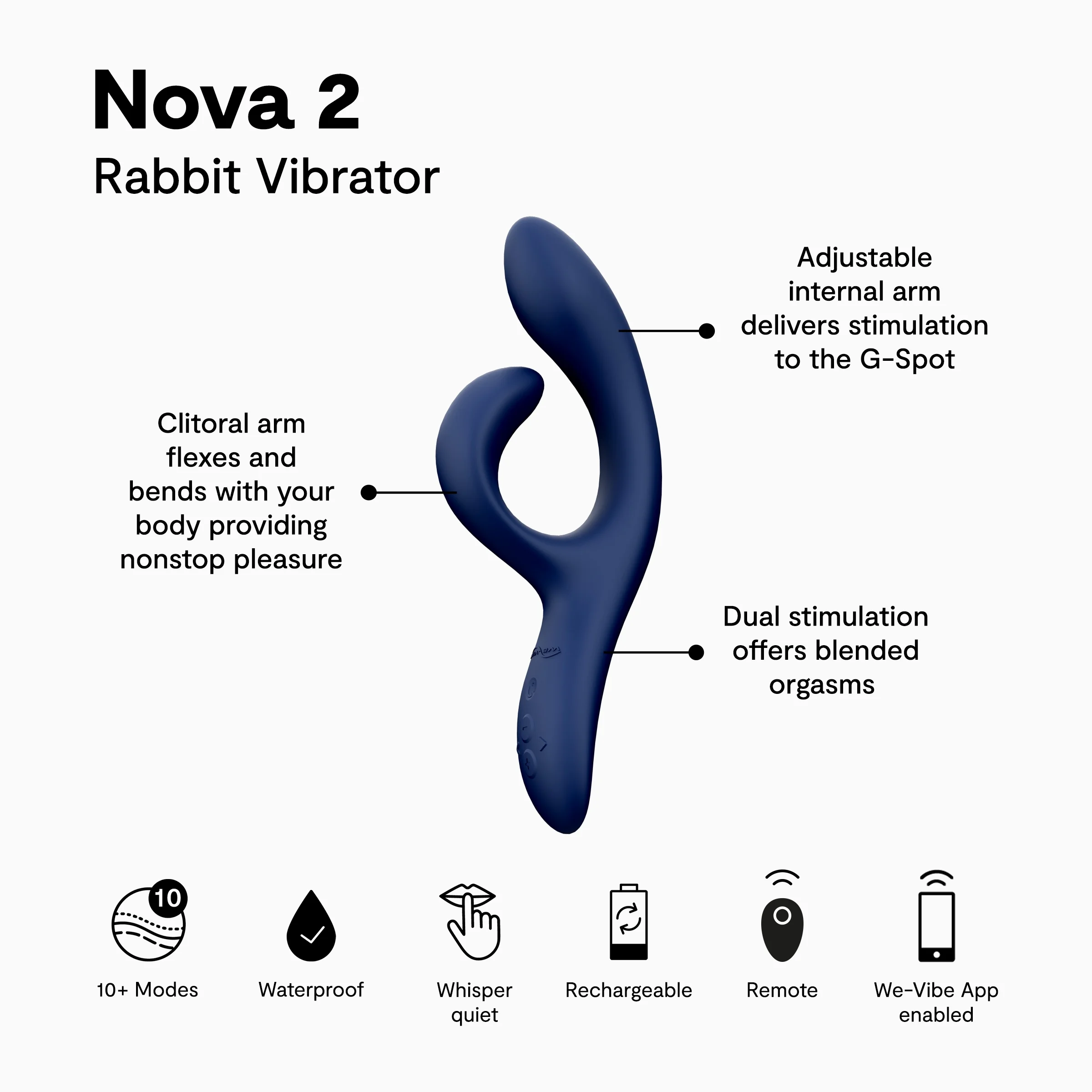 The We-Vibe Nova 2 Dual Stimulation Rabbit Massager offers non-stop pleasure, even during your wildest moves. Experience a blended orgasm with the best rabbit vibrator through clitoral and G-Spot stimulation. The new and improved Nova flexes with you, keeping constant contact with your pleasure points, inside and out. Sleek and stylish, our take on the classic rabbit sex toy vibrator is adjustable, features two whisper-quiet motors, and 10+ vibration modes for customizable pleasure. With the free We-Vibe app, you can play and share control of Nova 2 from anywhere, create custom vibes and play together with other We-Vibe products. The We-Vibe Nova 2 Dual Stimulation Rabbit Massager is 100% waterproof, making it easy to enjoy anywhere and simple to clean. Key Features