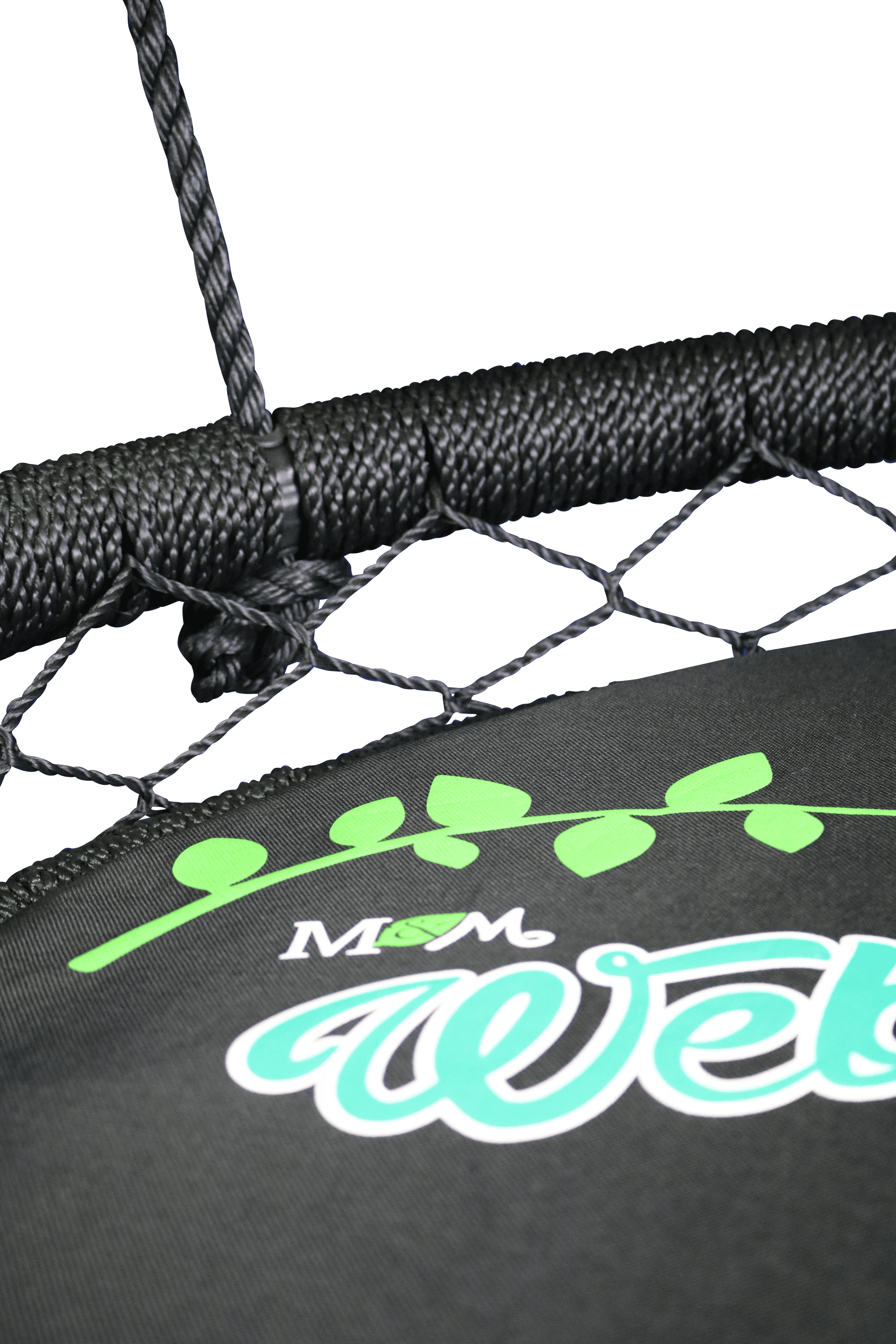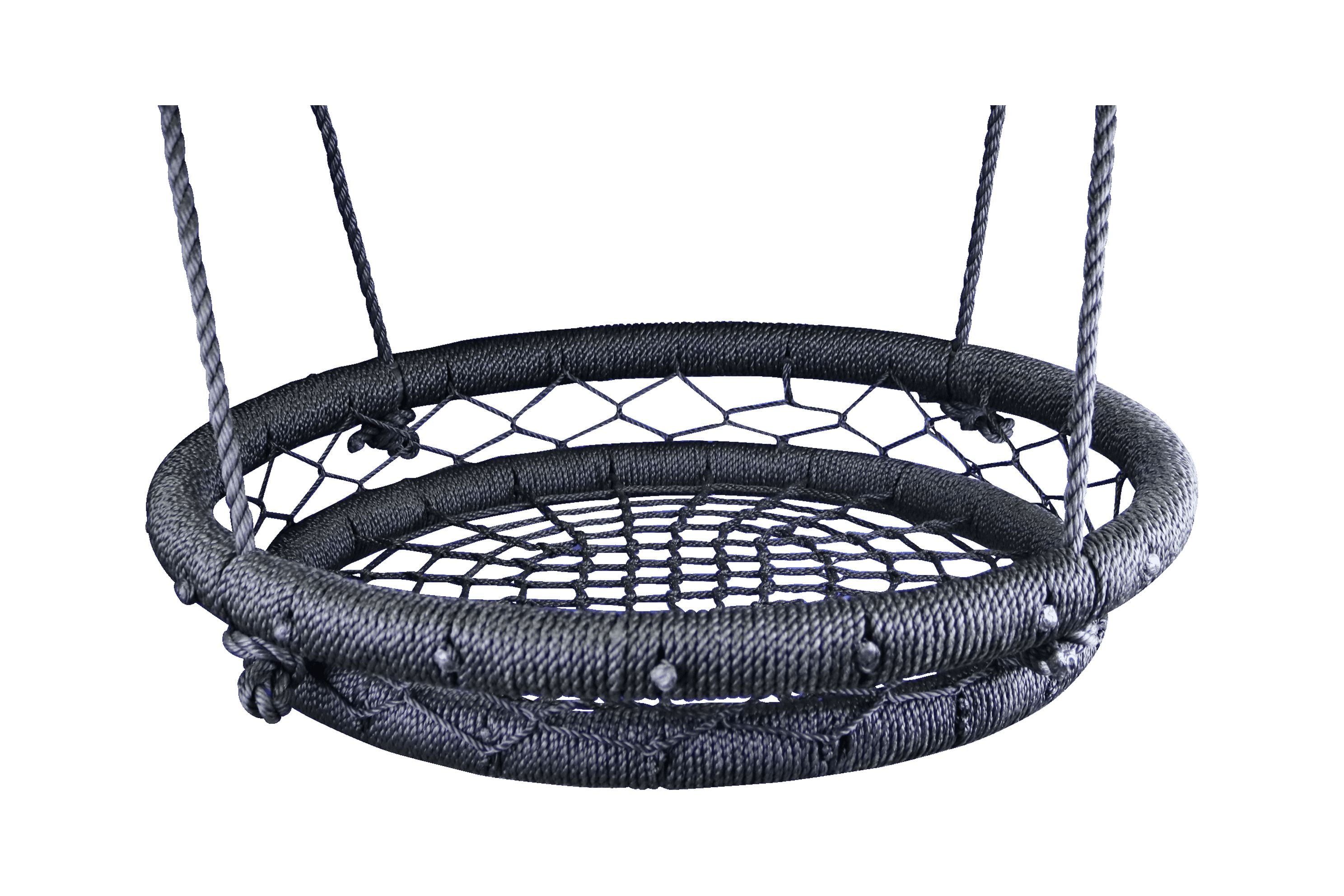 Comfortable hammock-style swing for kids and adults Steel tube frame with elastic rope web seat All-weather 3-layer padded cushion for extra comfort Includes polyethylene rope for hanging Supports up to 600 pounds and safe for ages 5 and up Includes 4 steel spring clips for easy attachment Color: Black Dimensions (L x W x H): 39 x 39 x 9 inches Weight: 23 pounds Manufacturer warranty: 90-day warranty