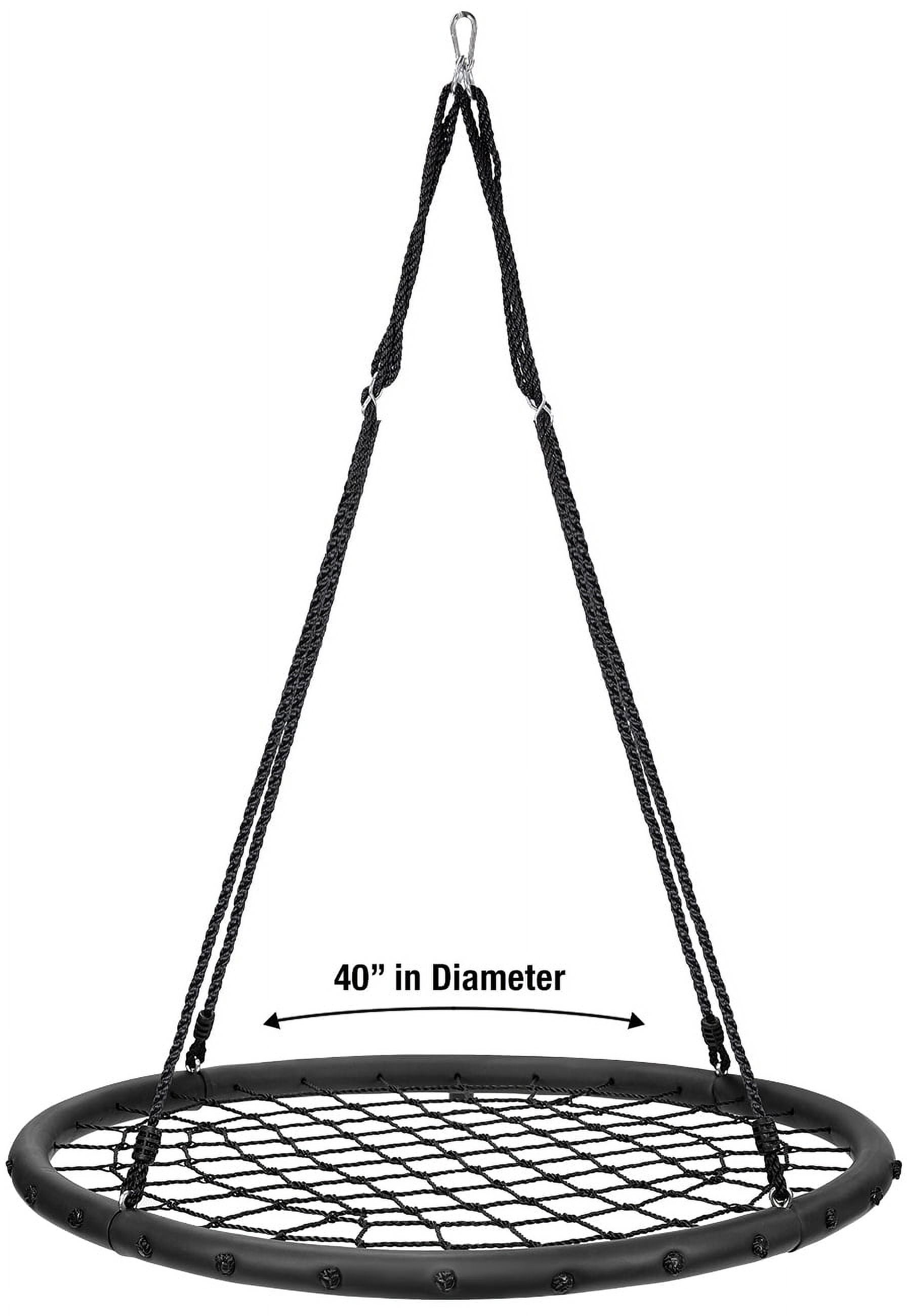 ADORABLE KID’S SPINNER SWING (40″ NET SEAT) – Provides a fun hang out space for kids to safely spin or swing into action during playtime GREAT FOR OUTDOOR PLAY – Can be used as chair swing for tree, hammock swing for swingset, nest swing chair, swings for playsets, and more to encourage imaginative play and promote balance – Creates the perfect lounging space to play, read, listen to music, daydream, relax, nestle into a cocoon, bounce, twist, spin, and enjoy playtime with friends and family – Perfect gift for kids, grandchildren, playmates, birthday, Christmas, outdoor picnic, BBQ, party COMFY HANGING SEAT – Rope seat cushion provides super comfy ride – 2-3 person swing kids will enjoy comfortably – Holds up to 220 lbs for safe riding experience – Provides superior strength while keeping swing in place EASY TO INSTALL – Hang within minutes! Quick and easy assembly saves time and hassle – Designed for secure installation – Top of ropes have steel rings which connect to sturdy suspension rope up to approx. 63″ long from base to connection point – Hangs almost anywhere from a sturdy tree branch to swing set – Can be re-located or taken down for easy storage DESIGN SPECIFICATIONS – Heavy-duty spider web design features tough rope net seat with thick woven nylon material (Rope seat is:5mm PE ), frame for kids swing is steel tube – Package includes swing, mounting accessories, and instructions – Adult supervision and assembly required – Recommended for children 5+ years – Fun for adults too! – Maximum Weight is 220 pounds – Maximum Tilt is 45° – Measures approximately 40″ D x 63″ H