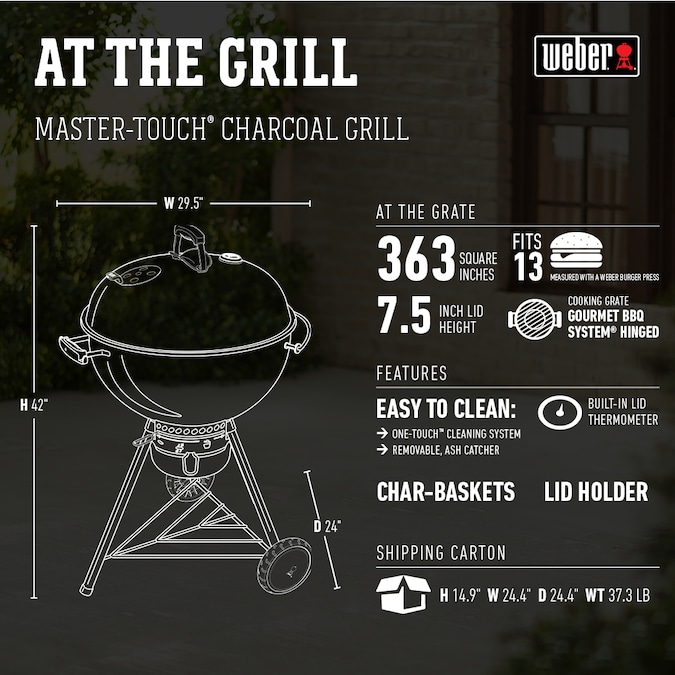 The ritual of charcoal grilling meets the convenient features and the wow factor of the Weber Master-Touch. Equipped with a hinged Gourmet BBQ System cooking grate, you’re also able to purchase additional inserts, like the wok or griddle, to cook smoky chili or breakfast outside on the grill. Equipped with a Tuck-Away lid holder for convenient lid placement, taller legs and Char-Basket fuel holders for easily arranging briquettes, all you need to focus on is mastering your dish.