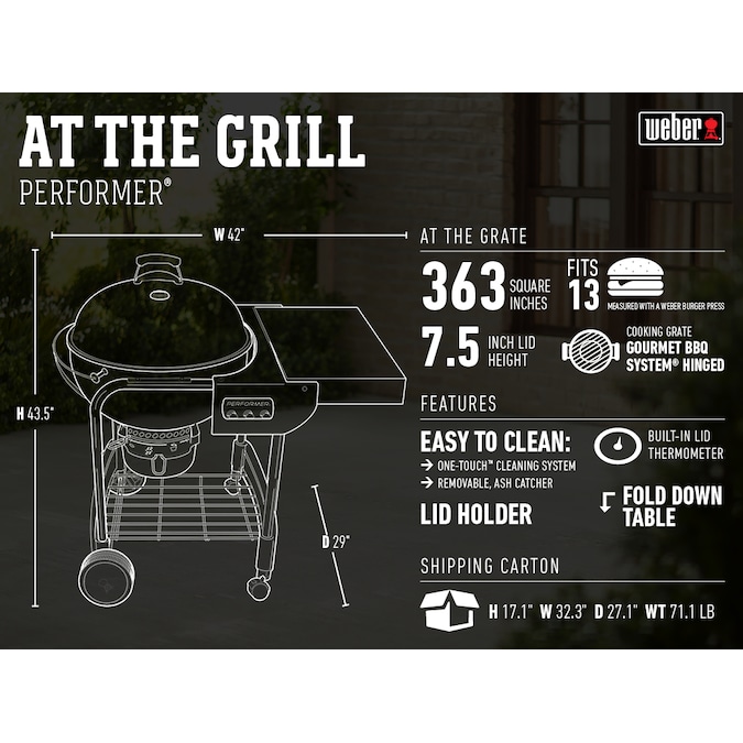 The powerful performance and convenient features of the Performer® charcoal grill is your excuse to ignite the coals every day. Prep food on the work table, hang grilling accessories from the tool hooks, and then clean up with ease—but only after you’ve taken every last bite of your perfectly grilled meal.