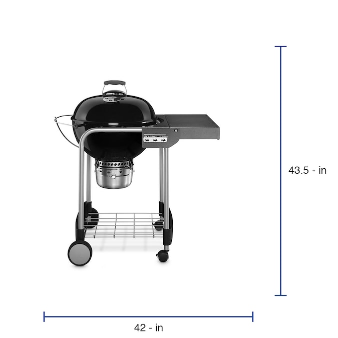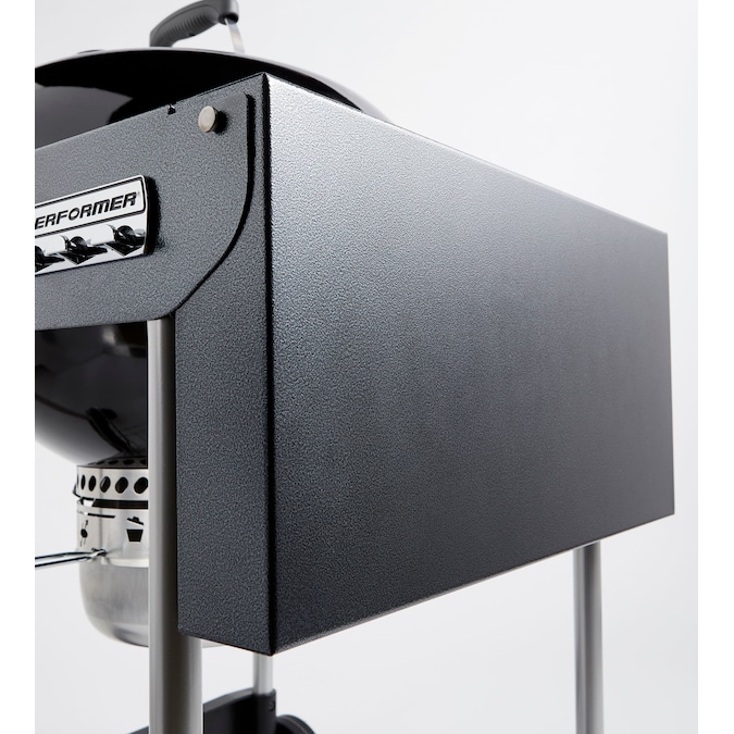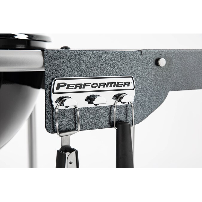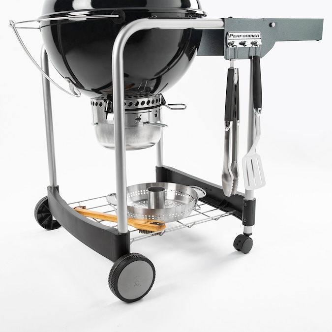 - Weber Performer charcoal grill features a wire bottom shelf for extra storage