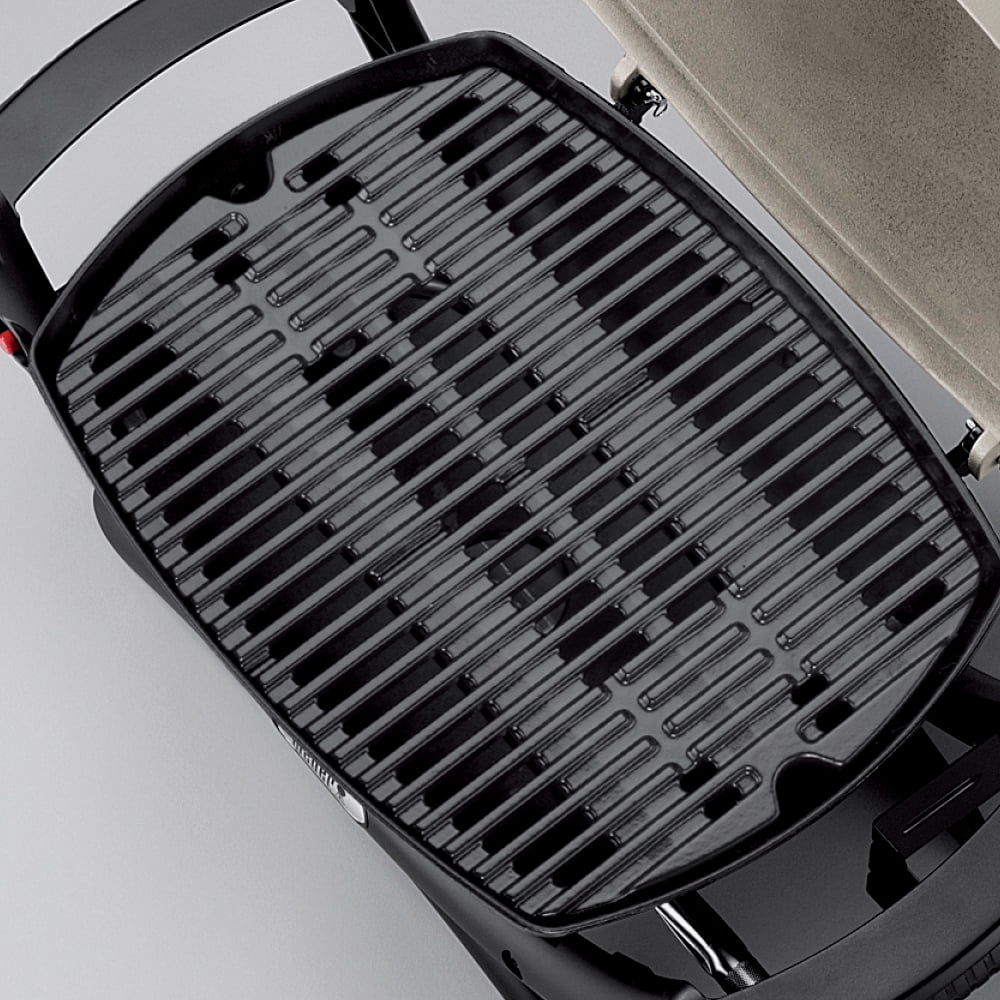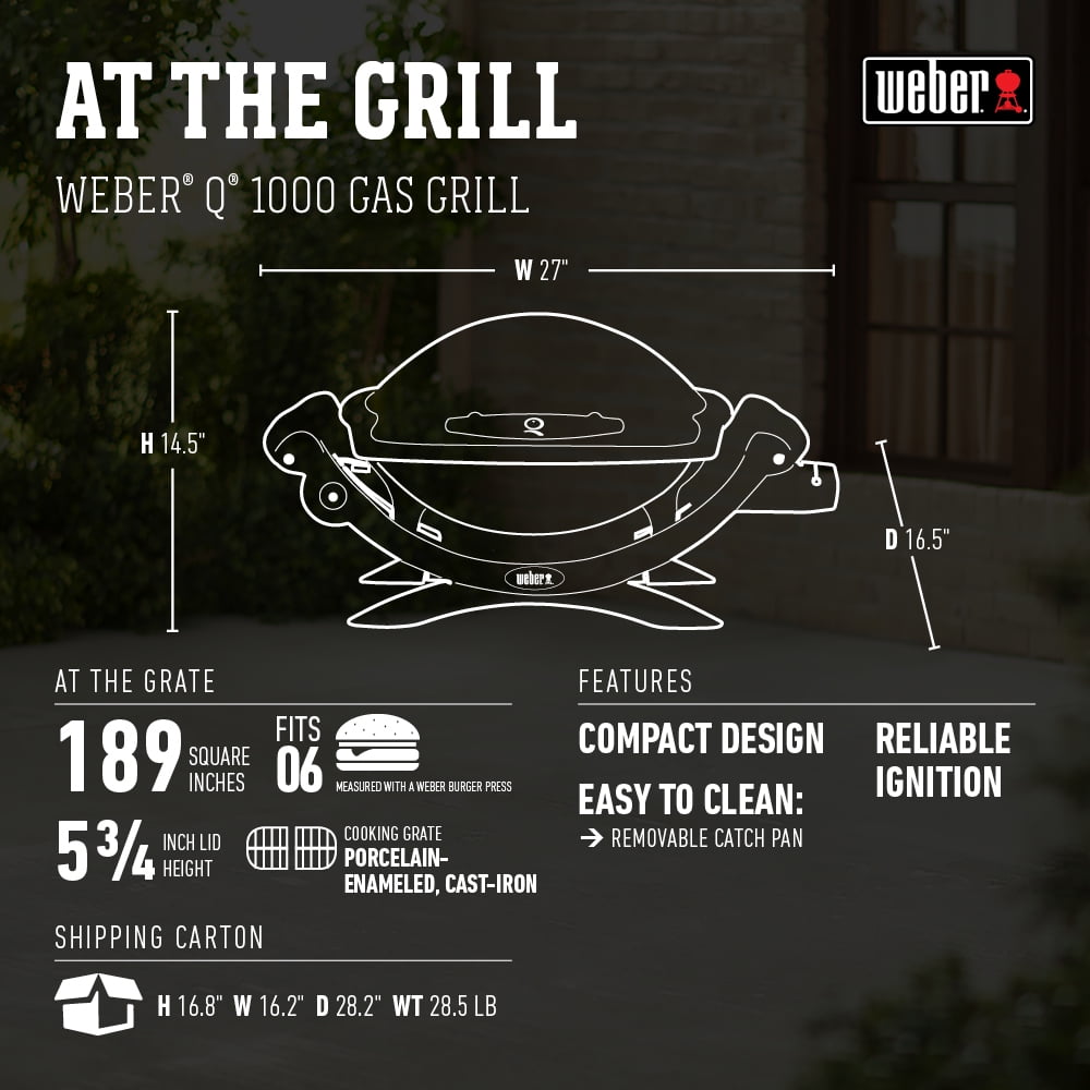 Weber Q 1000 Portable Propane Gas Grill – Titanium – 50060001. 50060001. Portable Gas Grills. Ready, set, grill on the go! The Weber Q 1000 portable gas BBQ grill offers 189 square inches of cooking space to create the grilled foods you love anytime, anywhere. Weber Q gas grills are perfect for tailgating, camping or small spaces like apartment balconies. With the push of a button, the grill ignites quickly and easily. The durable stainless steel burner produces 8,500 BTUs and the infinite control burner valve allows you to set it to the precise temperature you need with an easy-to-use knob. This Weber portable gas grill features a two-piece, porcelain-enameled cast iron cooking grate that heats evenly across its surface. It also features a cast aluminum lid and body with drip ducts and a sturdy glass-reinforced nylon frame and handles. A removable grease catch pan is included to make clean-up easy. This Weber Q 1000 operates on a portable 14. 1 or 16. 4 ounce propane cylinder (not included). An optional 20-lb tank adaptor hose is available as an accessory for those times you need to feed larger groups. Weber Q recipe booklet is included….