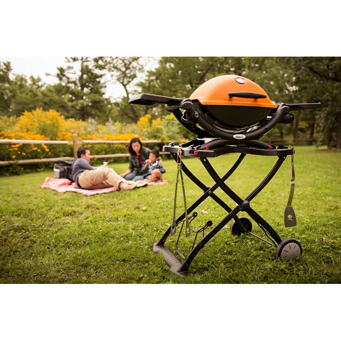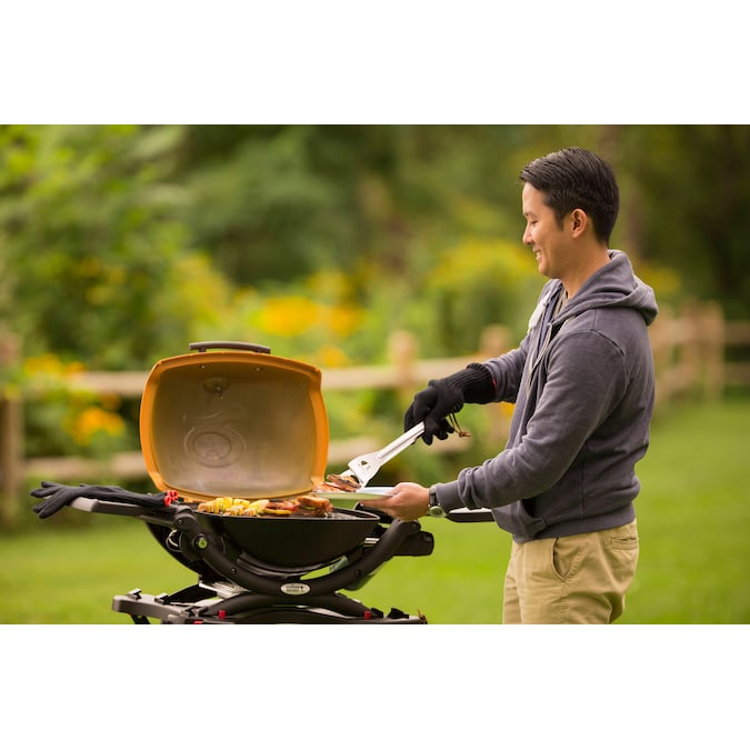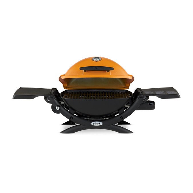 Great for tailgates, picnics, camping or any time you’re on the go, this Weber Q 1200 portable gas grill is the perfect size to travel with you. With just the push of a button, the electronic ignition has your grill fired up and ready to cook in minutes. The Q 1200 comes with big grill features, like two fold-out side tables for more prep space, and a built-in thermometer to monitor the inside temperature. With 189 Sq. In. of cooking space, having enough room to grill your favorites is never an issue. Whether it’s chicken, hot dogs or even a small roast, you can prepare it all on this grill. Its stylish, orange lid will make a statement wherever you are, but the tasty treats will be what everyone raves about.