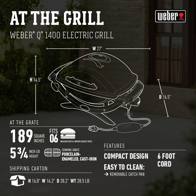 Electric grill, 189 Sq. In. cooking area, designed for the urban griller for residences with gas or charcoal grill restrictions. 5 Year limited warranty.