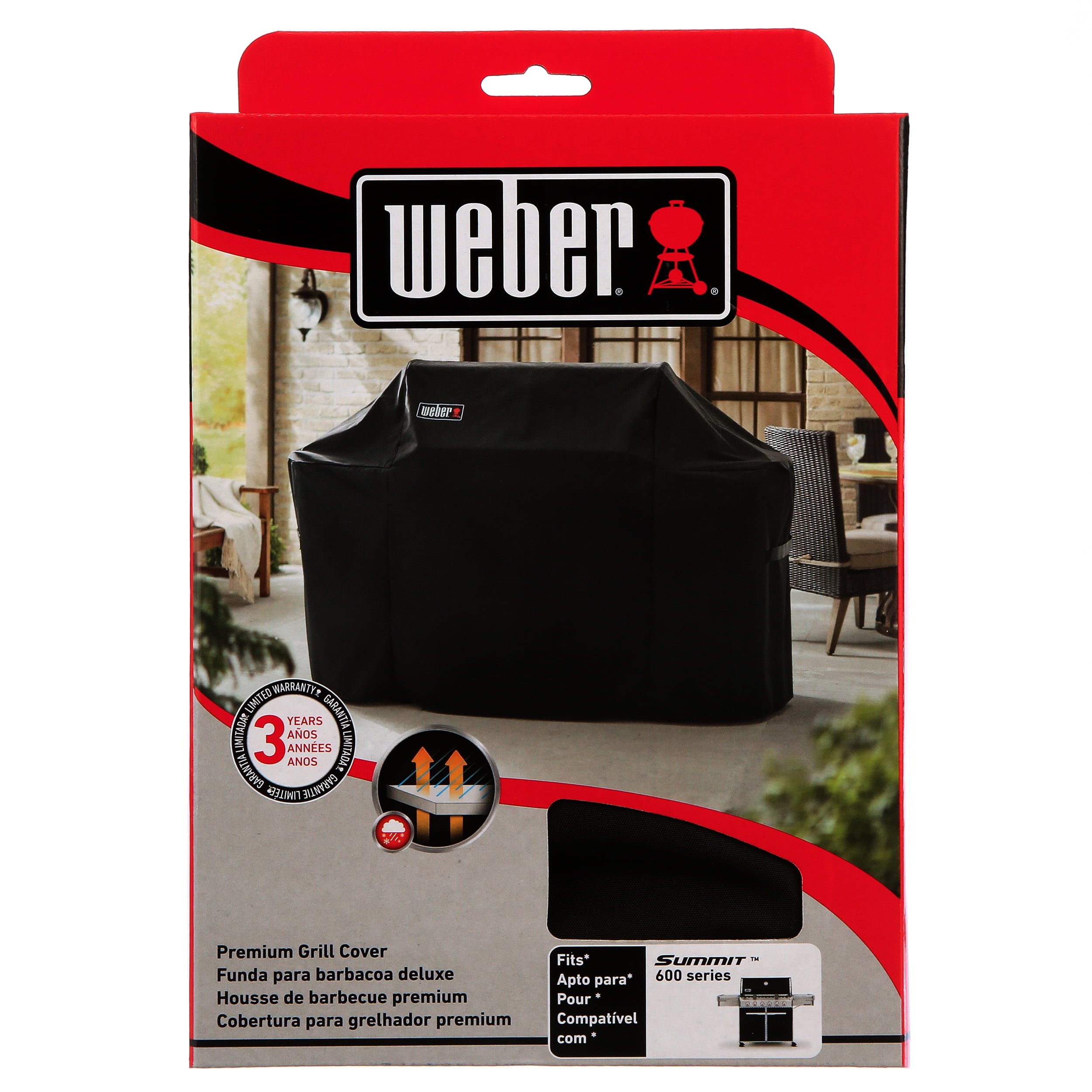 Weber Summit 600 Series Grill Cover: Fits Summit 600 series gas grills 100% polyester Velcro straps create a snug fit All-weather fabric is waterproof, UV resistant and breathable Weber grill cover includes a drawstring storage bag sewn into seam Features a lightweight, easy to use design 3-year limited warranty
