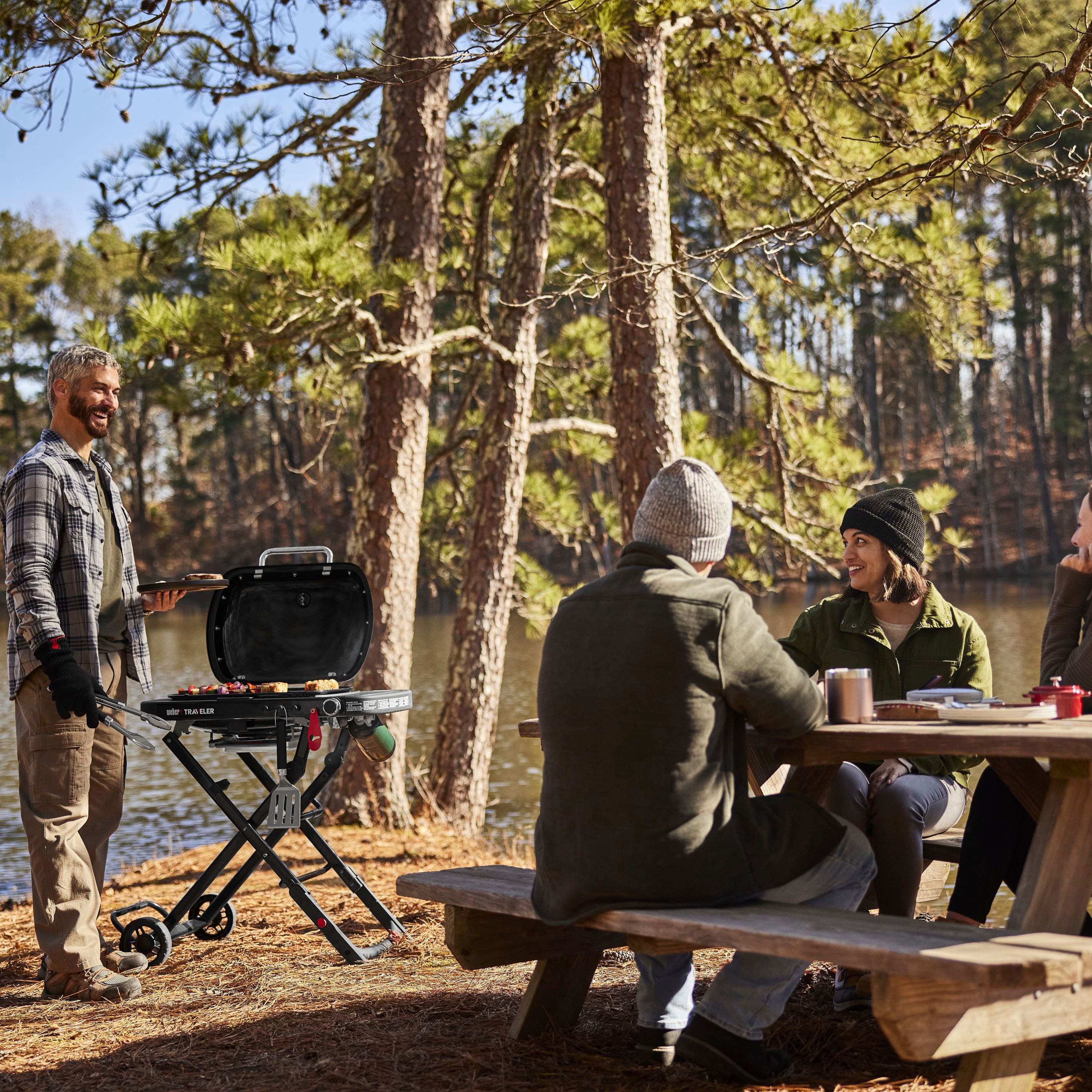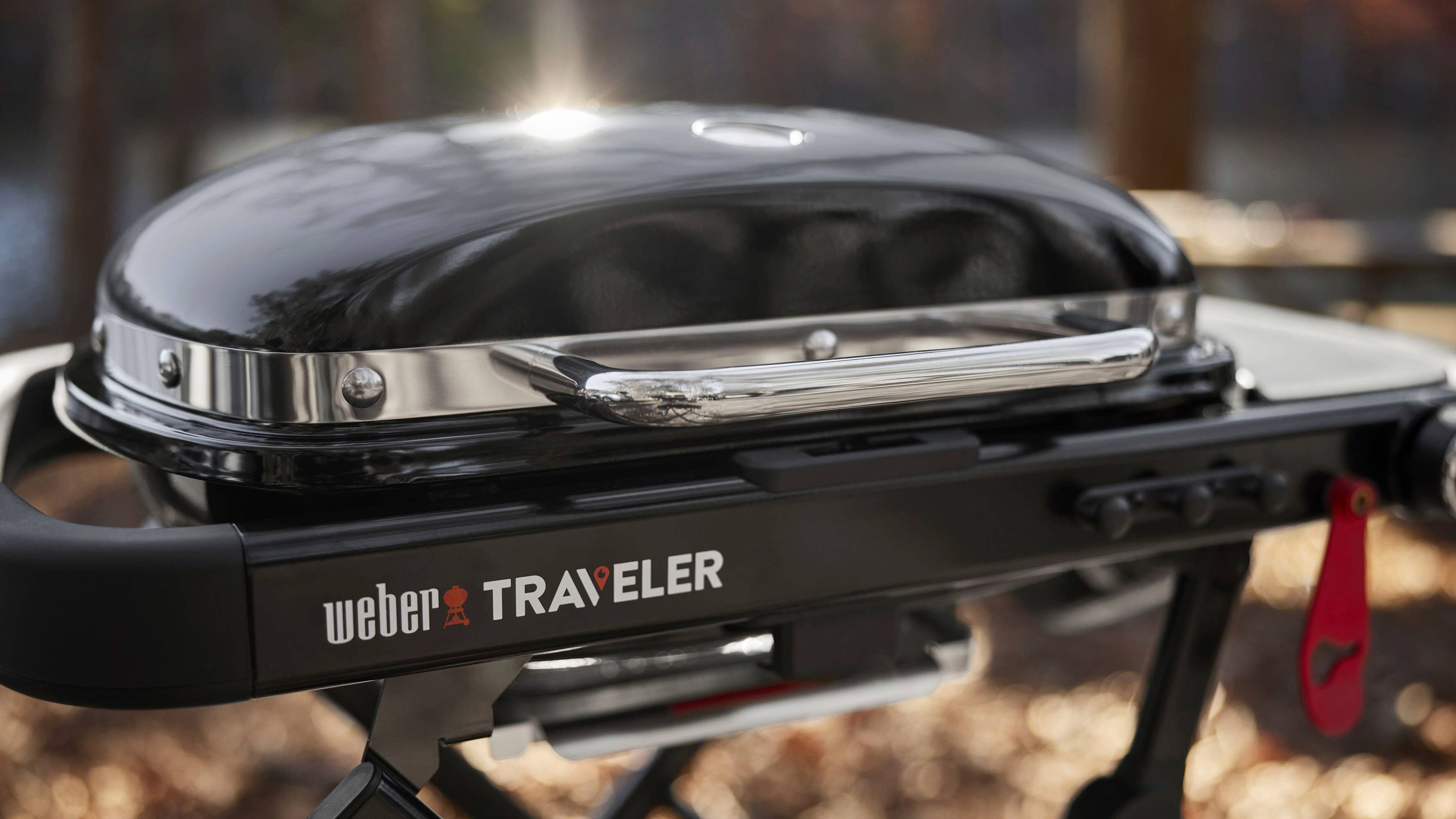 Make grilling part of your next outdoor adventure with the Weber Traveler Compact Portable Gas Grill. At 32” wide and only 37 pounds, it’s 20% smaller than the original Weber Traveler Grill and fits easily into the trunk of most compact cars. Sturdy one-piece design with automatic lid lock makes it easy to take anywhere, from the trail to a tailgate. Raise the grill with one hand and get cooking, with plenty of room to make a meal for four.