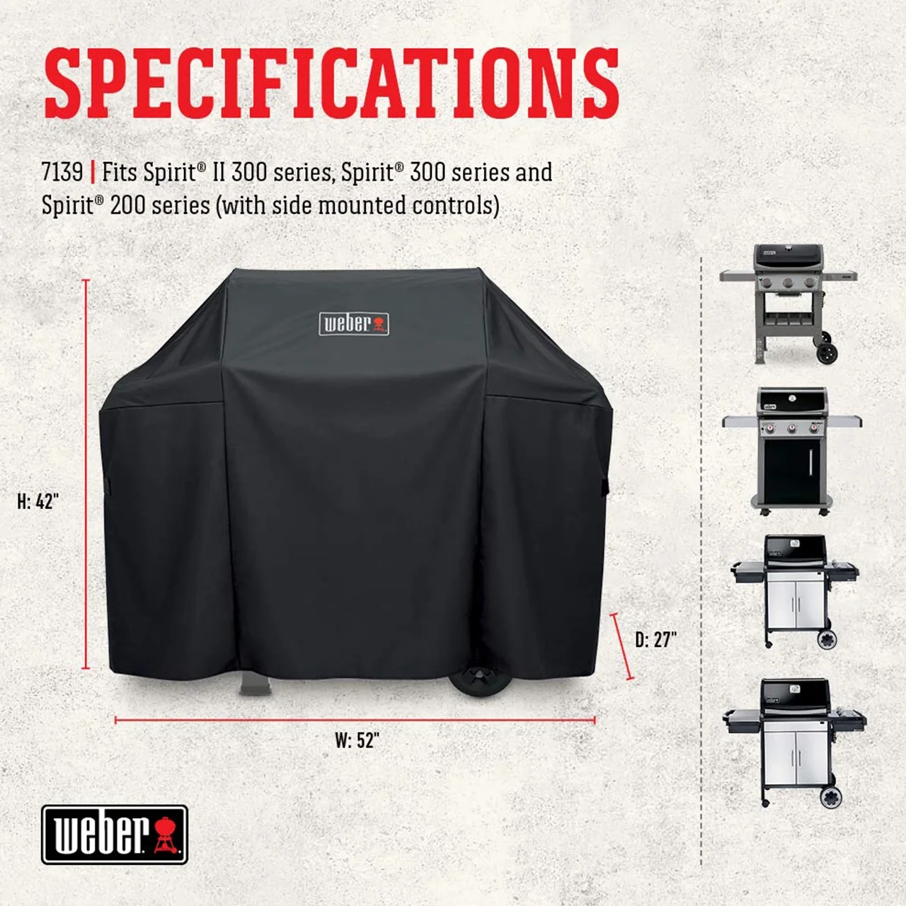 Webor 7.00 x 4.00 x 11.00 Inches 300 Series Premium Grill Cover UV inhibitors in fabric resist fading Breathable and water resistant to help protect the grill from the elements Fastening straps keep the cover in place Material: Polyester Fits Spirit 300 and Spirit II 300 Series gas grills