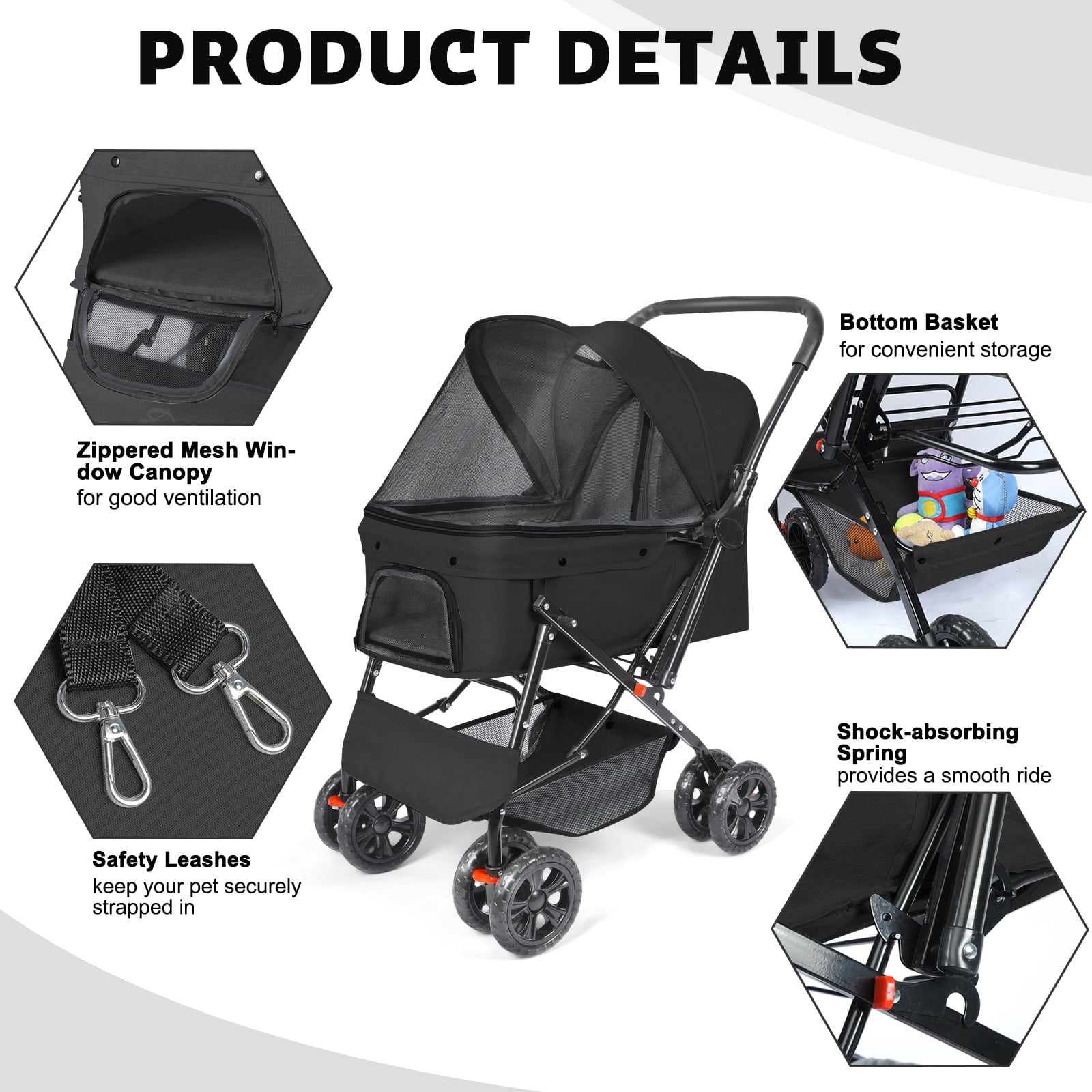 Wedyvko multifunctional 4wheel pet stroller is smooth and easy to use. The pet rest area is covered with multi-directional breathable nets to enjoy the fresh air and protect your pets from insects. Equipped with a storage basket for easy storage of items. The pet stroller can be folded easily and compactly enough to fit into the trunk of the car. It is a great choice to bring your pet, walk, jog, travel and enjoy the outdoors together. Stay organized on the go with the large storage basket underneath the stroller. Carry your pet’s essentials such as water bottles, treats, toys, and more, so you have everything you need at your fingertips. Product information: Color:Black Frame Material:Alloy Steel Size:40*30*20.5 in Maximum weight recommendation:44 lb Quick Folding:One hand quick folding 1*Pet Dog Stroller 1*Installation Manual