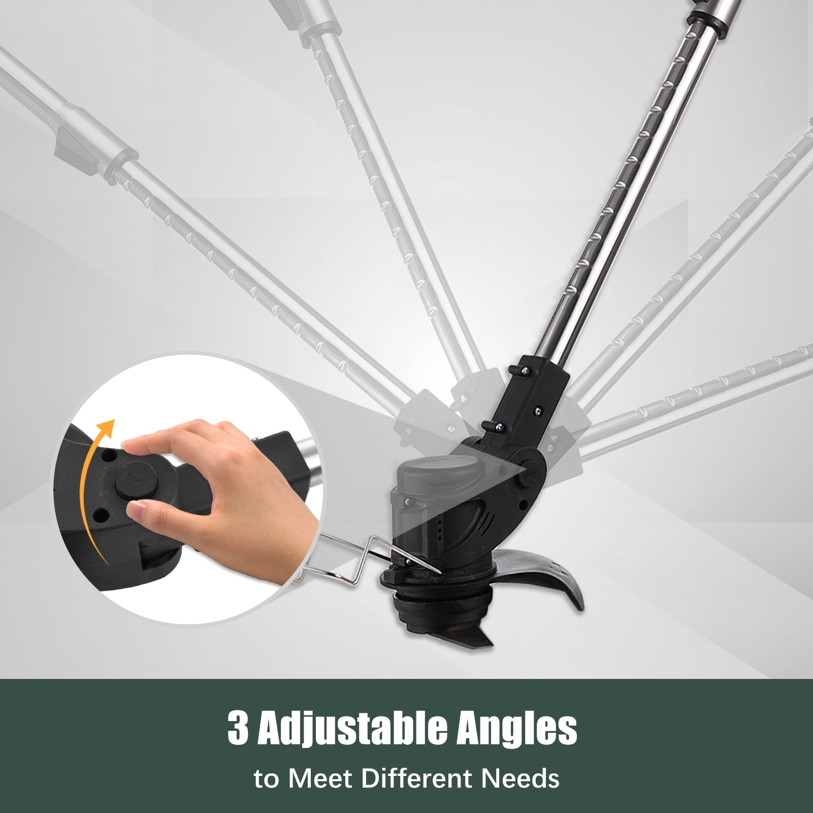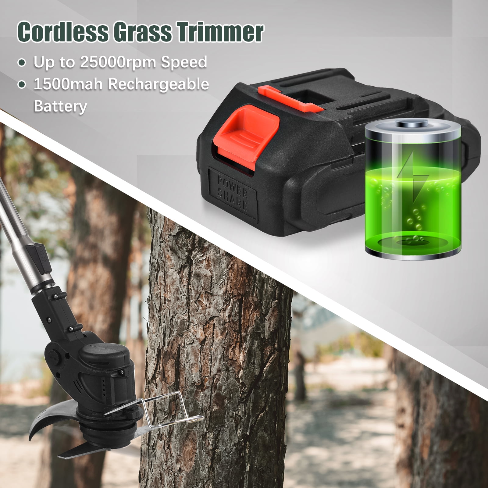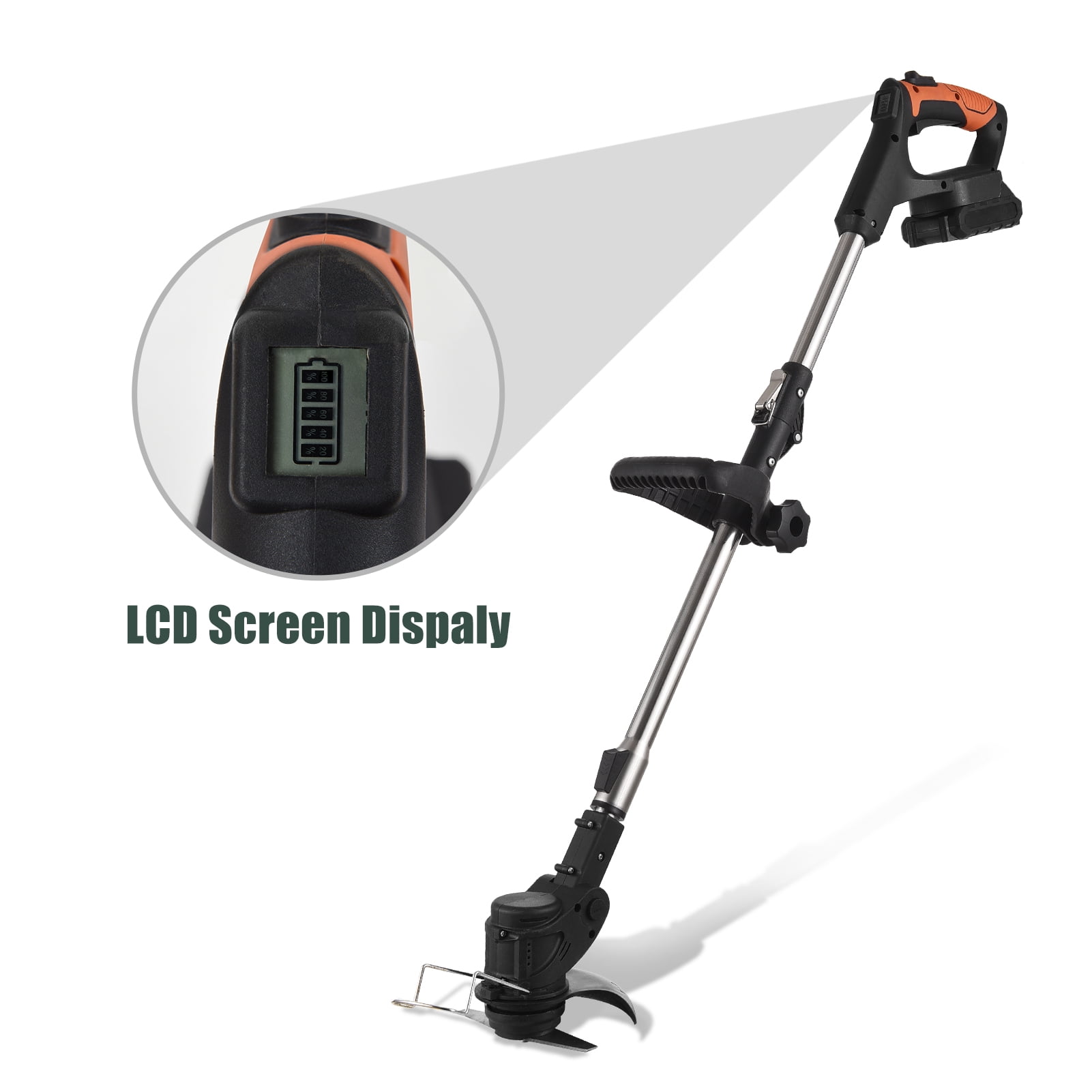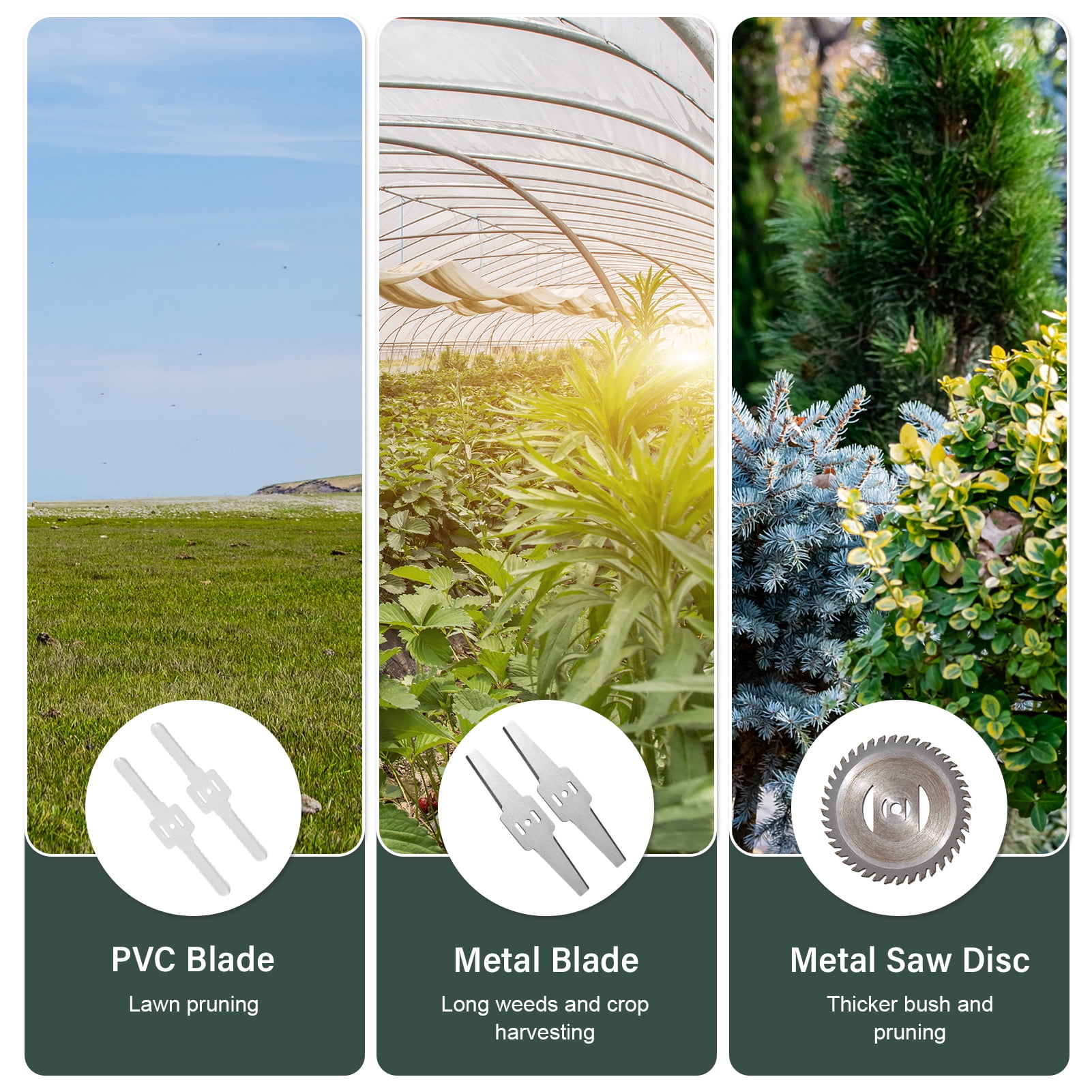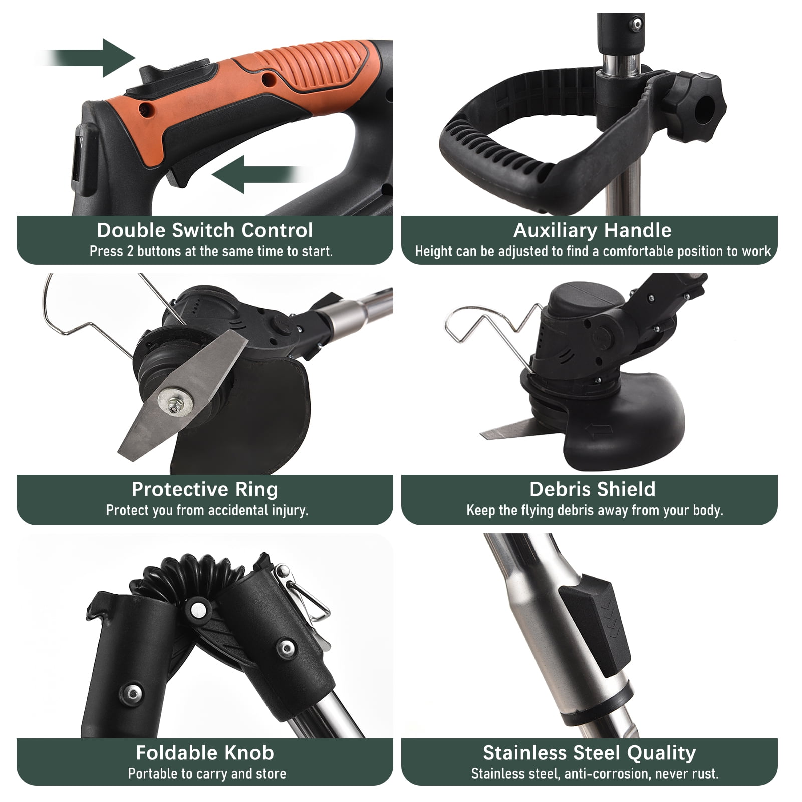 Dcenta Weed Wacker Cordless Weed Eater,12V Edger Lawn Tool Lightweight Metal Cutting Blade Lawn Edger for Garden and Yard Bush Mowing Cordless design to avoid messy cables Powerful motor of 25000 RPM Super-sharp blades for breaking through tall grass and weeds Adjustable telescopic pole (26.5cm/10.4inches) 3 adjustable angles for the trimmer head Equipped with a 4000mah rechargeable battery Safer, more environmentally friendly, and lighter than gas tandem trimmers Lawn edger to create clean and sharp edges Comes with 2 kinds of high-efficiency blades: metal blade and saw disc Safety trigger design with 2 buttons Anti-collision metal protection frame to prevent the lawn mower from colliding Voltage of 12V and power of 300W Baffle to act as a debris shield