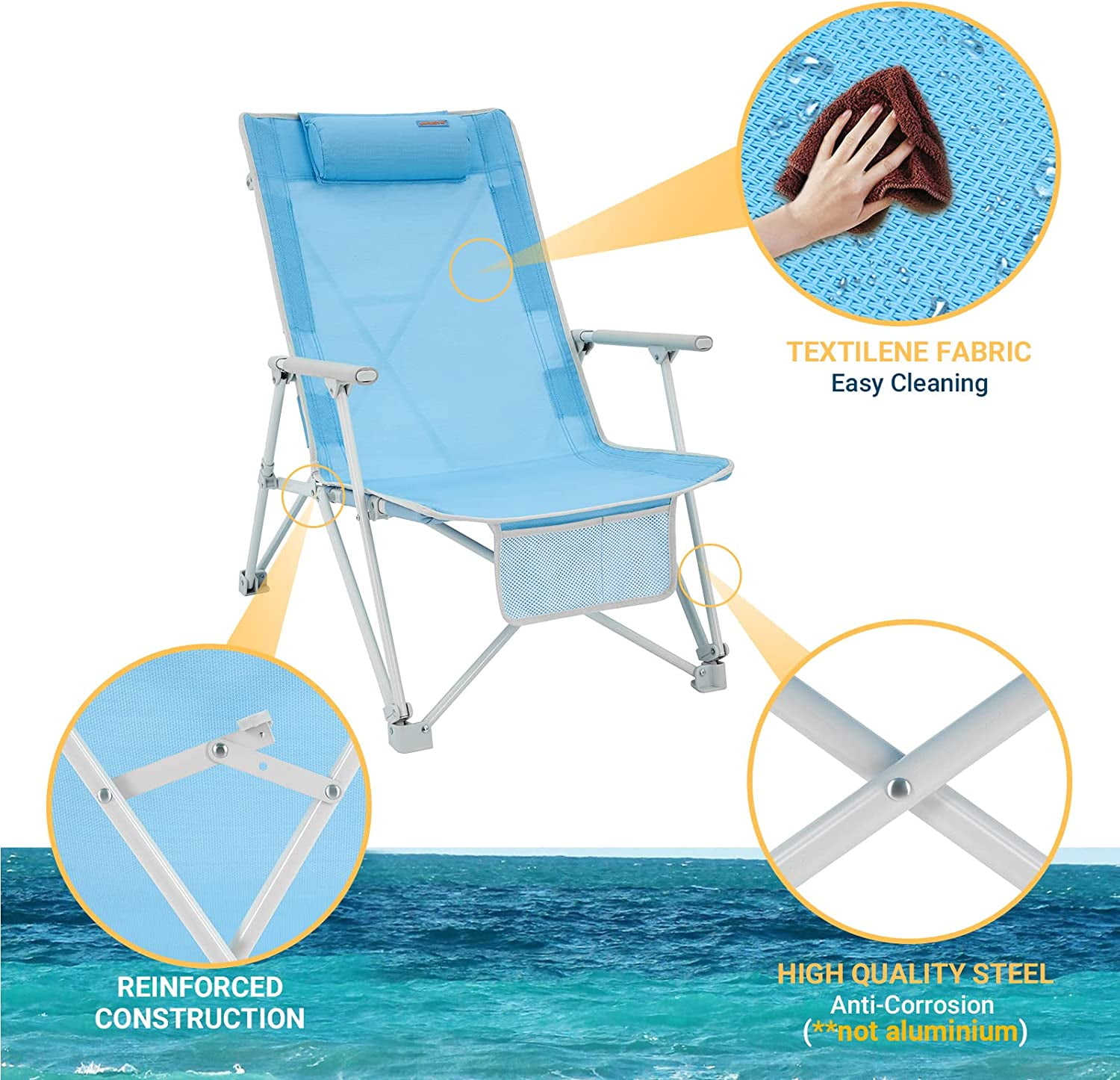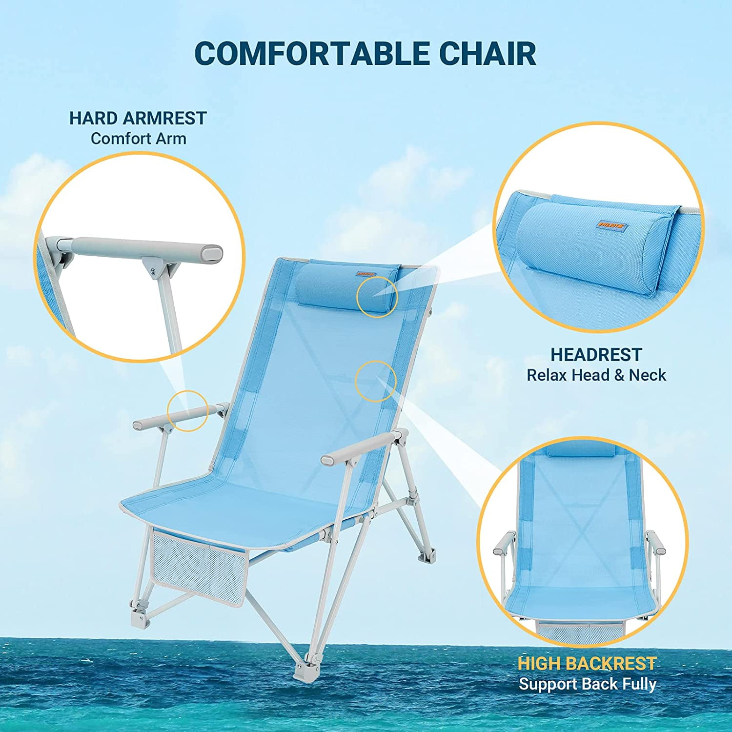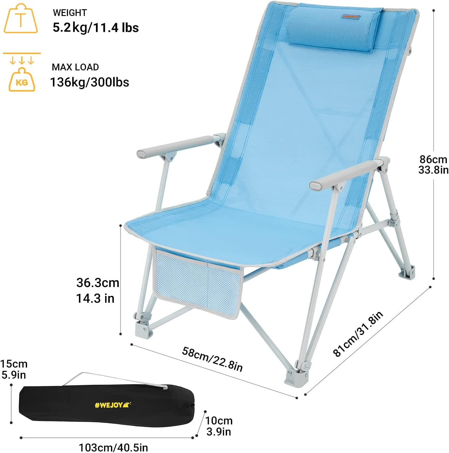 DIFFERENCE OF 2 VERSION: the thickness of the steel pipe is different, the original one is a little thinner steel pipe, max load: 265 LBS, the new version support 265 LBS, more suitable for big guys. UPGRADE HEIGHT & BACKREST- Extend the back and seat height of low beach chairs to meet your needs well, seat height 14.3 in, higher than normal low beach chair(8 in), lower than normal high beach chair (15.7 in), make you comfier. CONVENIENT & COMFORTABLE – Low folding beach chair padded armrest to offer you a soft touch. Headrest supports your head and neck, giving you outdoor even comfort. Two pockets keep your stuffs like sunglasses, phone within reach. FOLDABLE & PORTABLE – Camp low chair open size: 22.8×31.8×33.8inch, seat heigt: 14.3 inch, fold size: 3.9×5.9×40.5inch, capacity :265lbs, weights: 11.4 lbs. fold up beach chair come with a carry bag, convenient to transport and storage the sand beach chair. DURABLE & STURDY- The 600G Textilene fabric of low profile chair is easy cleanning but uneasy water drop through, meanwhile has tear strength and seam solidity. With thick steel(Q210) for you long time use. Extra connect of back for your stable sitting on beach chair with head rest. EASY TO USE & CARRY – No tools required, you can setup the high back beach chair within seconds, concert lawn chairs are ideal for your outdoor activities.