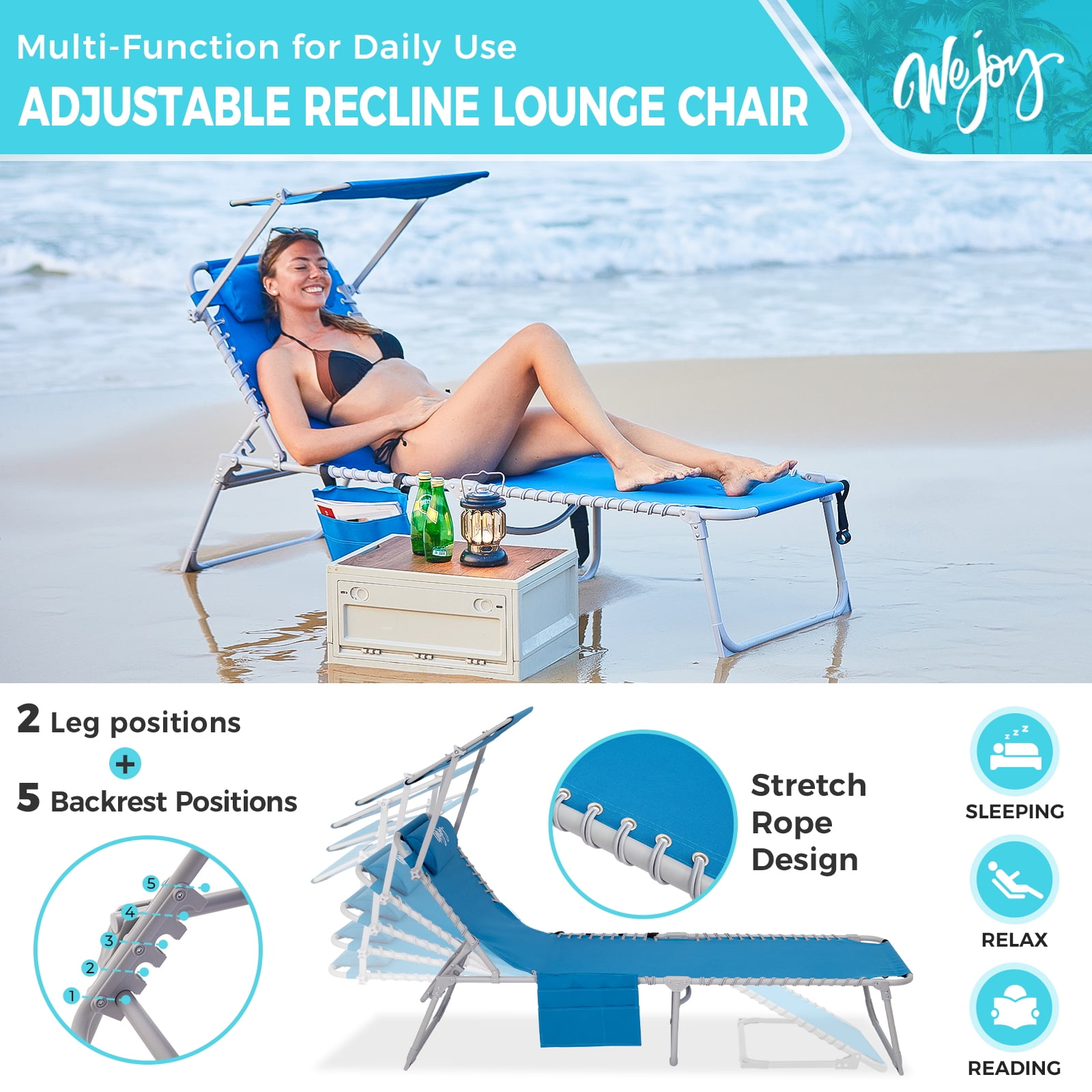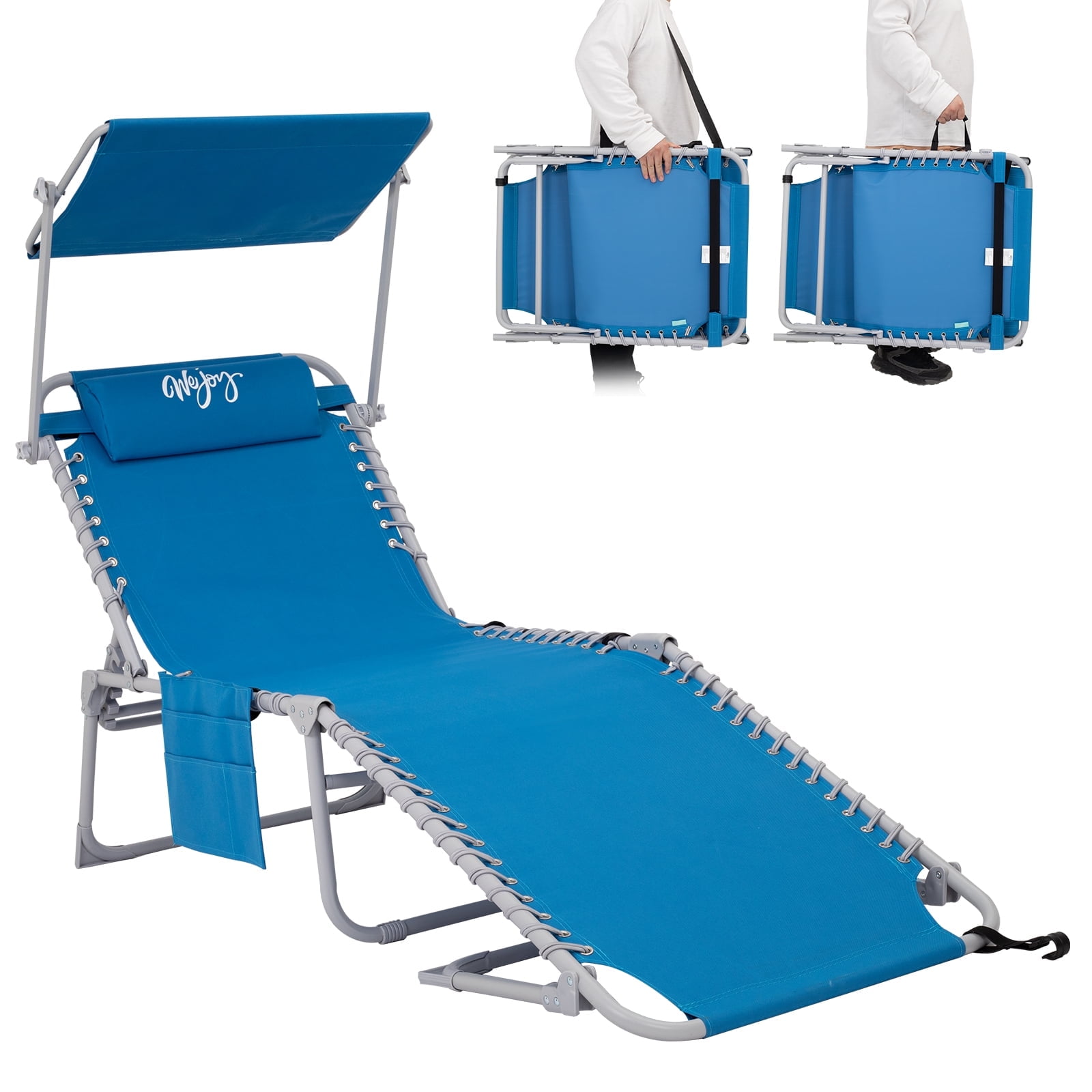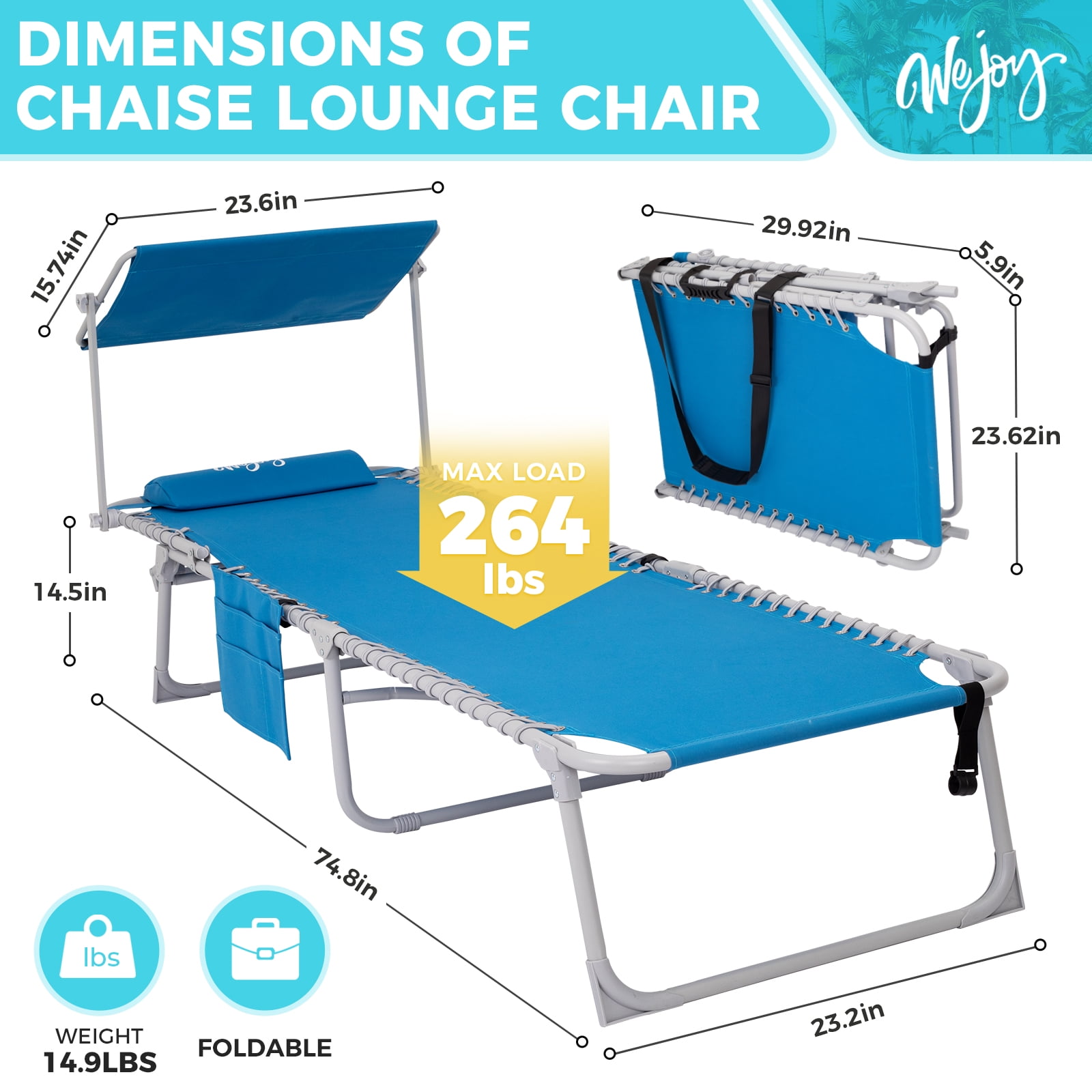 【5-Position Adjustable Chaise Lounge】The back of this beach lounge chair can be adjusted to 5 fixed positions. The chaise lounge chair leg supports can be placed in two different ways. Whether you are sunbathing, sleeping, eating and drinking, or just chatting with friends, this sun lounge chair can meet your leisure needs easily. 【Comfortable Design】The 360°canopy sunshade provides shade over your head, protecting your eyes and allowing you to read while enjoying sunbathing. This WEJOY foldable chaise recliner for adults is equipped with a removable pillow and the 3-in-1 pocket is more convenient for you. 【Portable & Foldable】No tools are required, the patio lounge chair is ready to use with just one step: open and lock the backrest at the angle you like. The unfolded size of this lawn chair is 74.8×23.2×13.3/14.5 inches, and the packed size is 29.92×5.9×23.62 inches. This 14.9 lbs lightweight outdoor lawn chair is effortless to take outside. 【Durable & Stable】The cloth is made of wear-resistant and durable fabric, which can bear weight up to 264 lbs. The durable, rust-resistant lightweight Q195 Steel pipe frame ensures durability over a long period. 【Customer Guarantee】This lounge chair comes with a 12-month warranty and a 100% satisfaction guarantee. If you have any questions, please contact us directly.